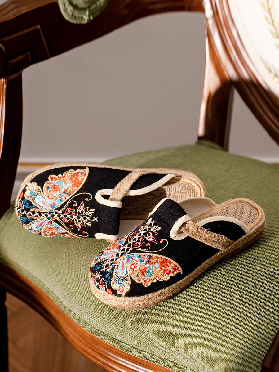 Chinelo feminino de verão em lona com bordado de borboletas