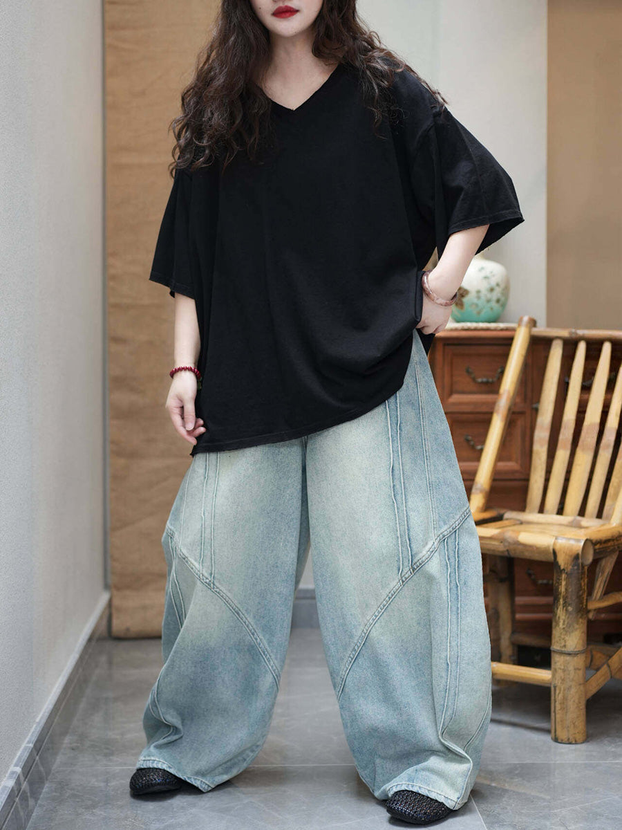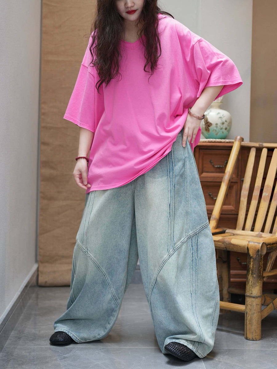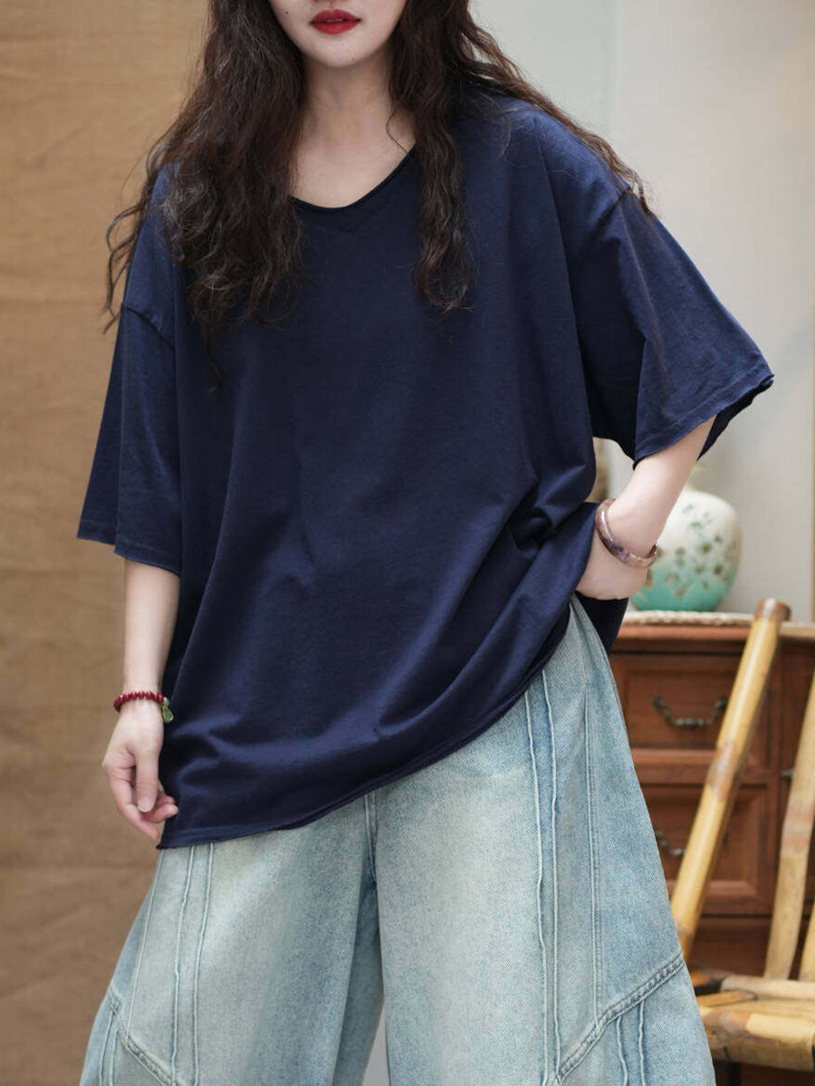 Camiseta feminina casual de verão, cor lisa, gola redonda