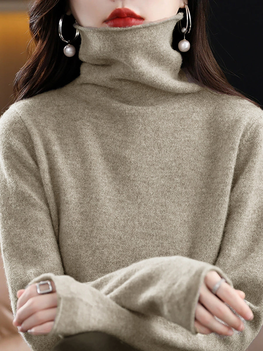 Suéter feminino casual de outono em lã tricotada com gola alta