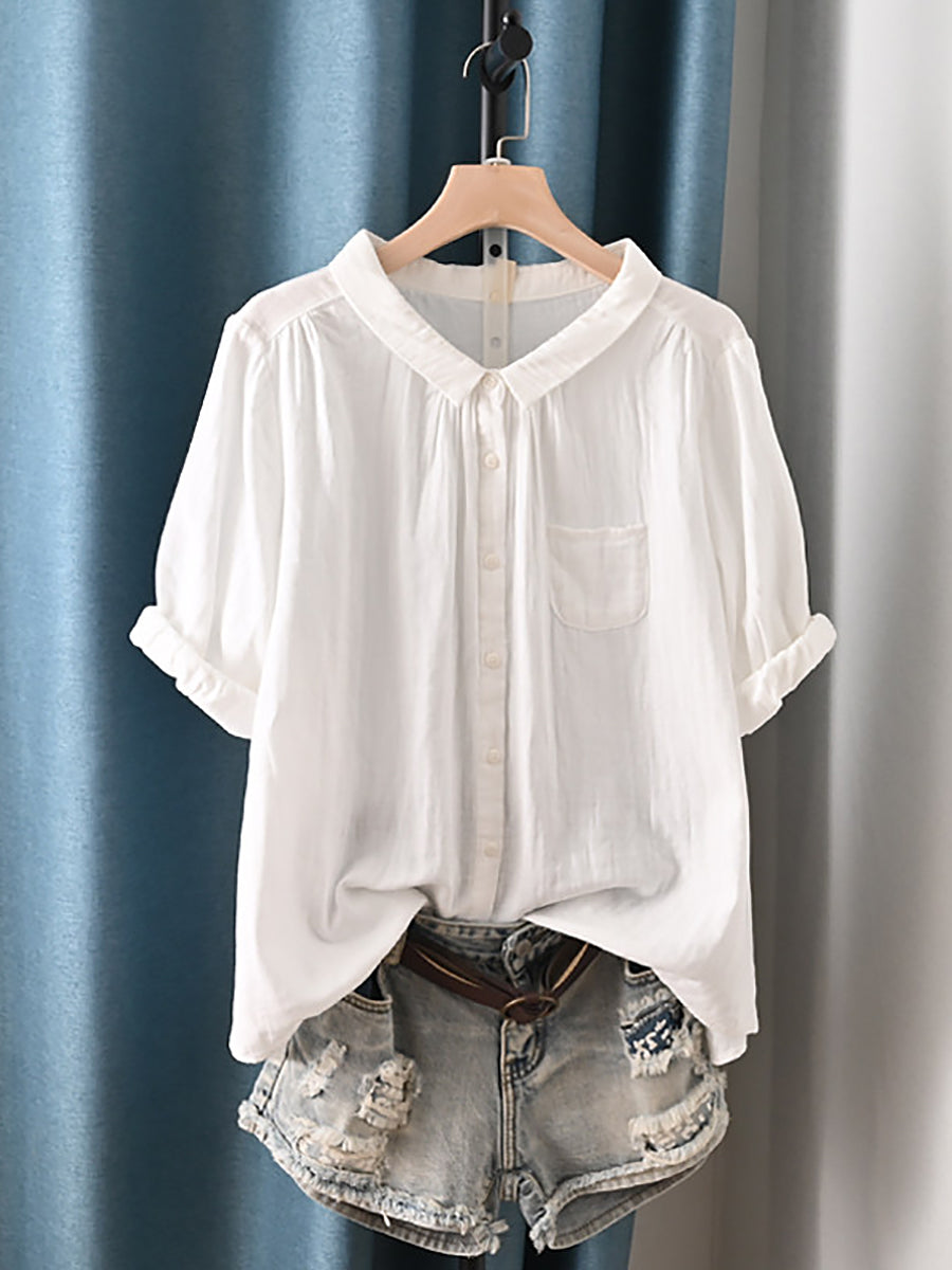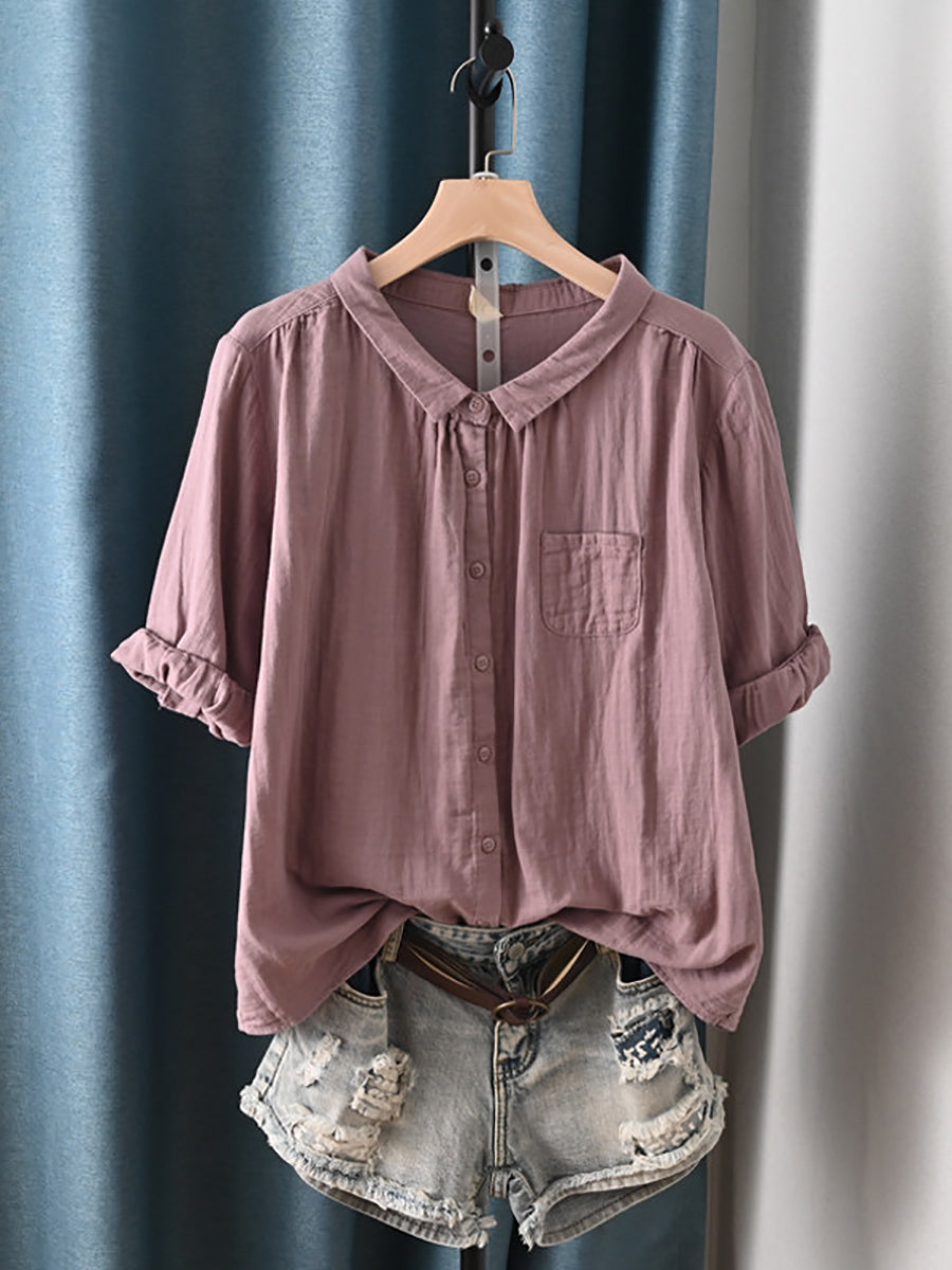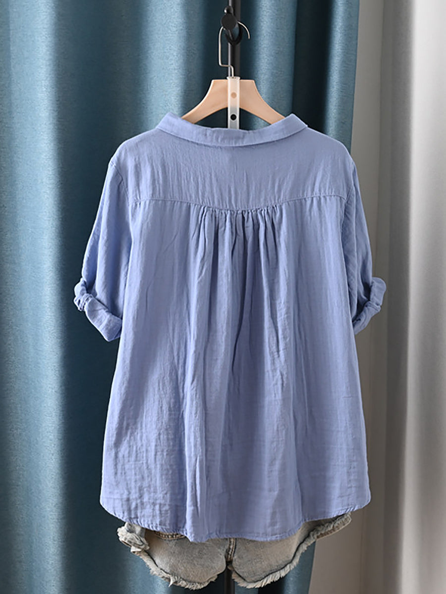 Camisa feminina de verão com gola dobrável estilo artístico, 100% algodão.