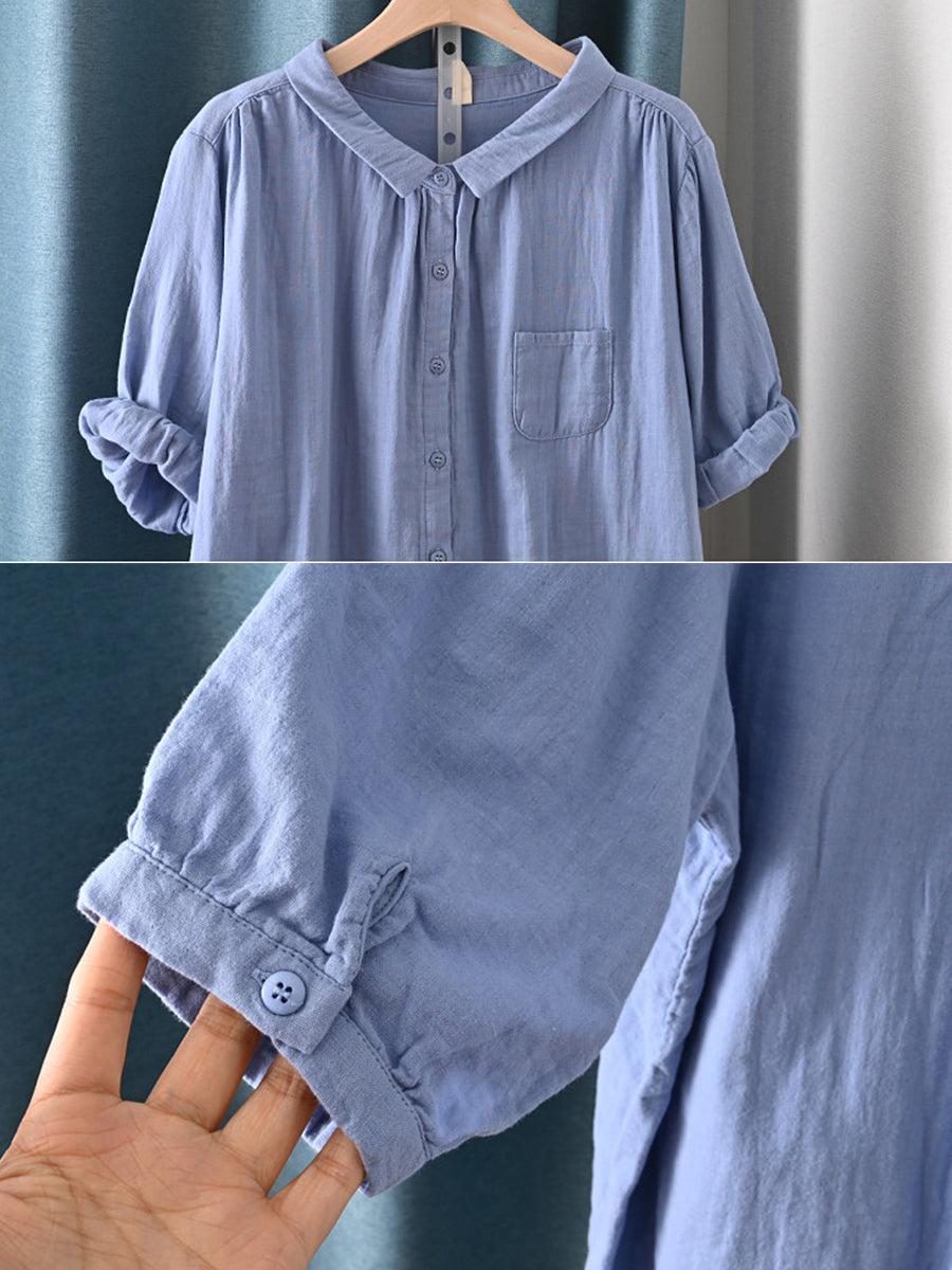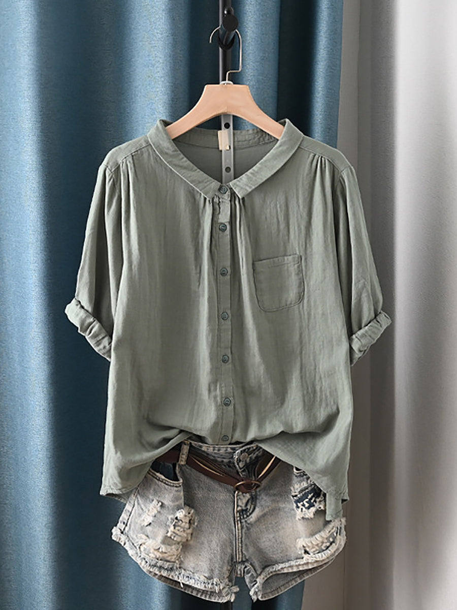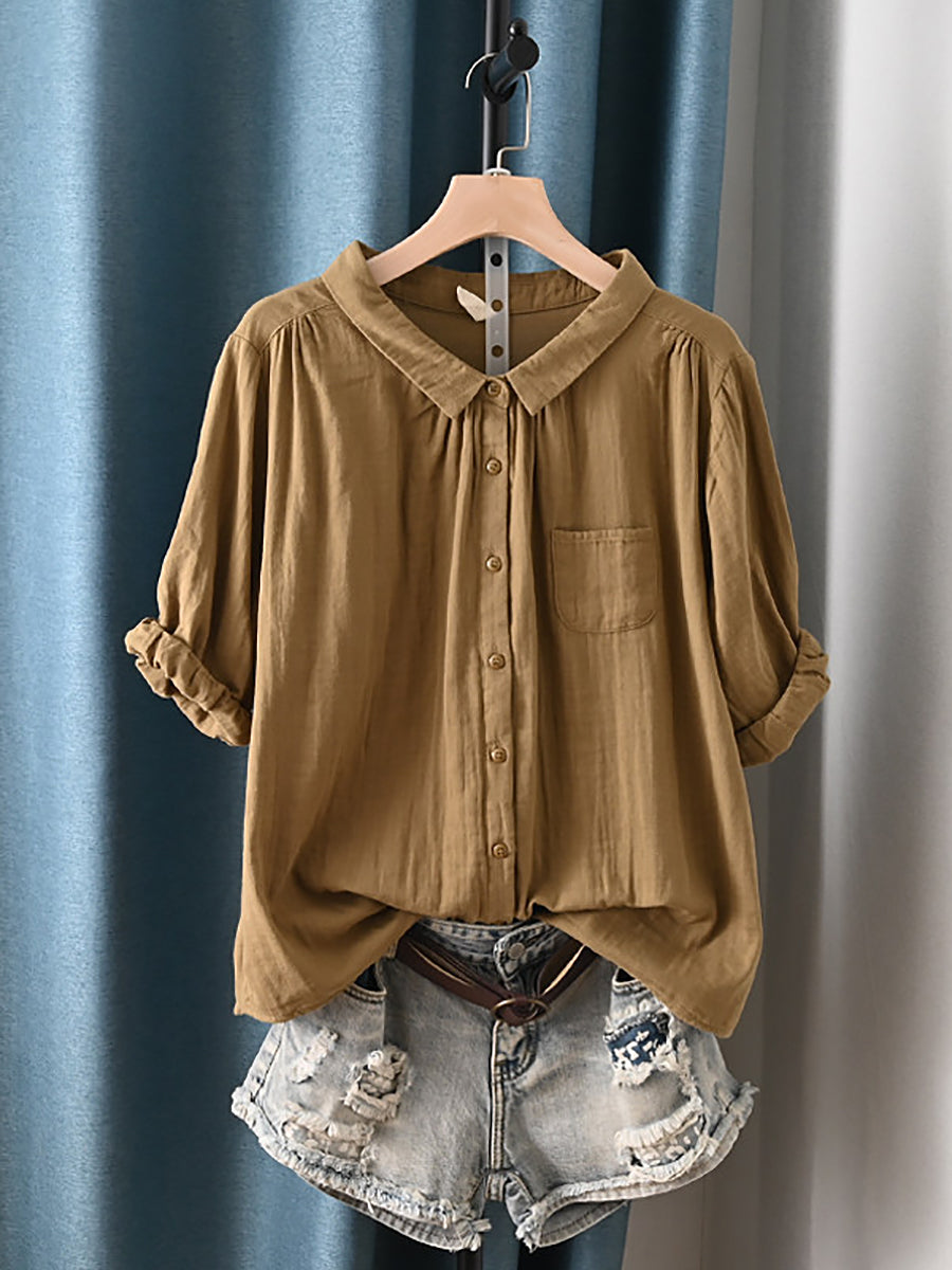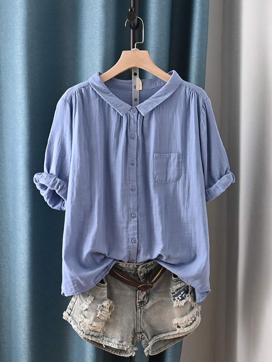 Camisa feminina de verão com gola dobrável estilo artístico, 100% algodão.