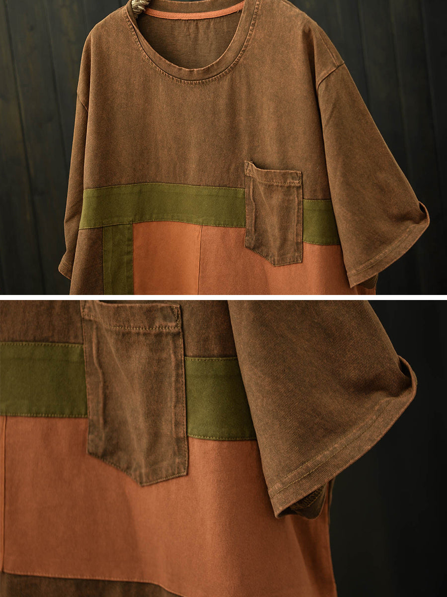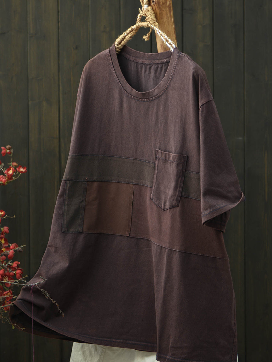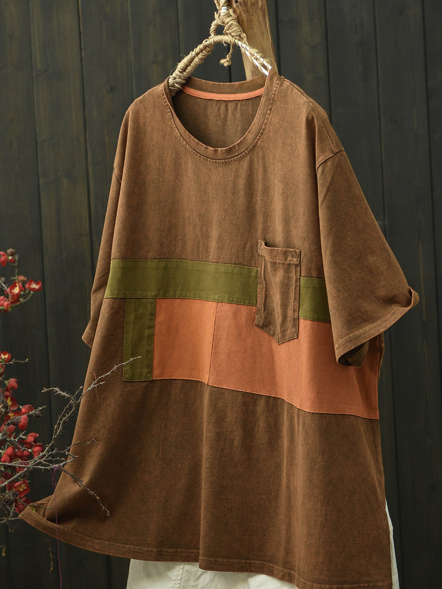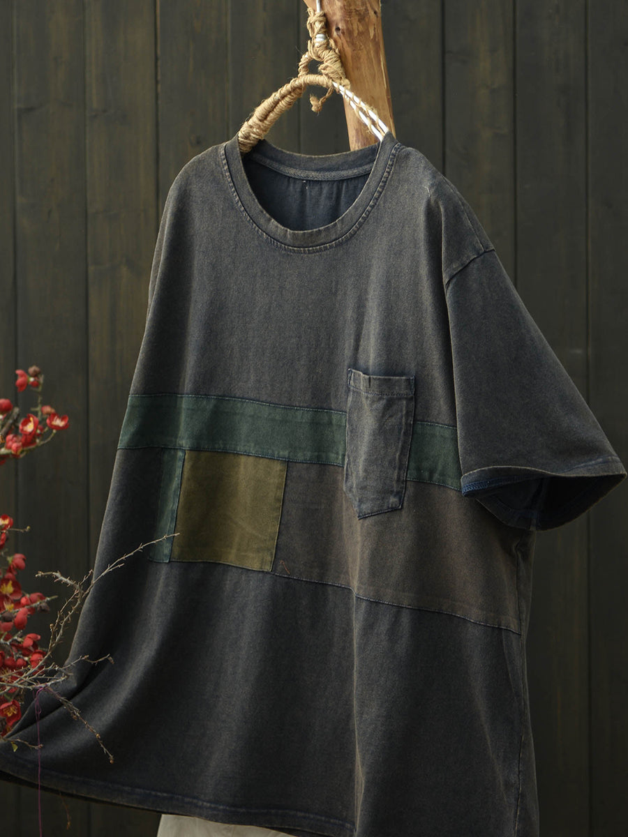 Camiseta feminina de algodão com patchwork retrô para o verão