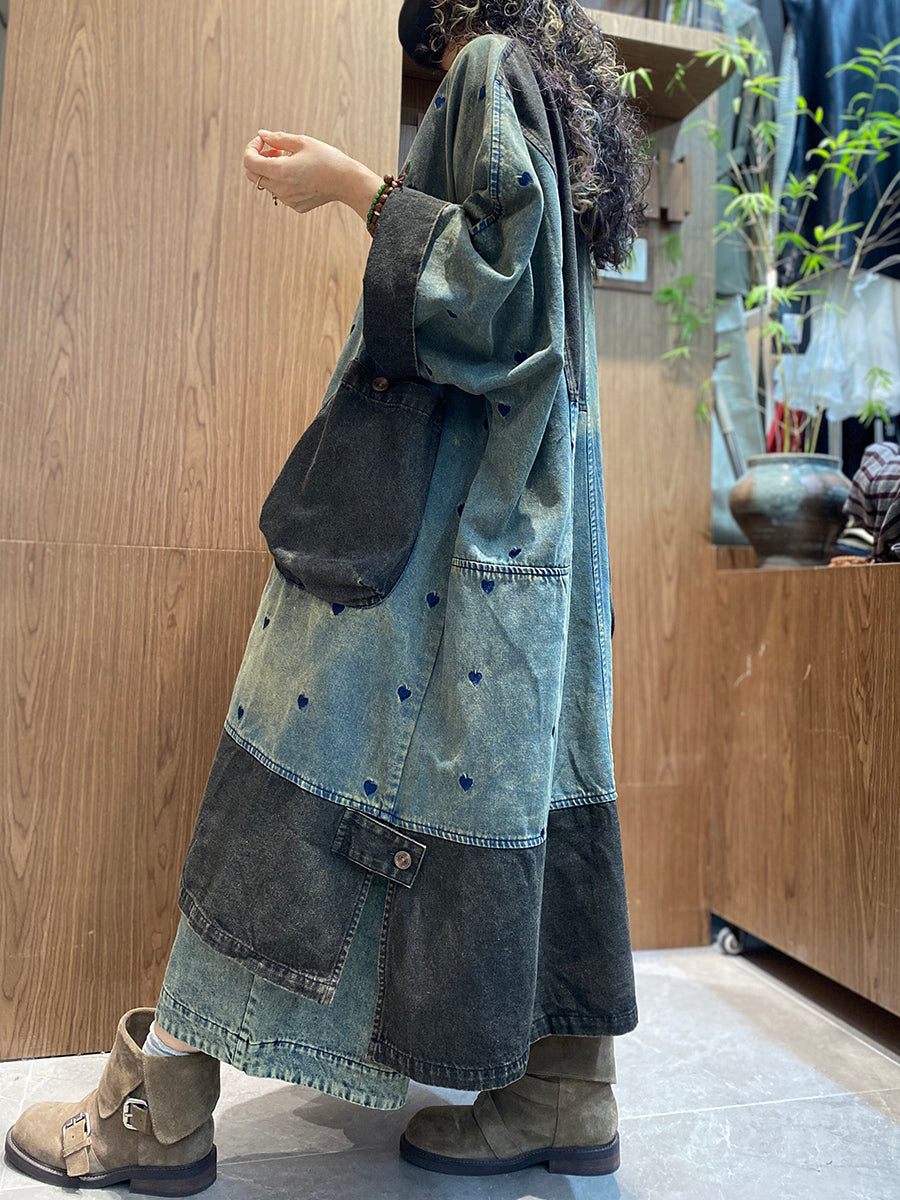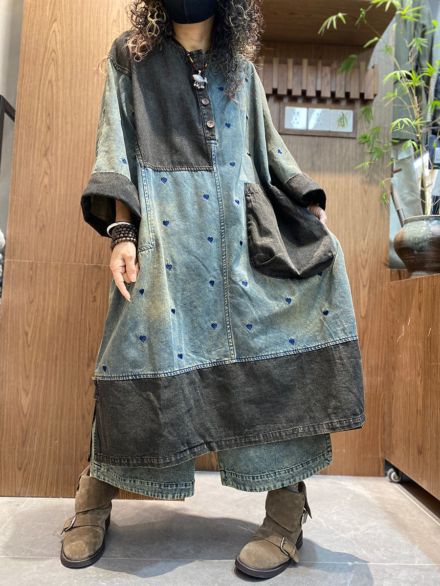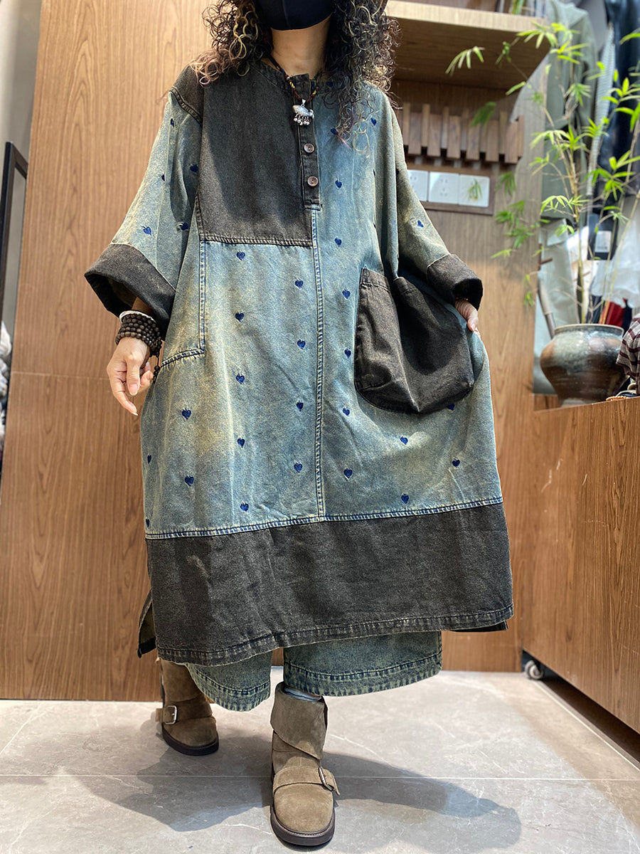 Vestido feminino de verão vintage em jeans com recortes e decote redondo