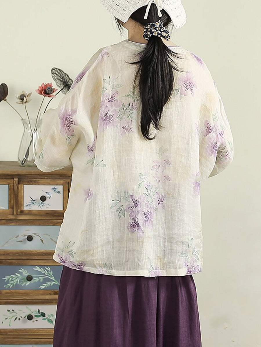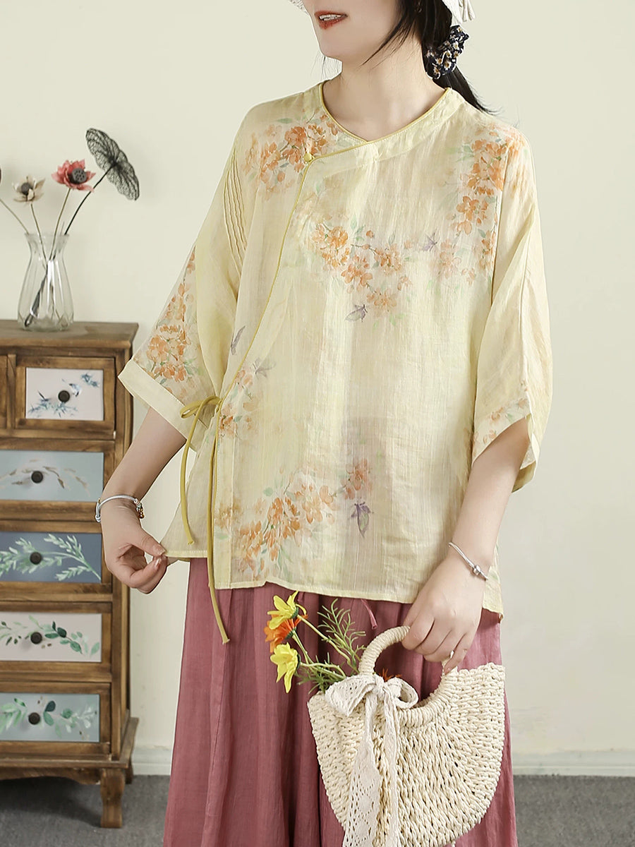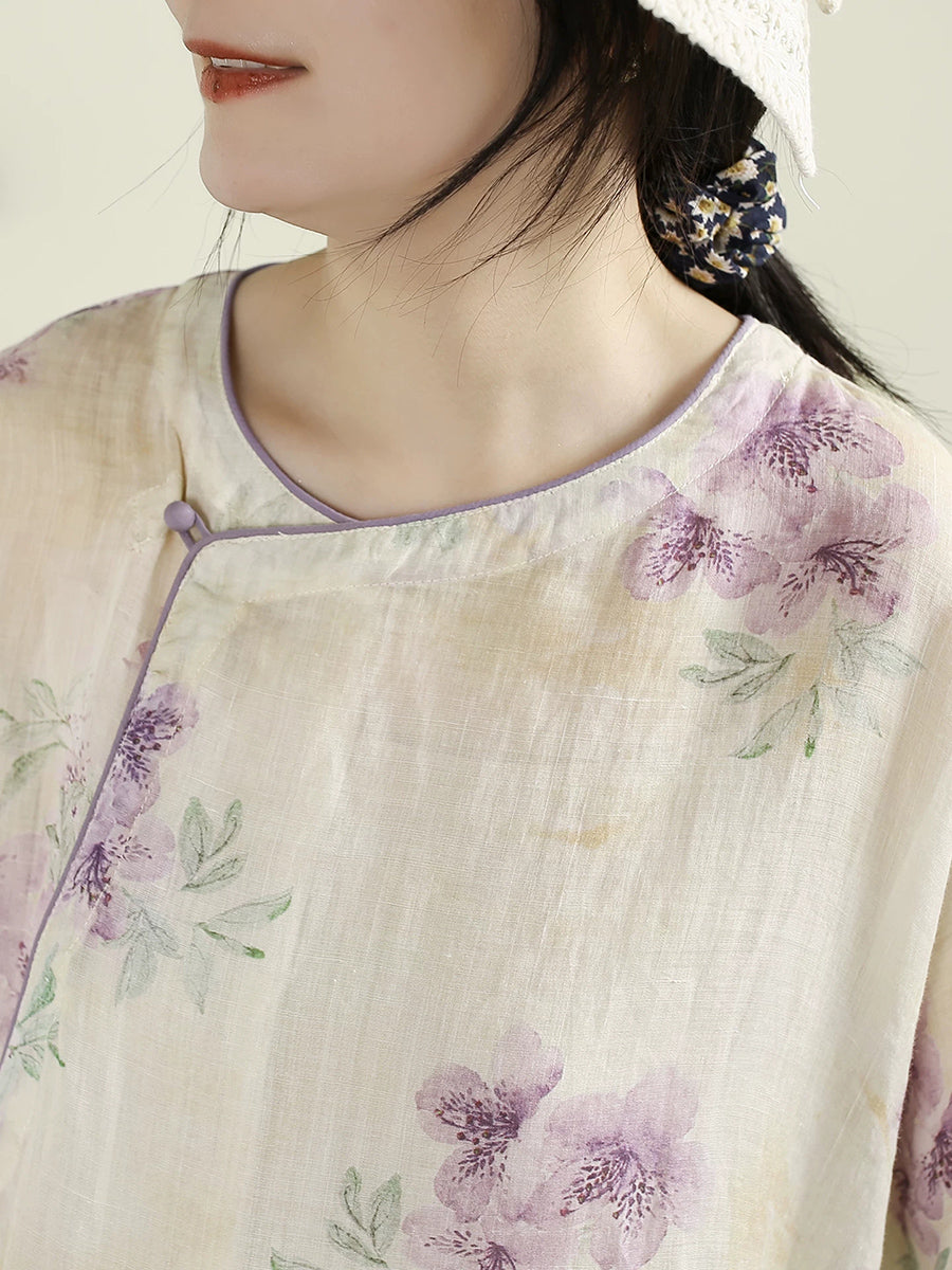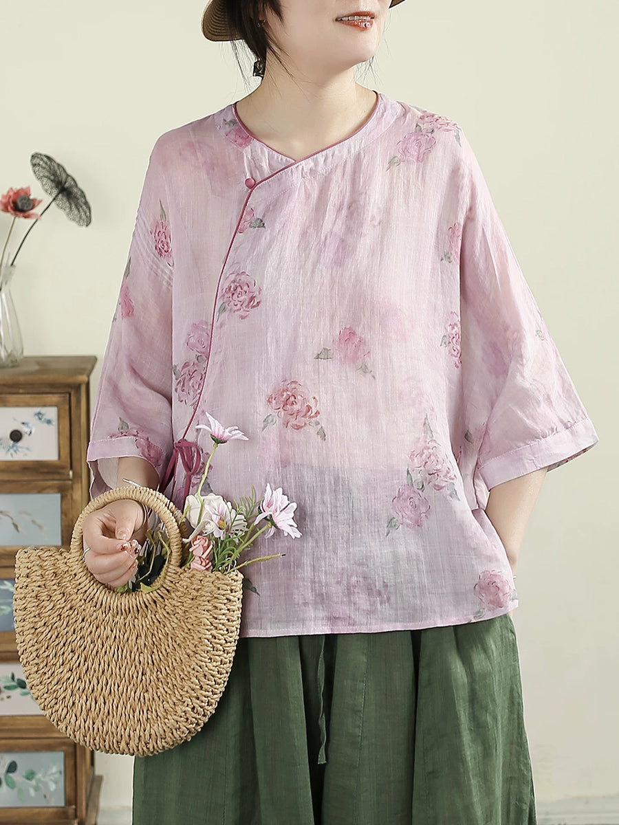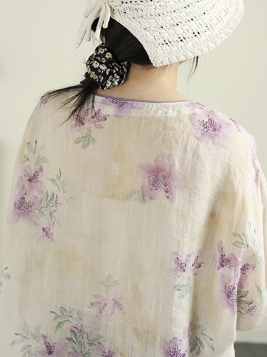Blusa feminina de verão com estampa floral e decote redondo, 100% rami.