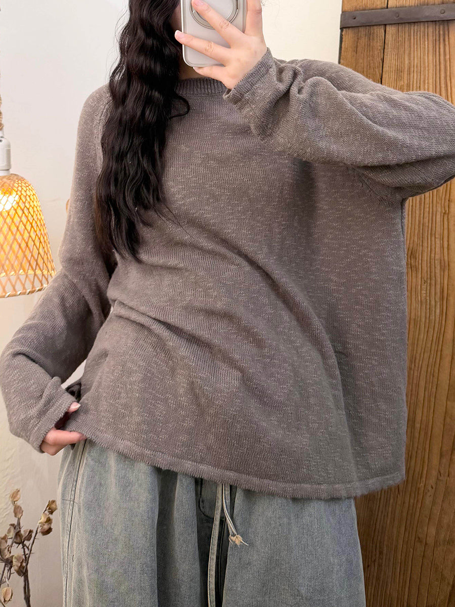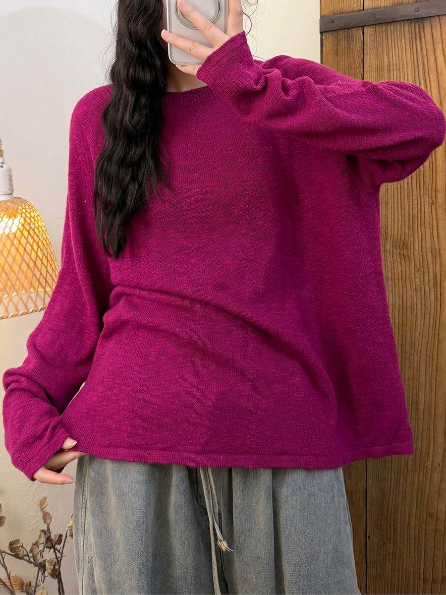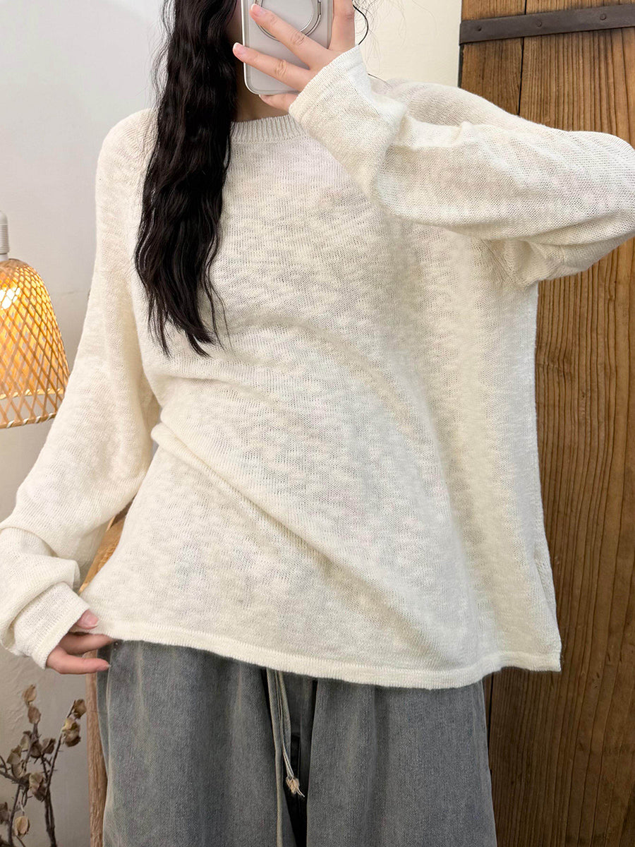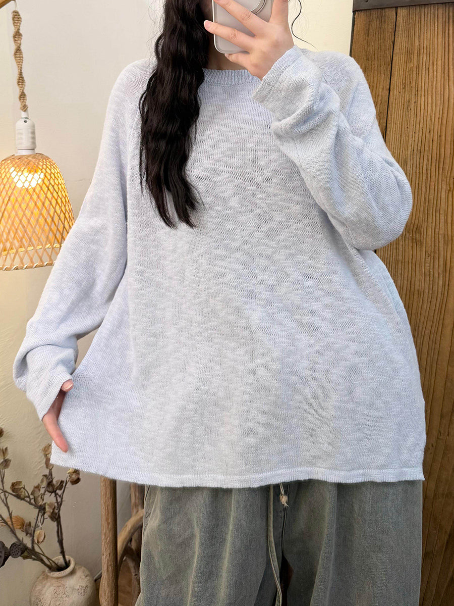 Camisa feminina de malha com gola redonda, cor lisa, estilo casual de primavera.