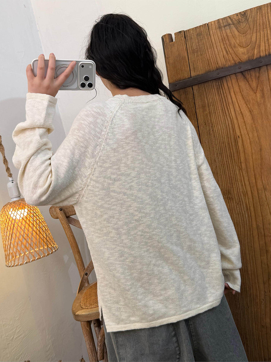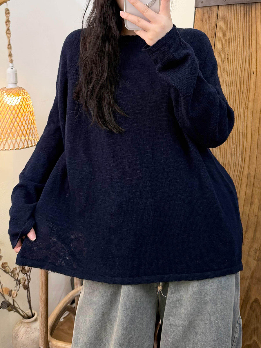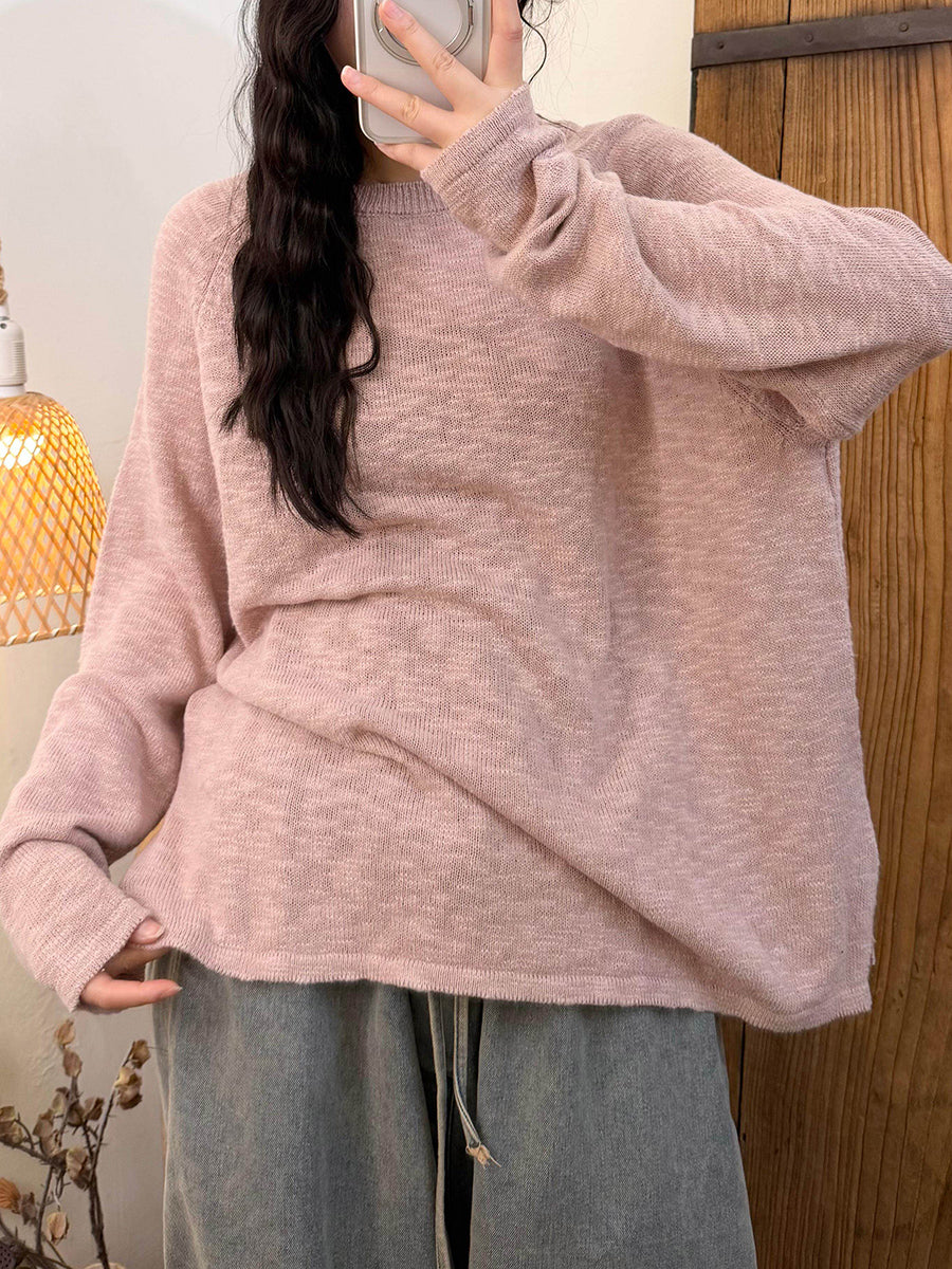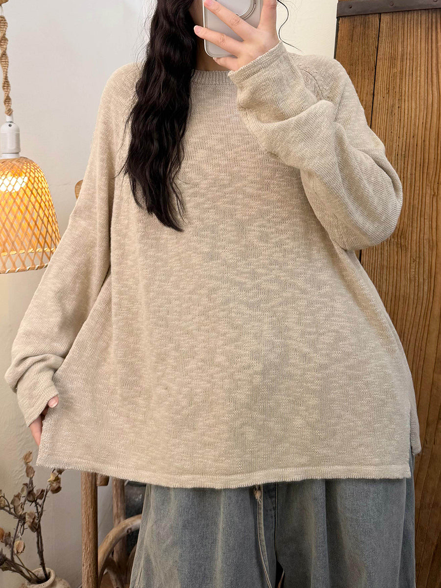 Camisa feminina de malha com gola redonda, cor lisa, estilo casual de primavera.