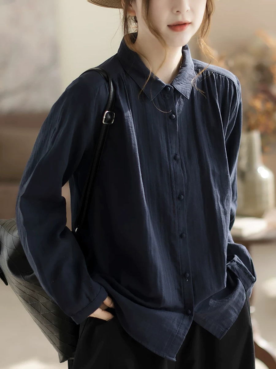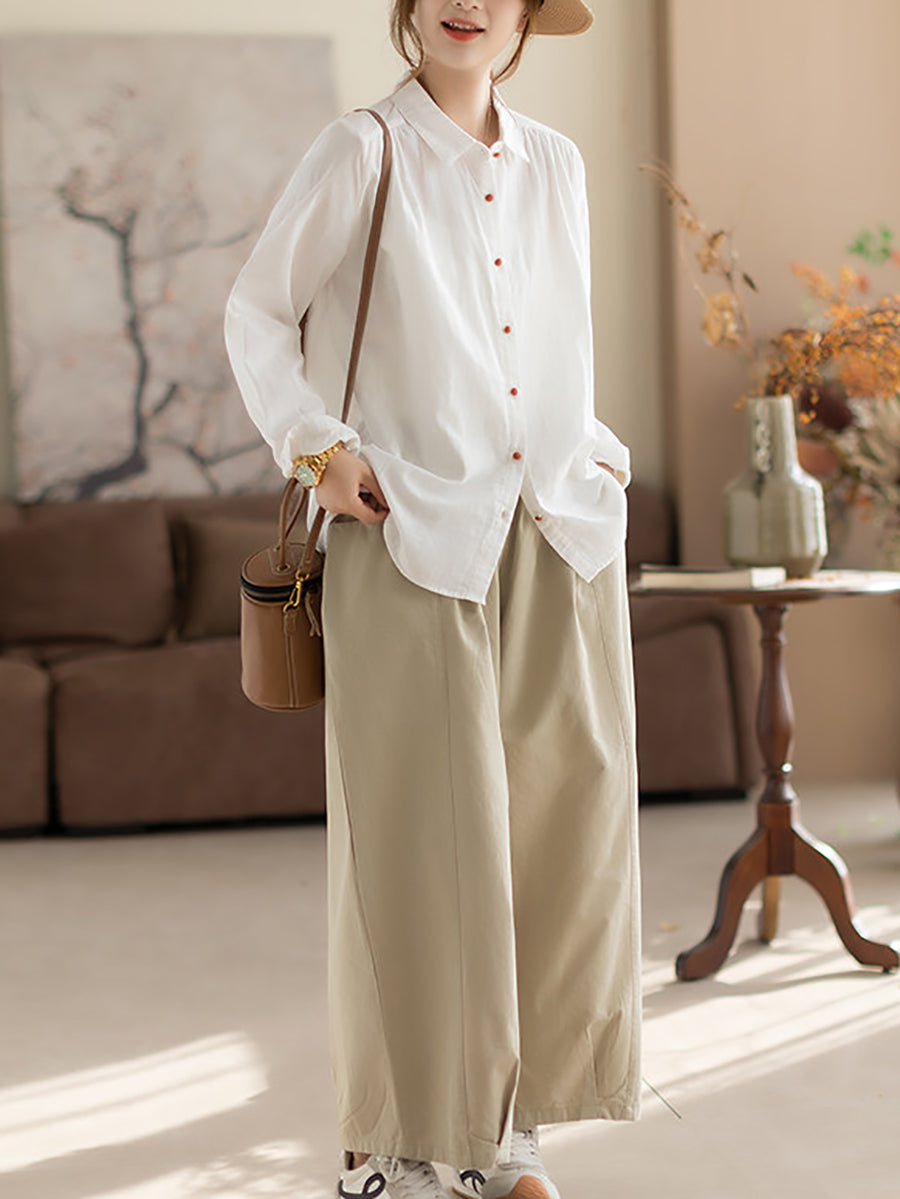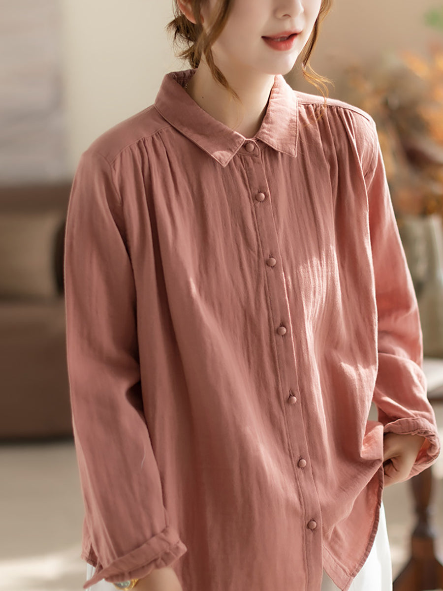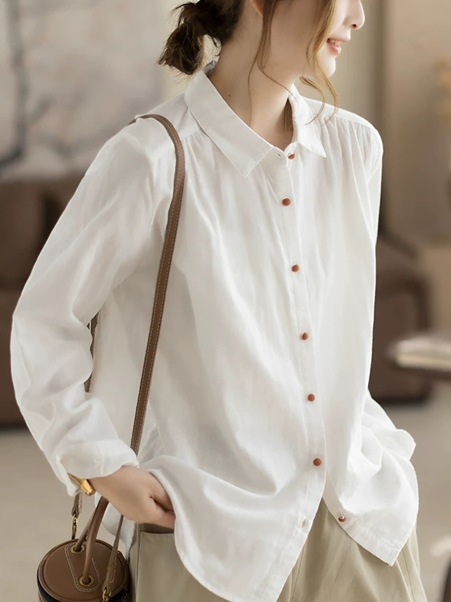 Camisa feminina de primavera com estampa artística, cor lisa, 100% algodão, gola dobrável.