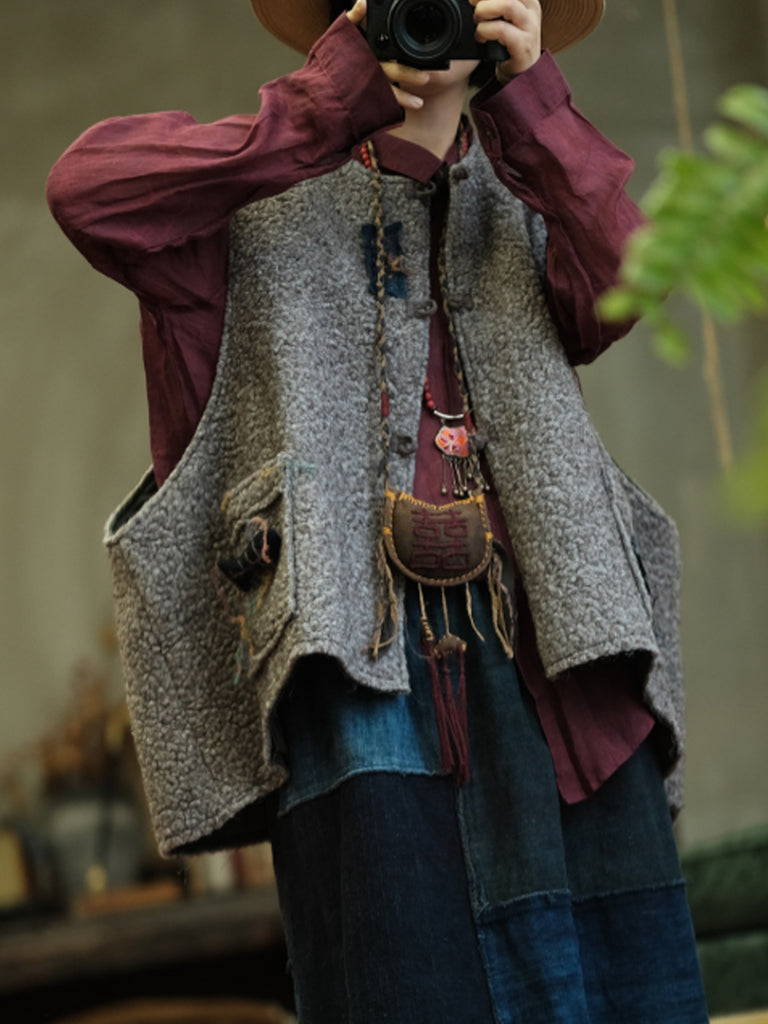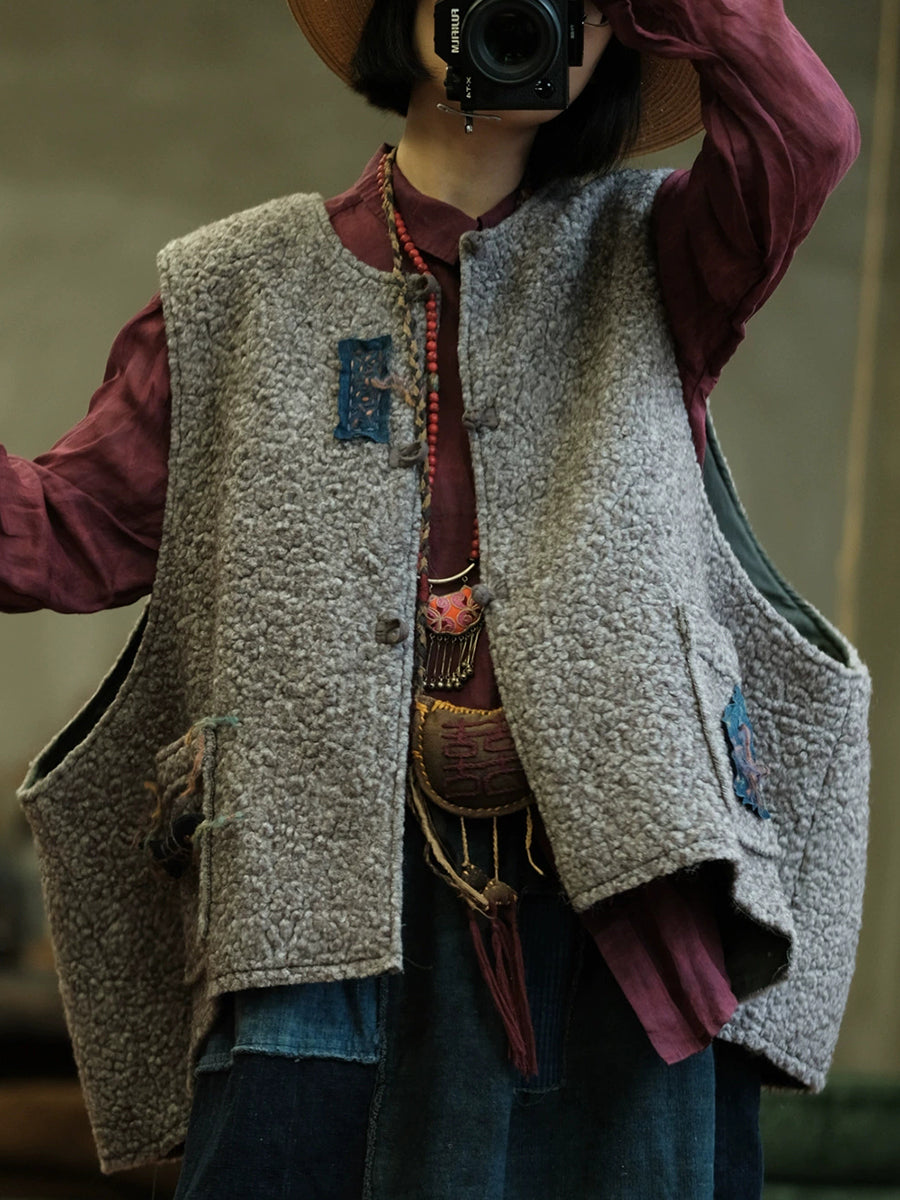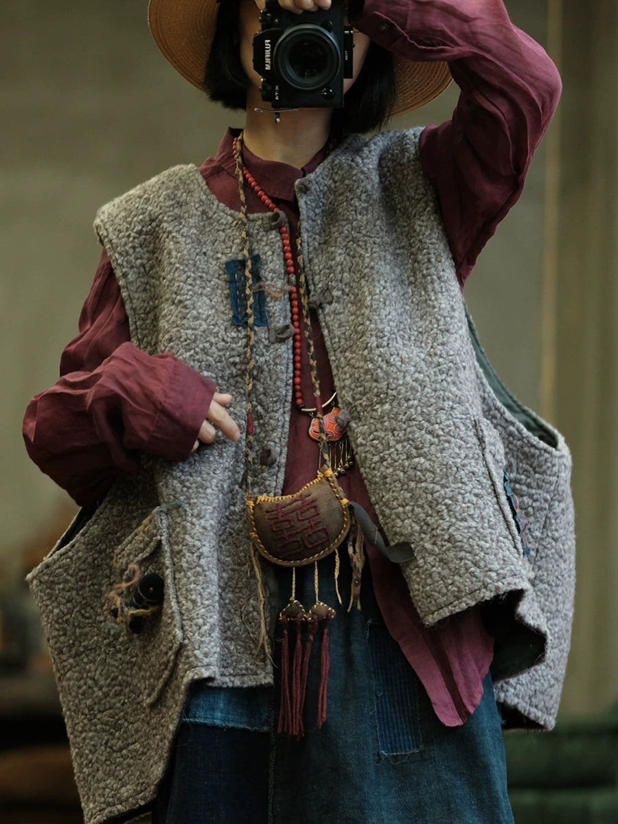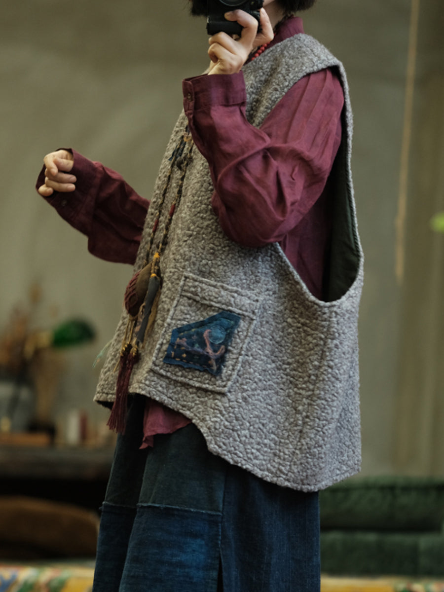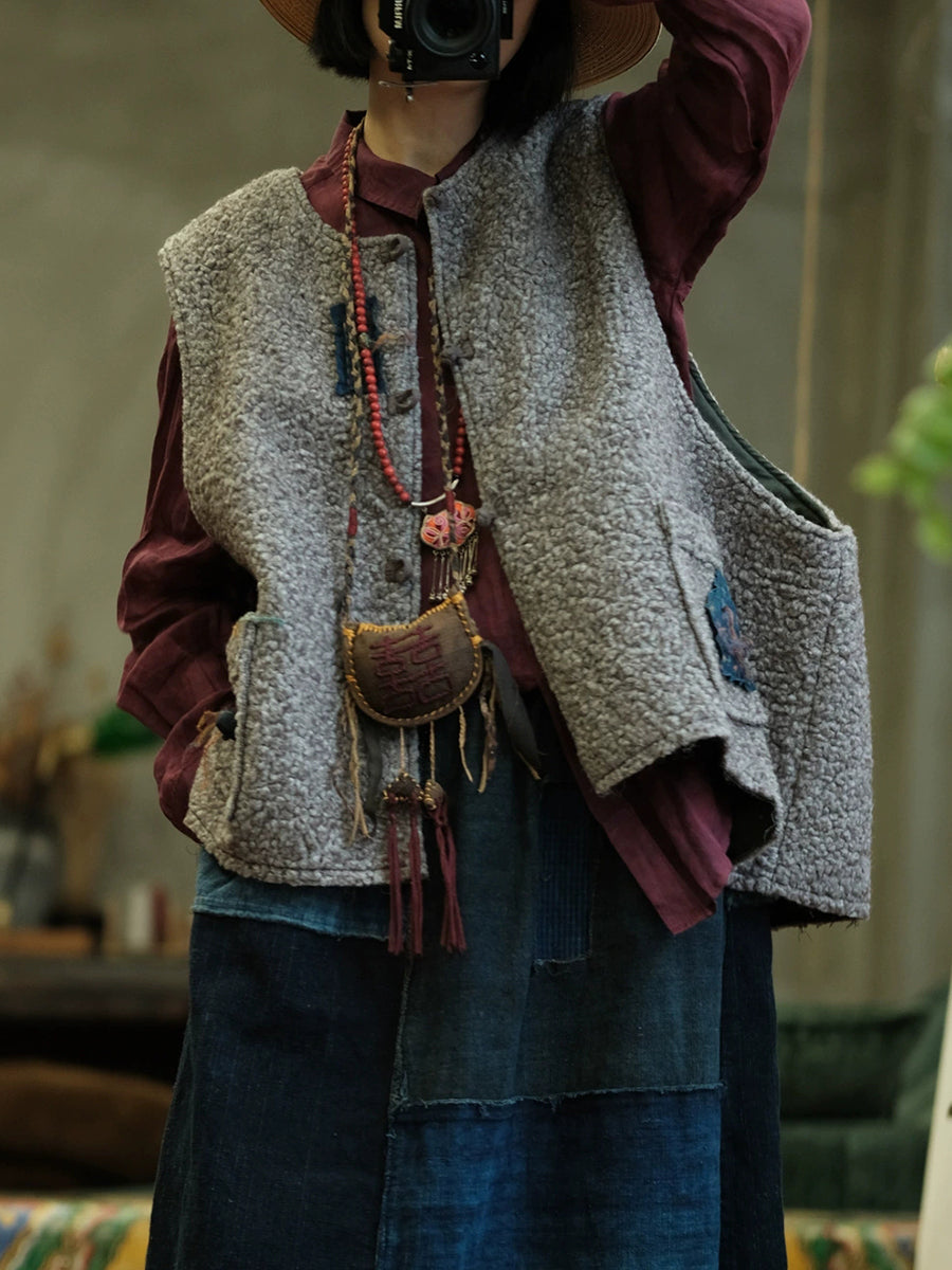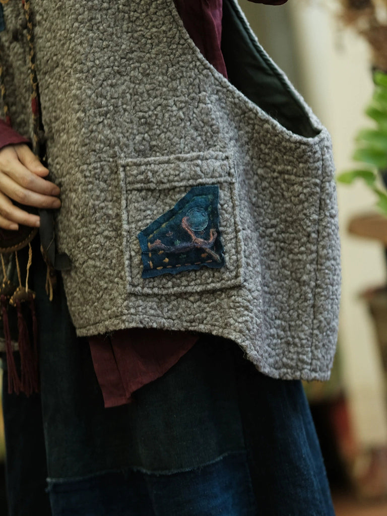 Colete feminino de inverno vintage com patchwork e gola redonda em fleece.