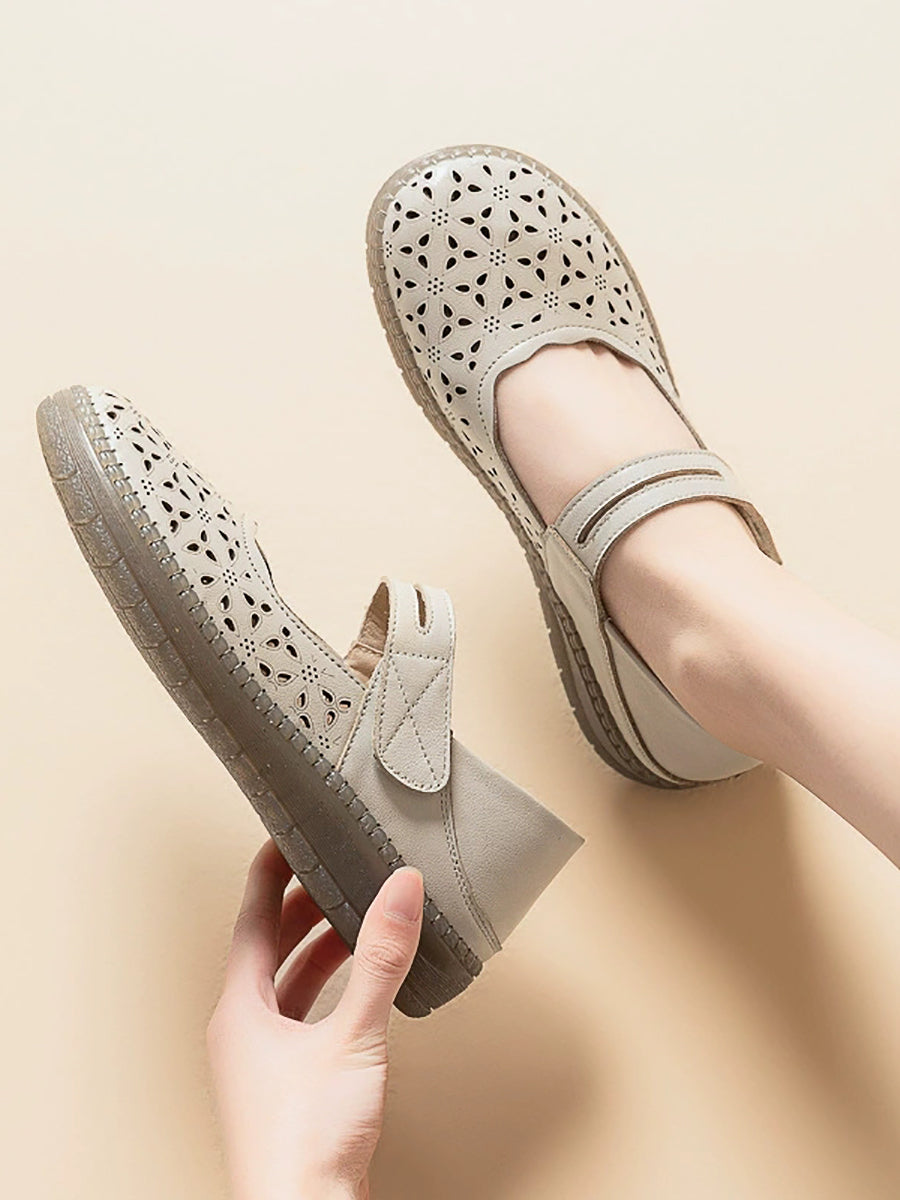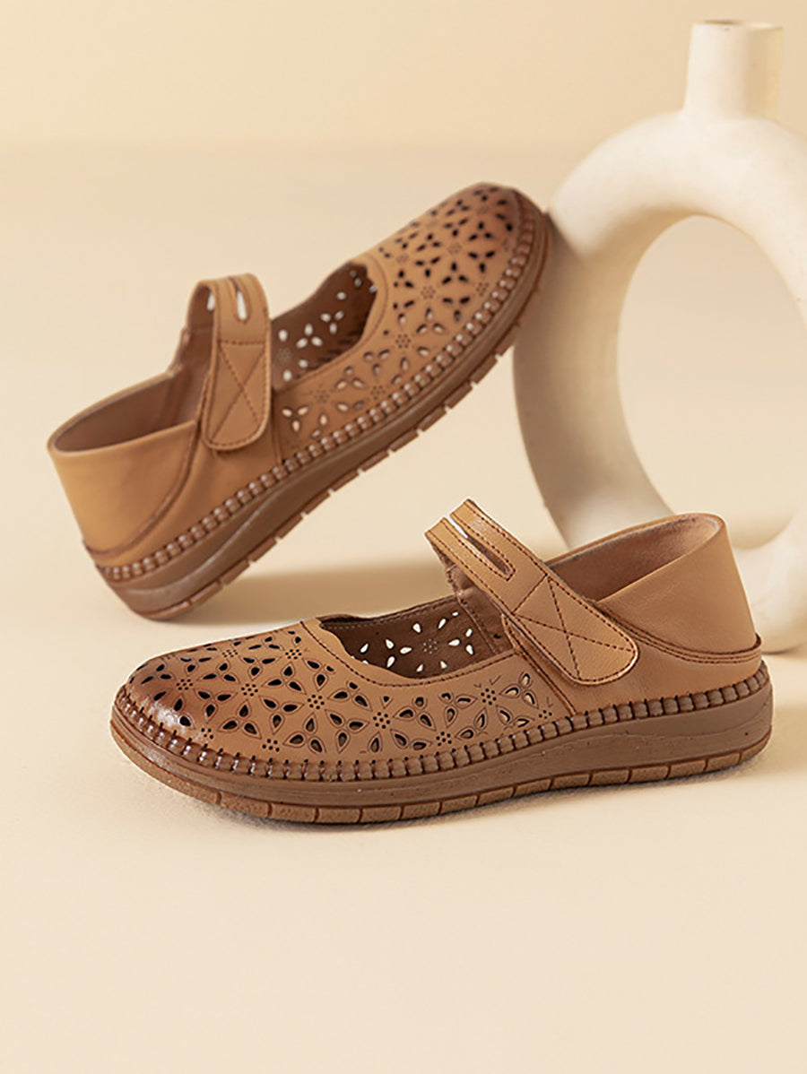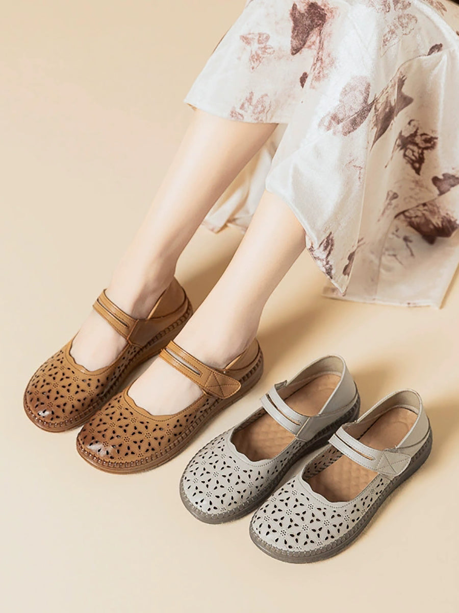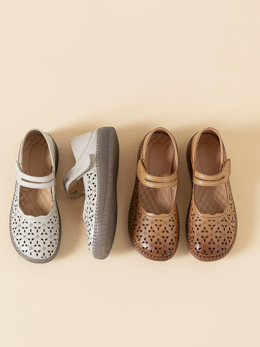 Sapatos femininos vintage de couro genuíno vazados, modelo baixo.