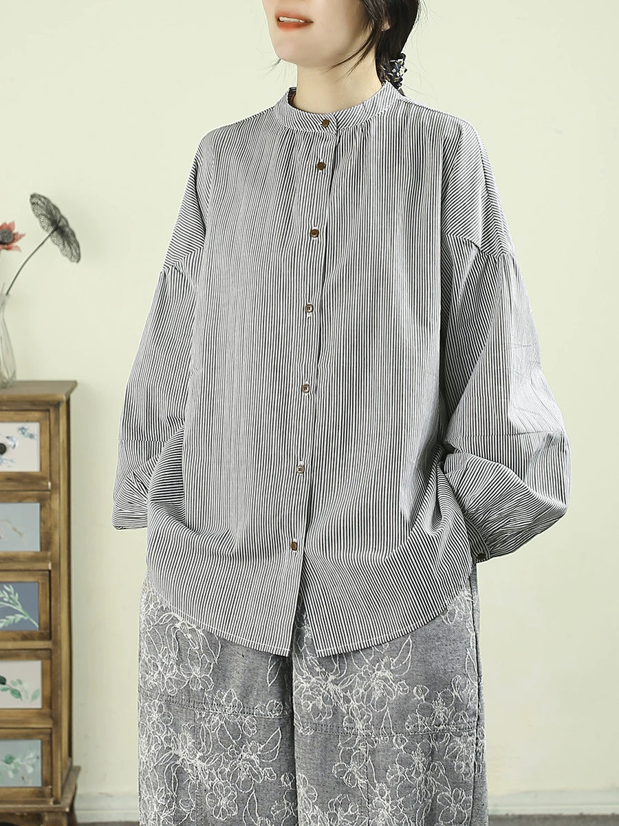 Women Spring Artsy Pure Color 100%Cotton Stand Collar Shirt