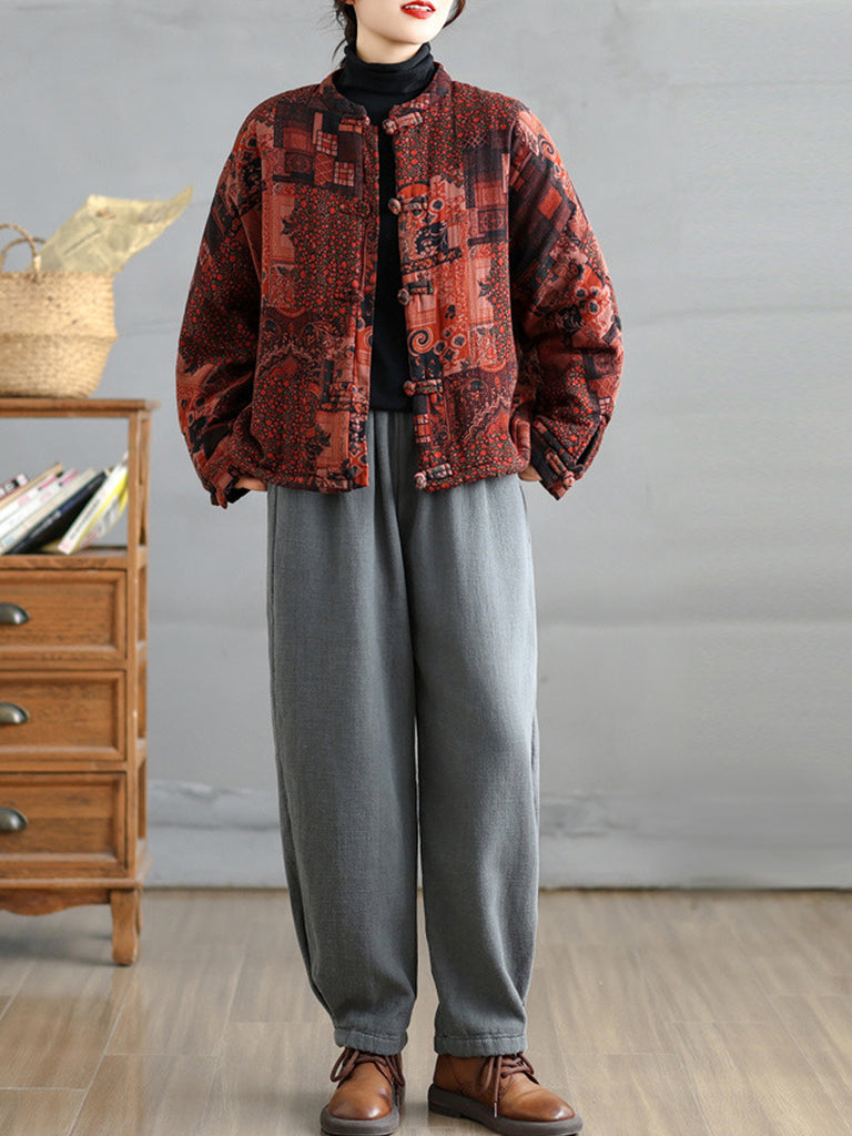 Women Retro Autumn Patchwork Stand Collar Cotton Padded Jacket