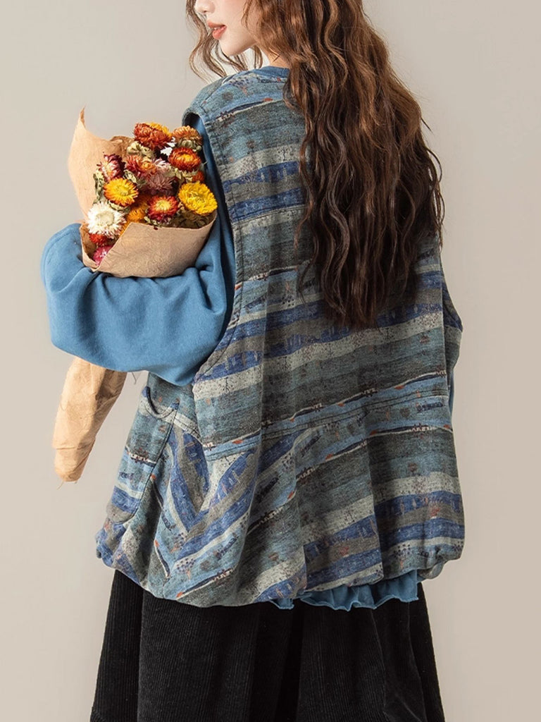 Women Autumn Retro Colorblock Stripe O-Neck Vest