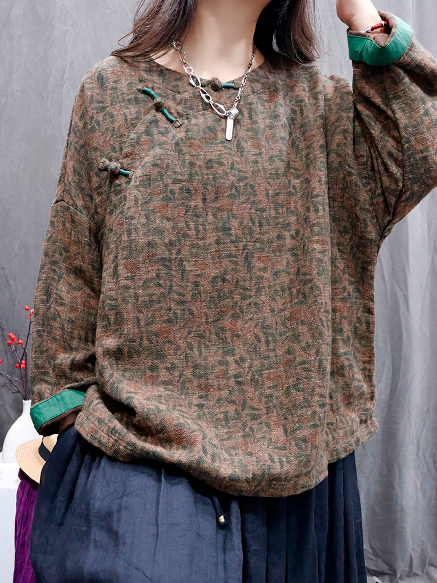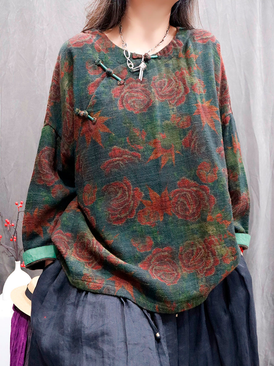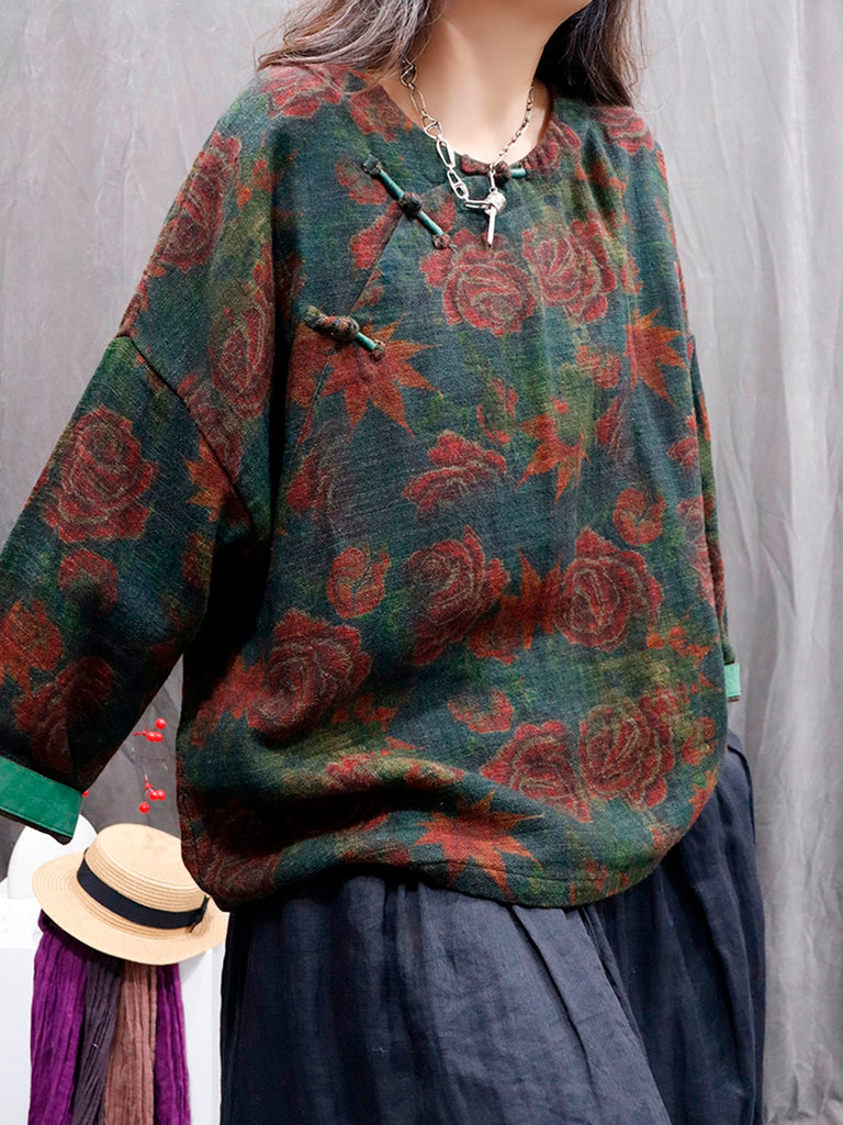 Crafted from breathable linen, this winter blouse showcases an elegant floral pattern with a classic o-neck silhouette. The raglan sleeves provide comfortable movement while maintaining a refined aesthetic, making it an ideal layering piece for cooler seasons. Its ethnic-inspired design bridges traditional craftsmanship with contemporary style, perfect for autumn and winter wardrobes seeking distinctive character and timeless appeal.