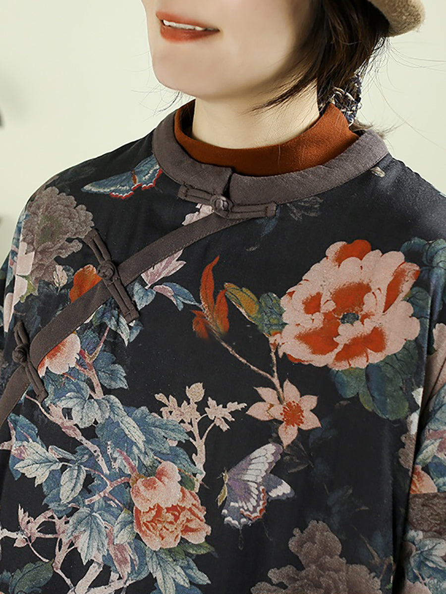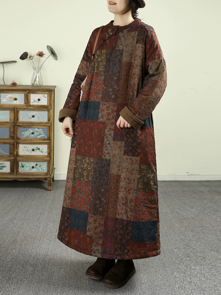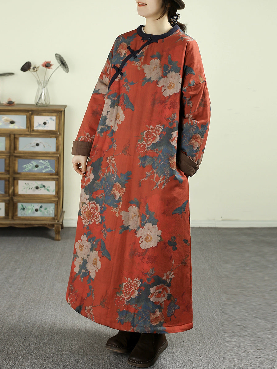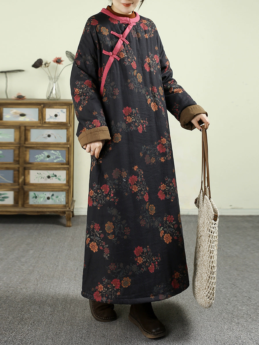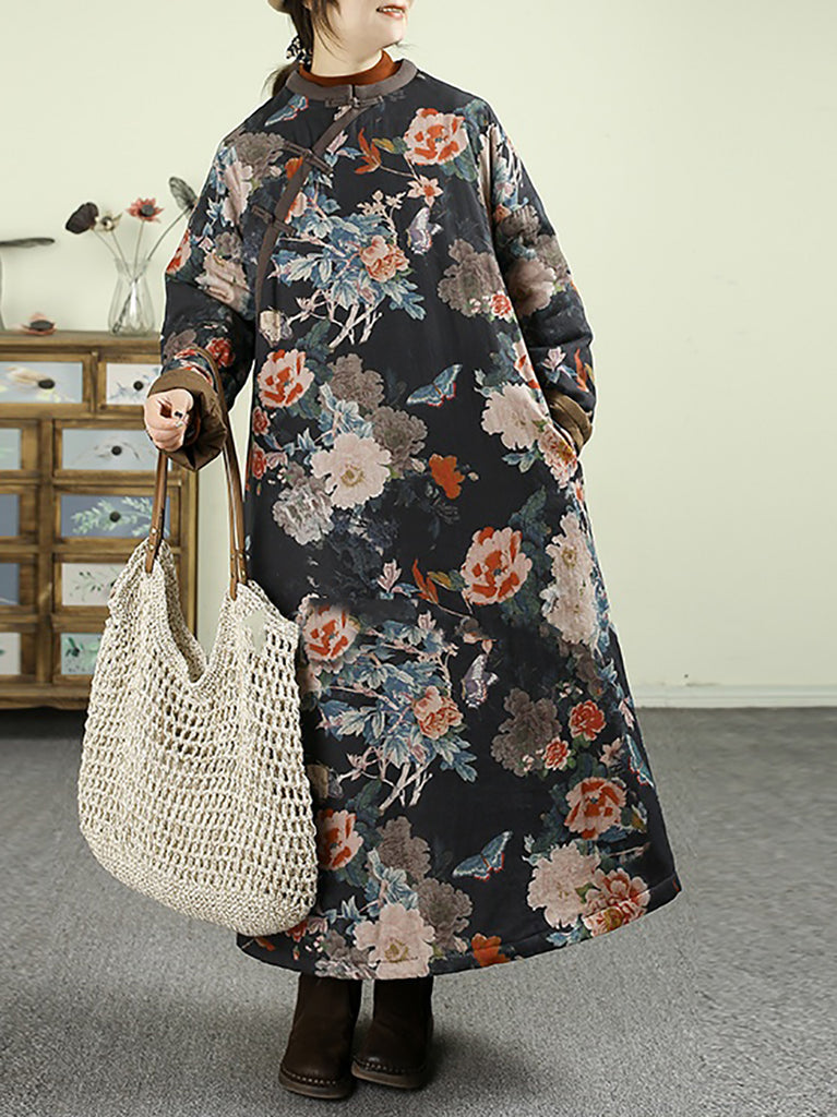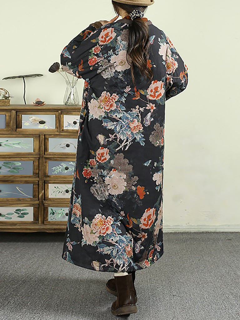 Women Winter Flower O-Neck 100%Cotton Padded Overcoat
