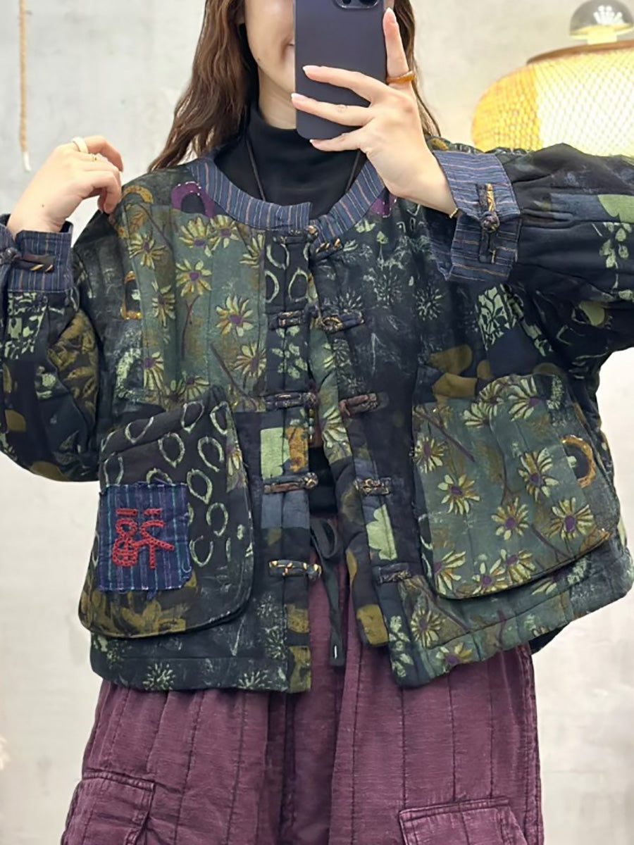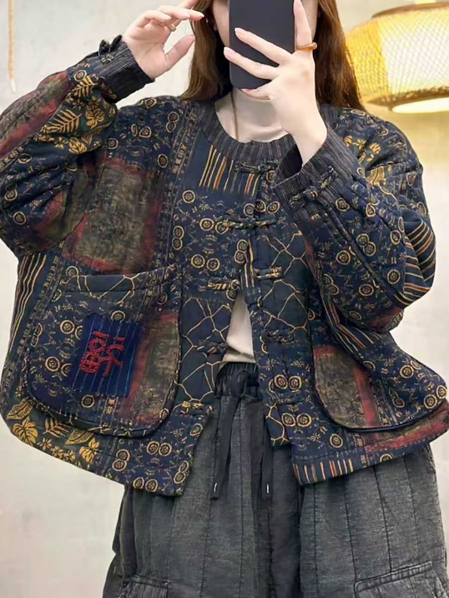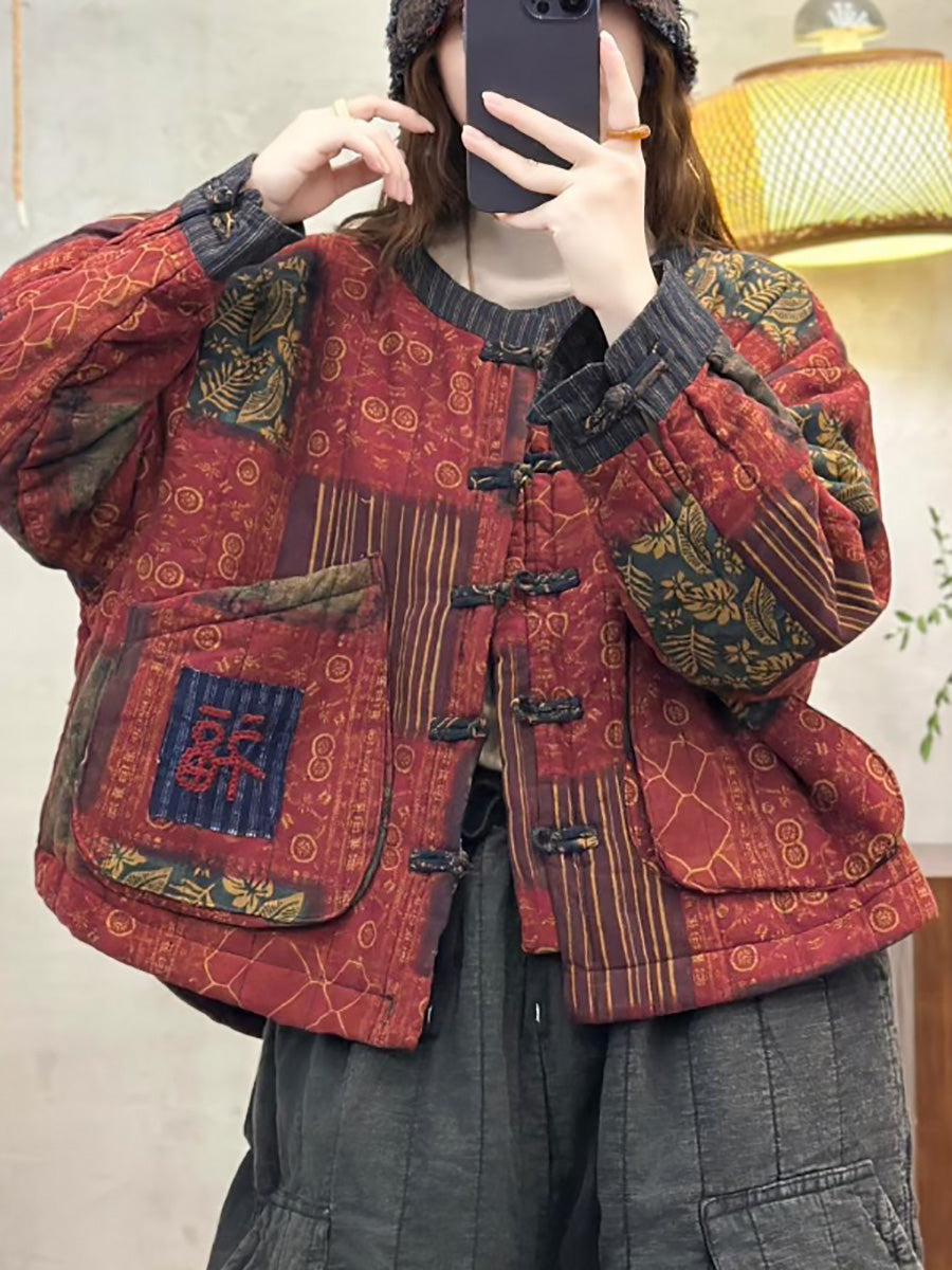 Women Winter Retro Patch Spliced O-Neck Padded Coat