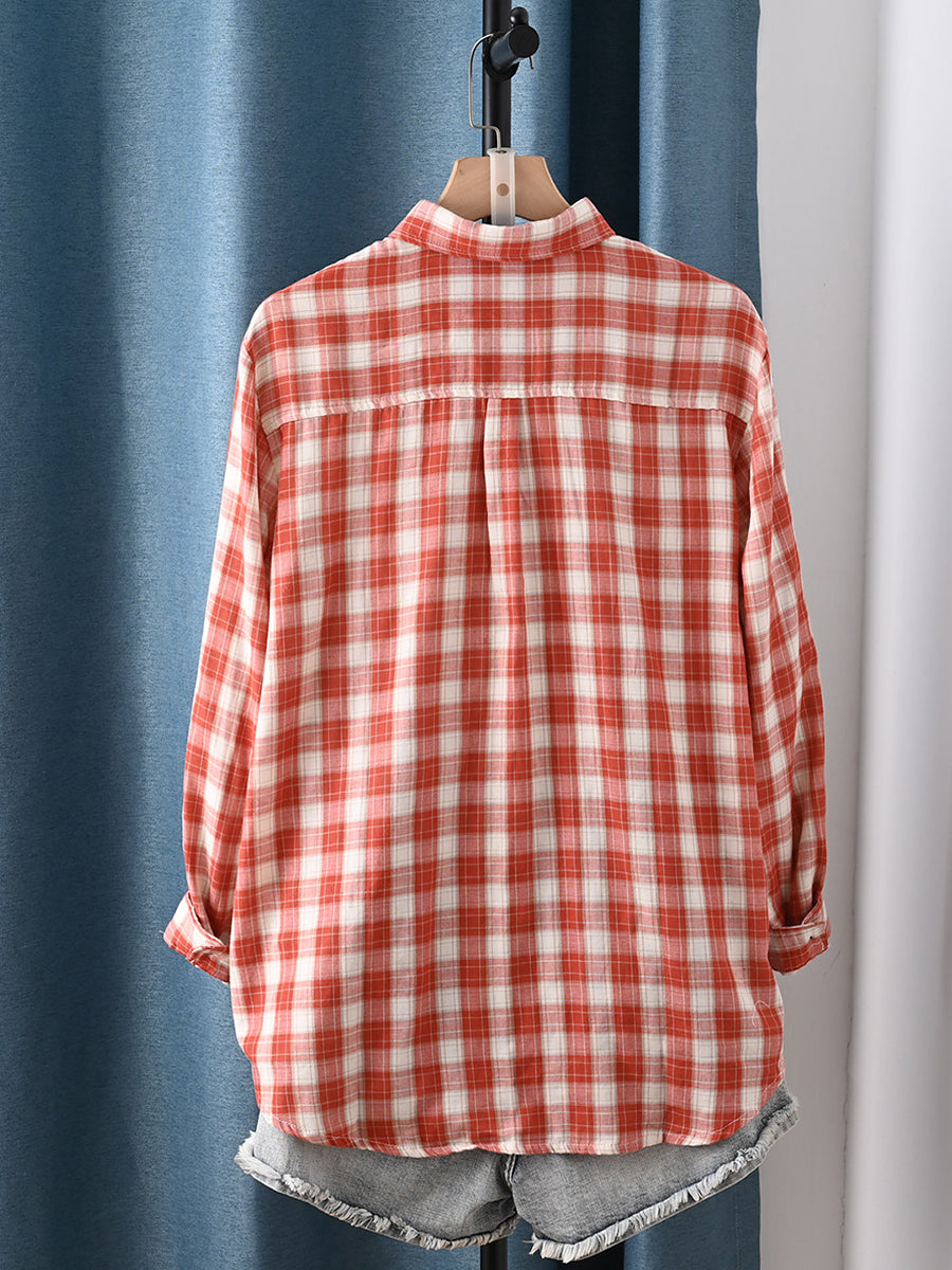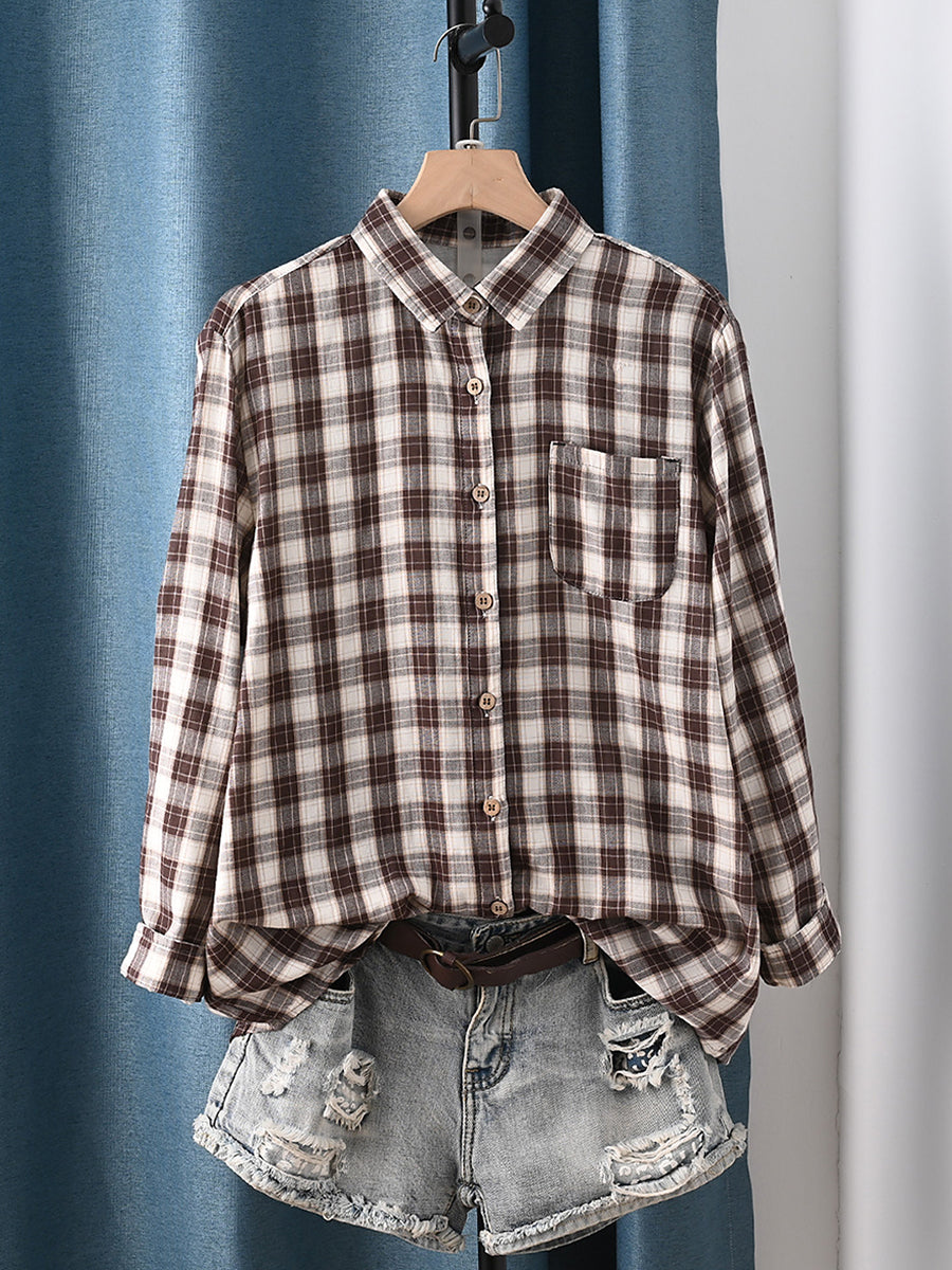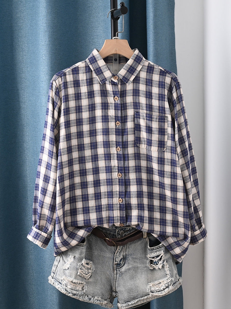 Women Spring Artsy Plaid Turn-down Collar 100%Cotton Shirt