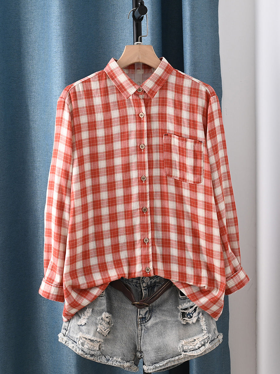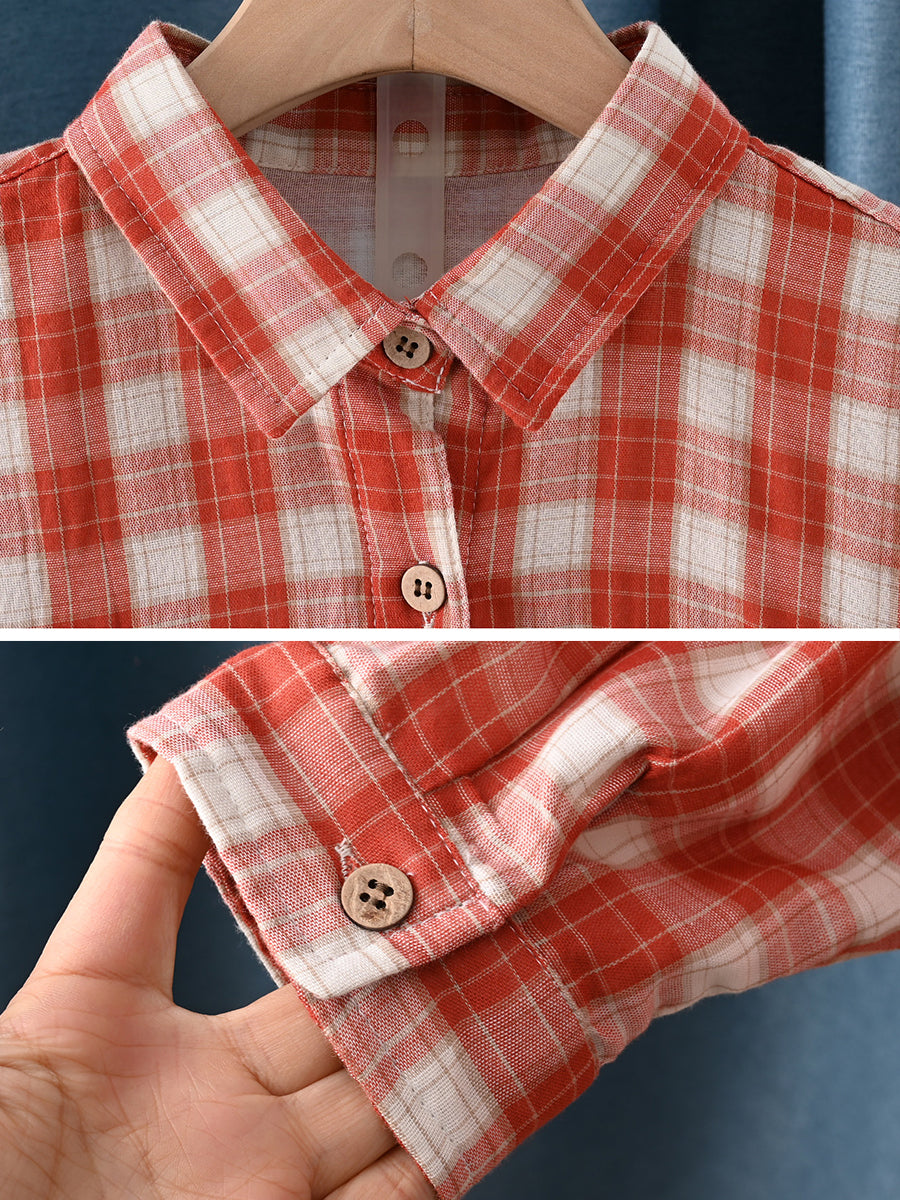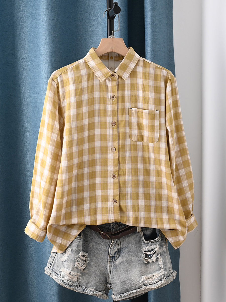 Women Spring Artsy Plaid Turn-down Collar 100%Cotton Shirt