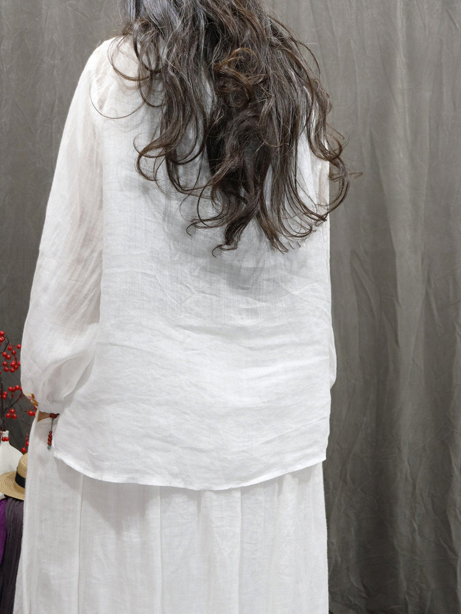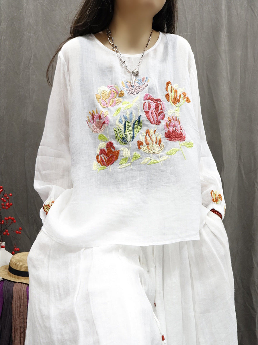 Women Spring Artsy Flower Embroidery O-Neck 100%Ramie Shirt