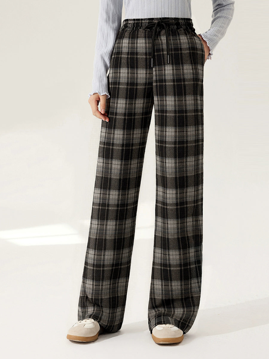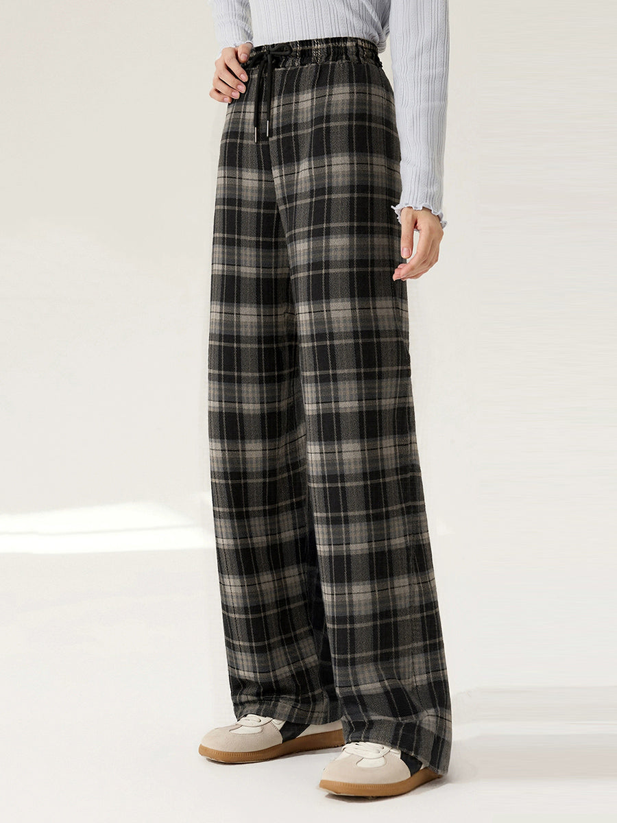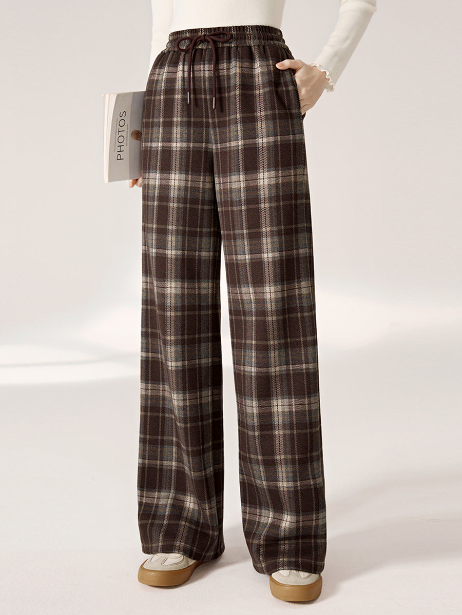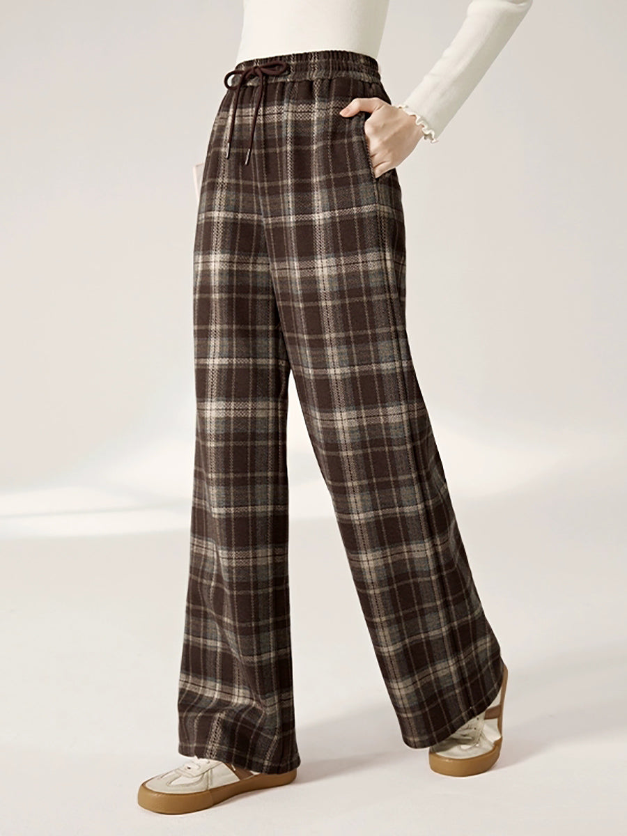 Women Autumn Retro Plaid Straight Fleece-lined Pants
