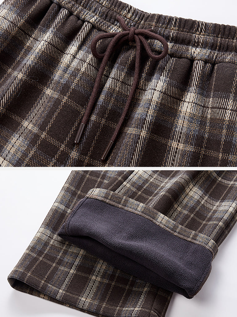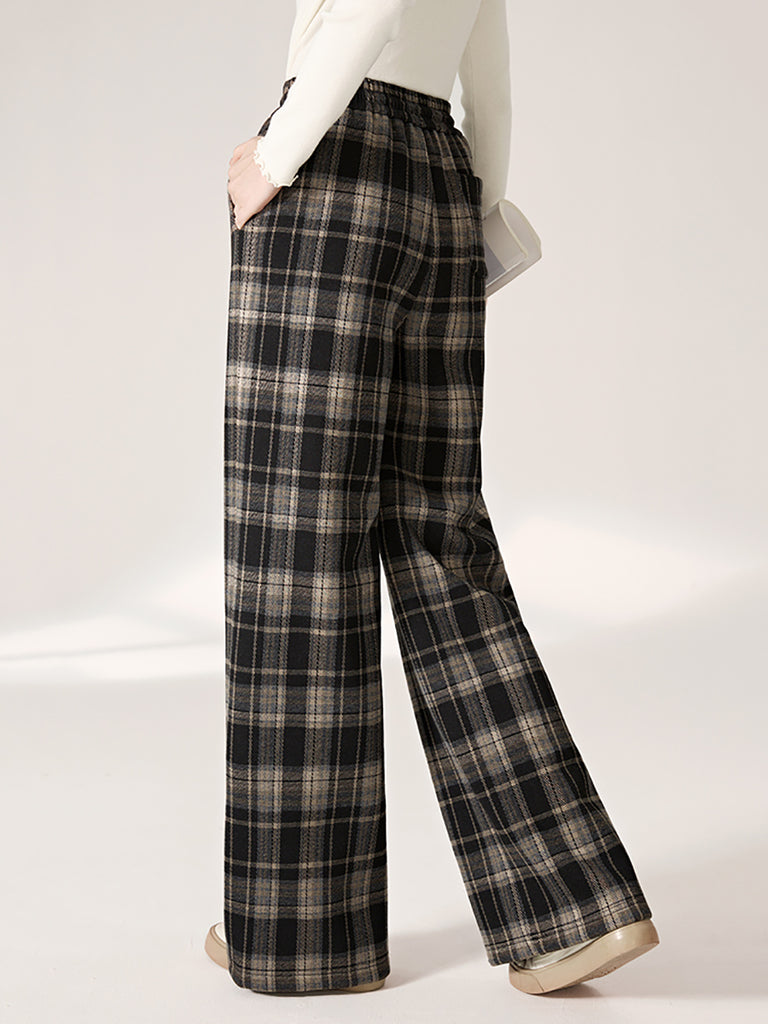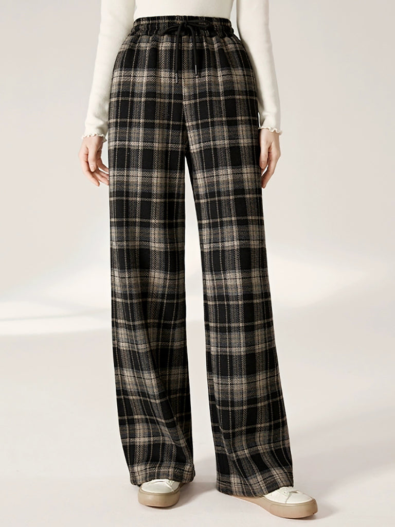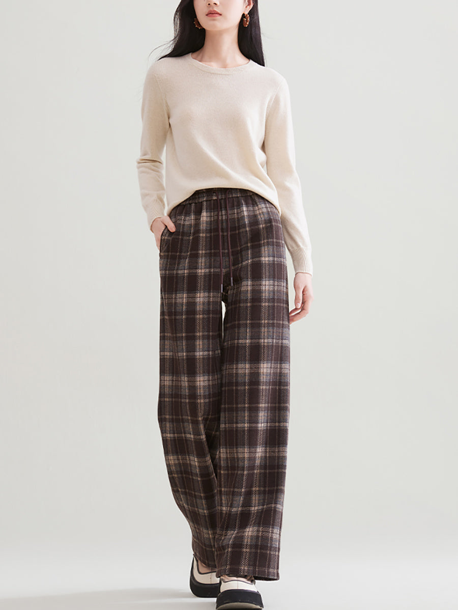Women Autumn Retro Plaid Straight Fleece-lined Pants