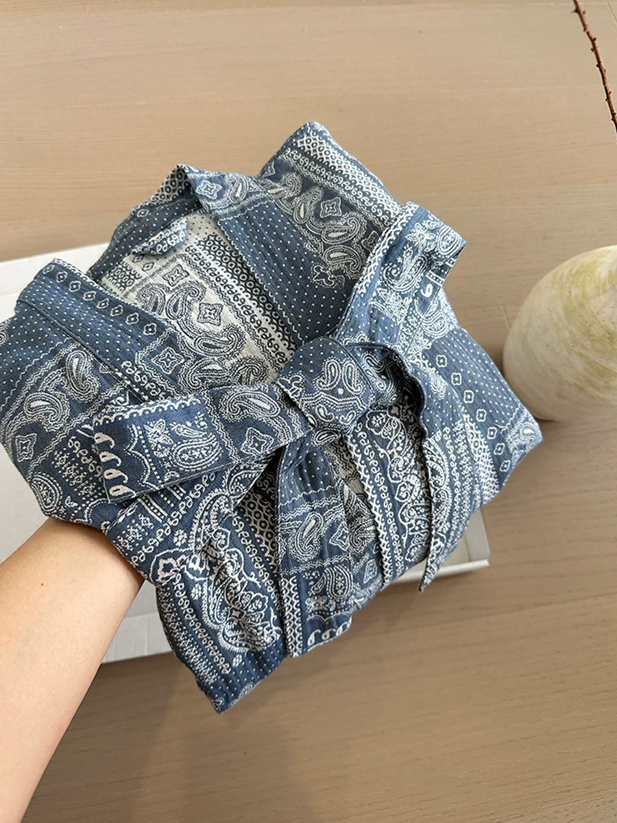 Our Cotton Gauze Bathrobe features a mid to long length that falls below the knee, crafted from 100% Cotton Gauze material. With its soft touch texture and elegant paisley floral pattern design, this breathable and durable bathrobe is perfect for lounging at home or after a shower, offering a stylish and comfortable experience.
