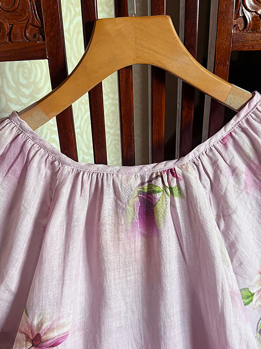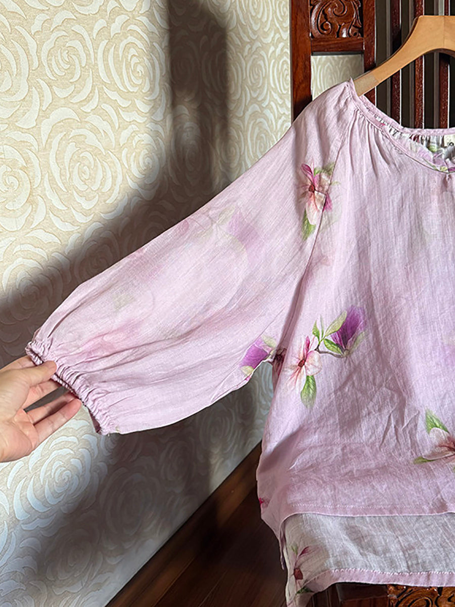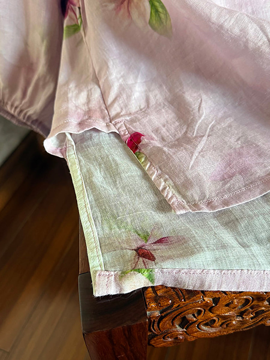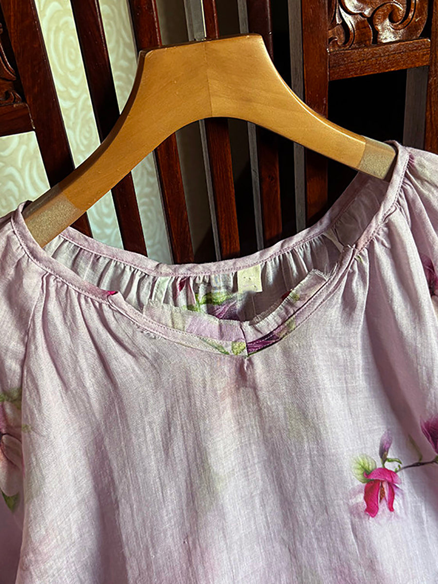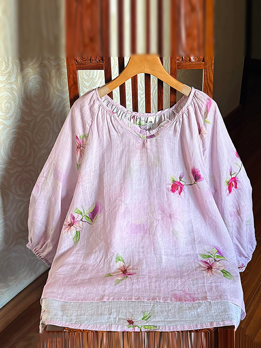 Women Summer Artsy Flower V-Neck 100%Ramie Shirt