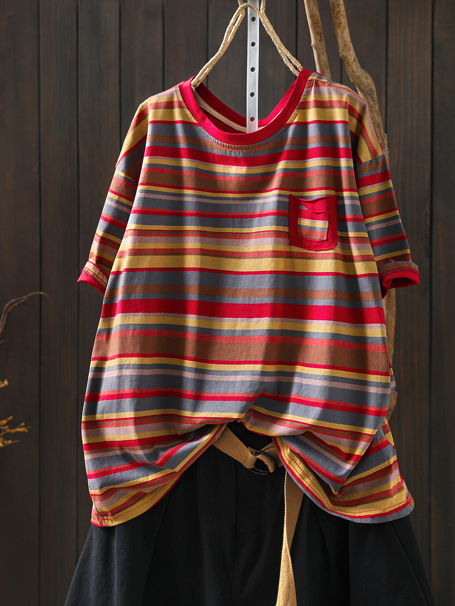 Women Summer Casual Stripe Cotton O-Neck Shirt