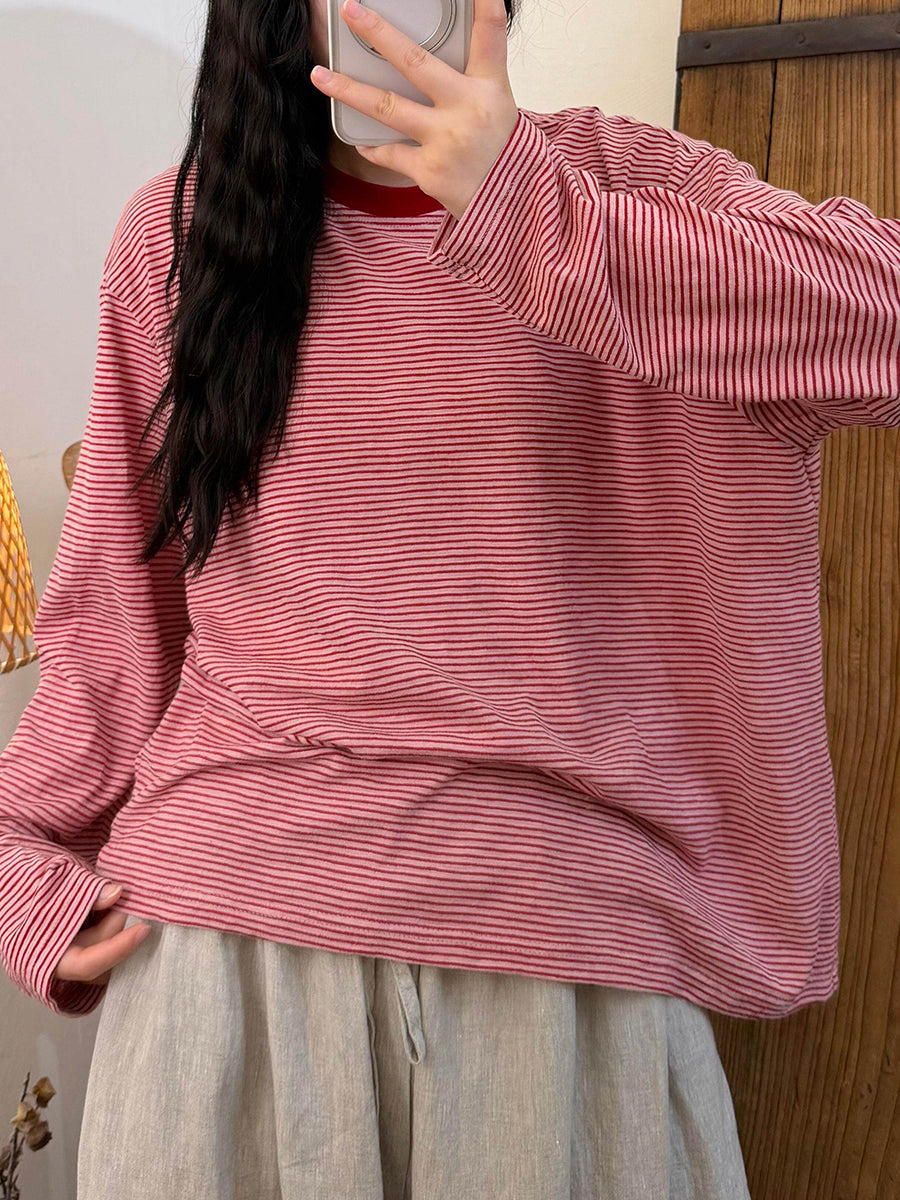 Women Summer Casual Stripe O-Neck Cotton Blouse
