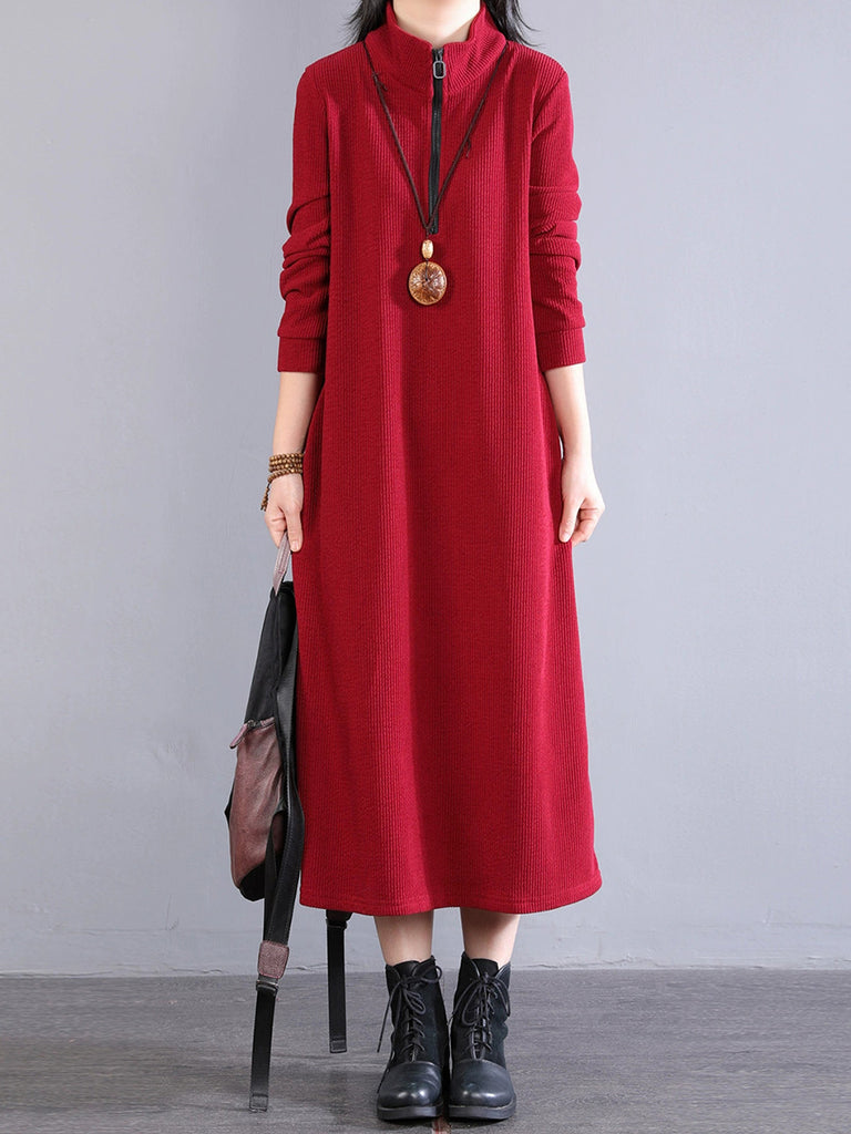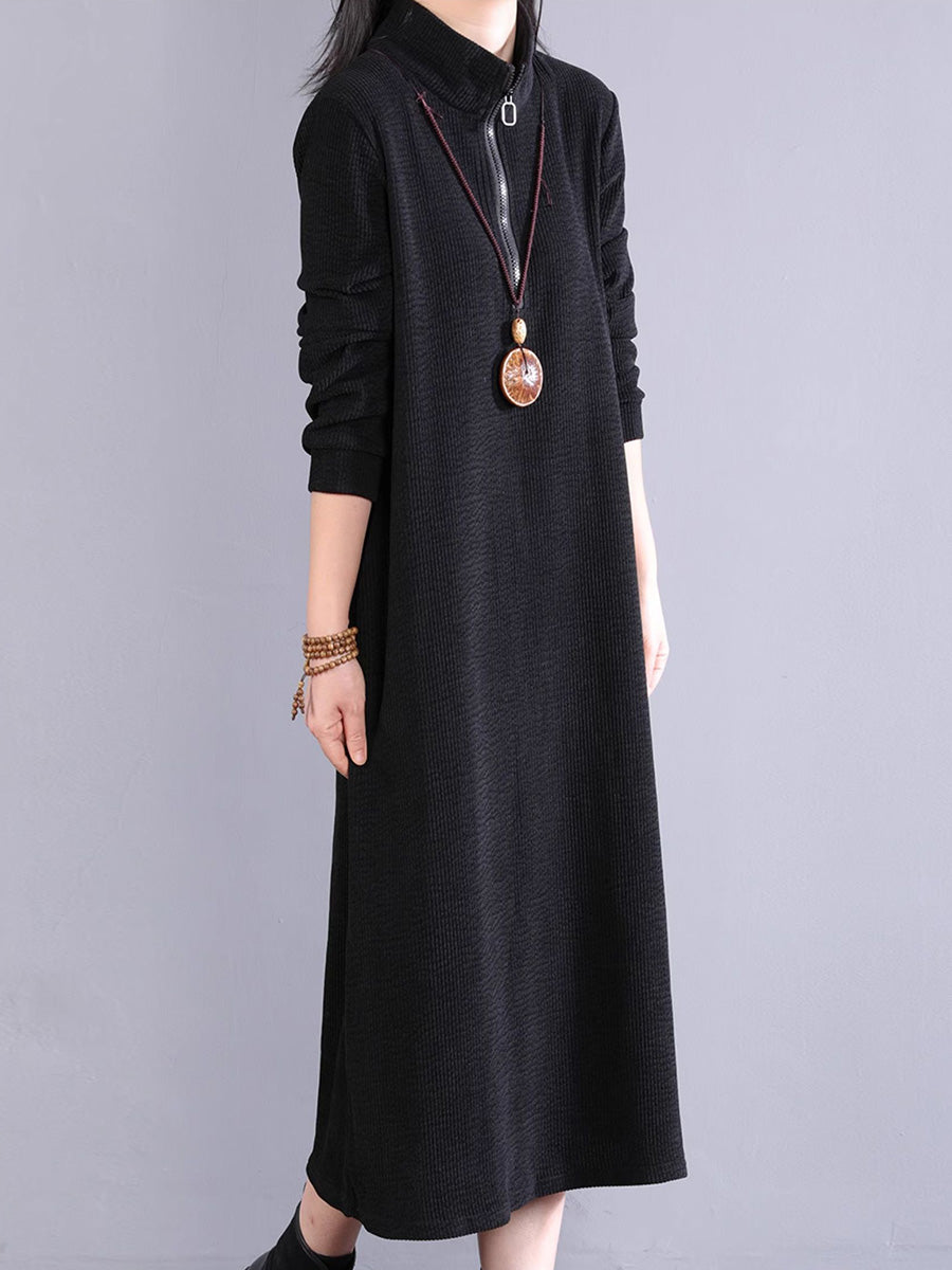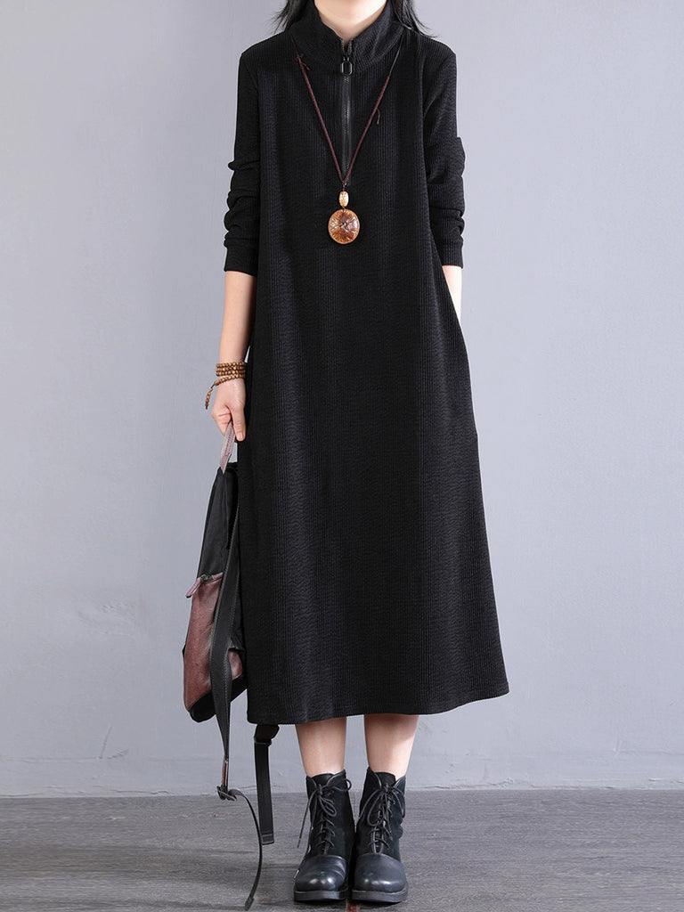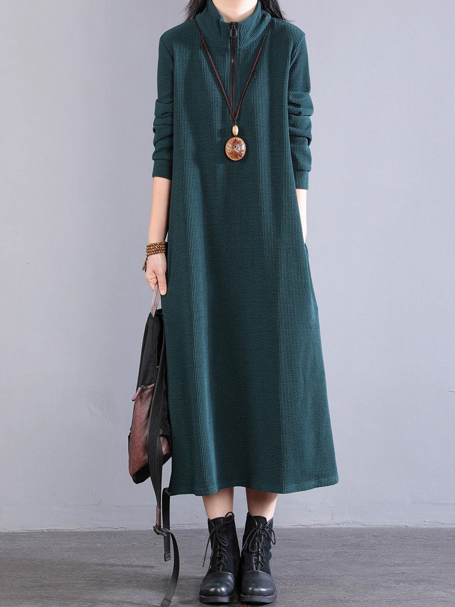 Women Autumn Pure Color Half-Turtleneck 100%Cotton Dress