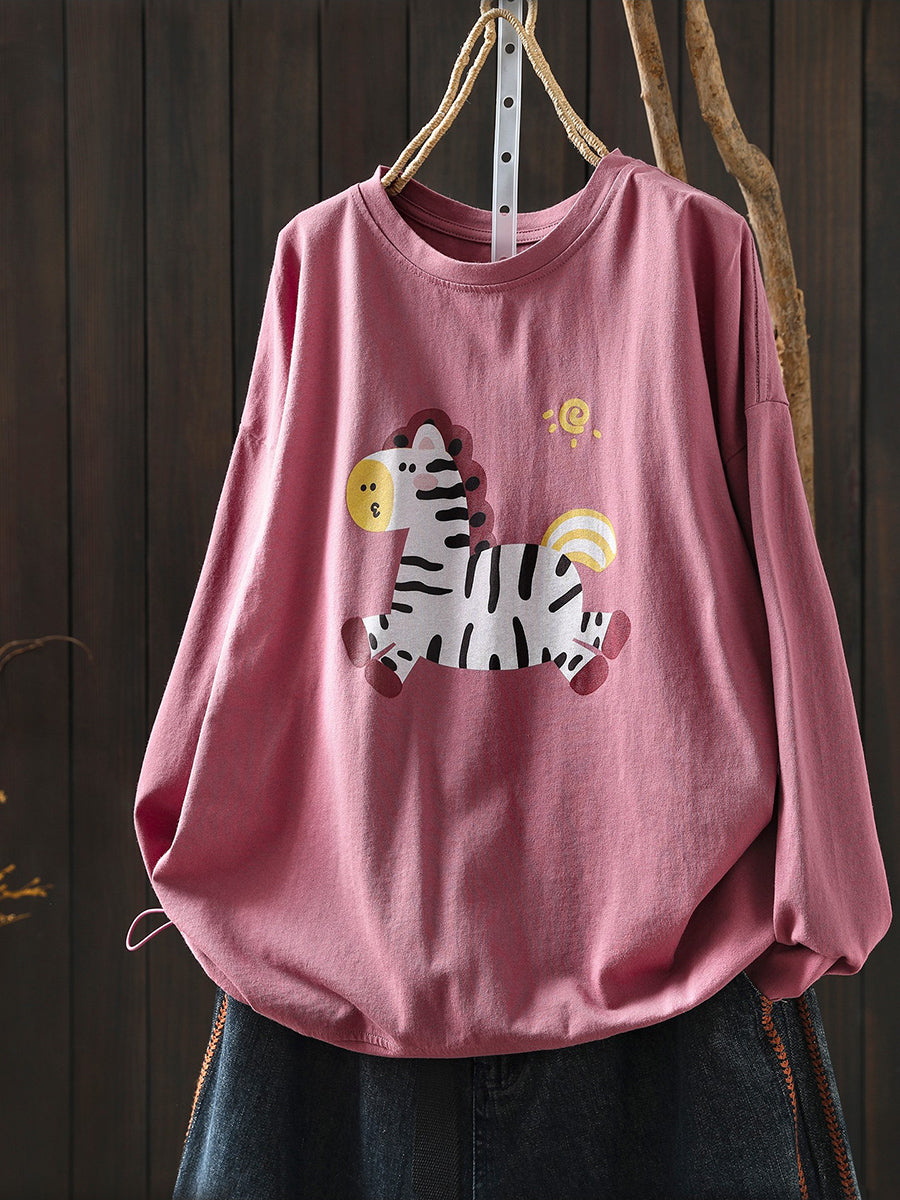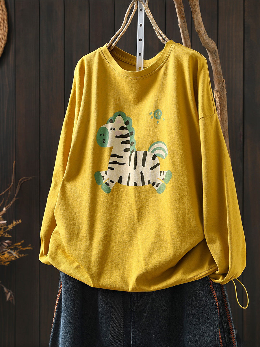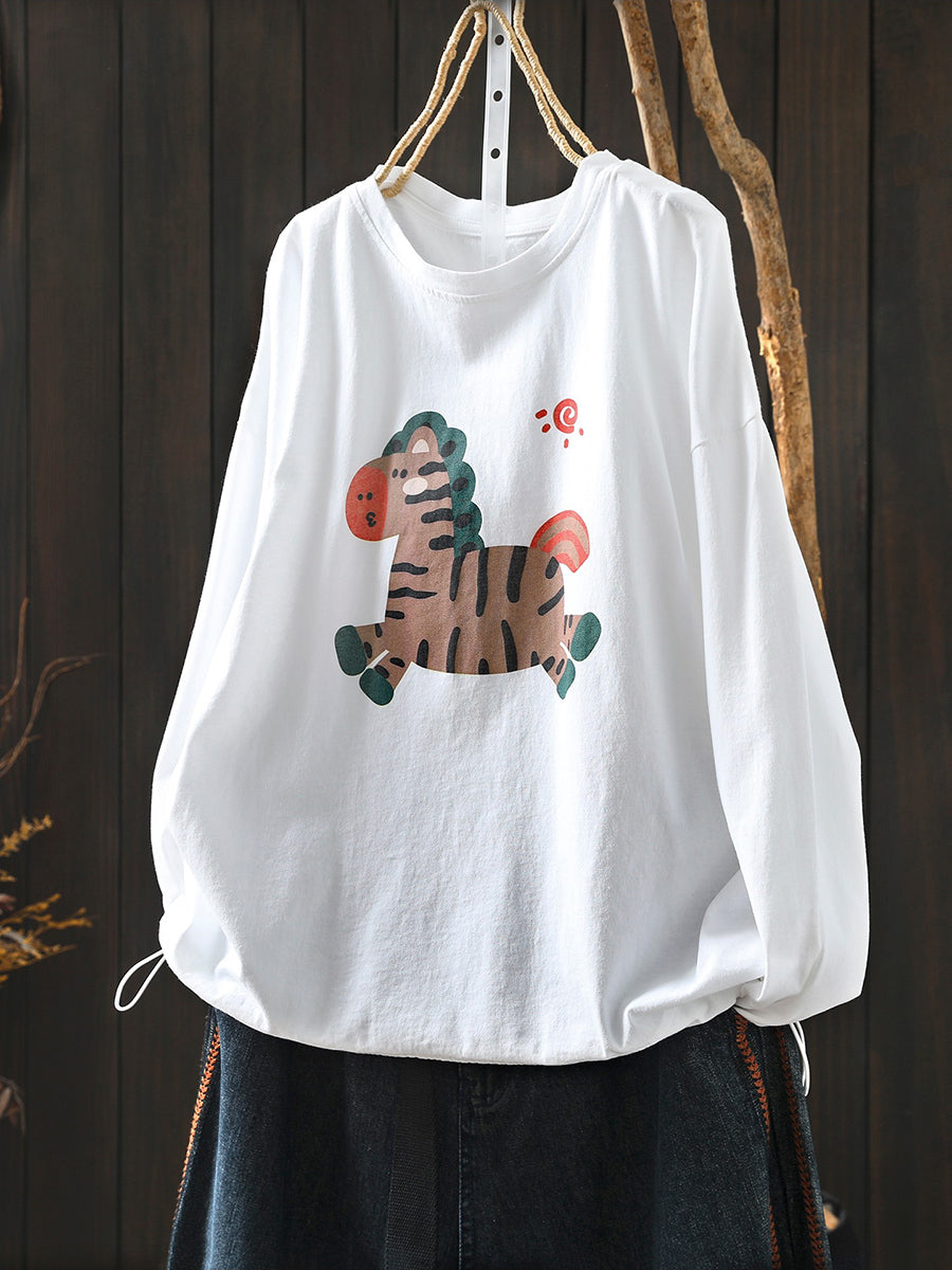 Women Artsy Spring Horse Cotton O-Neck Blouse