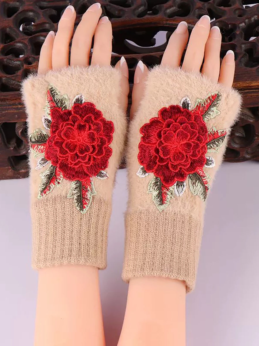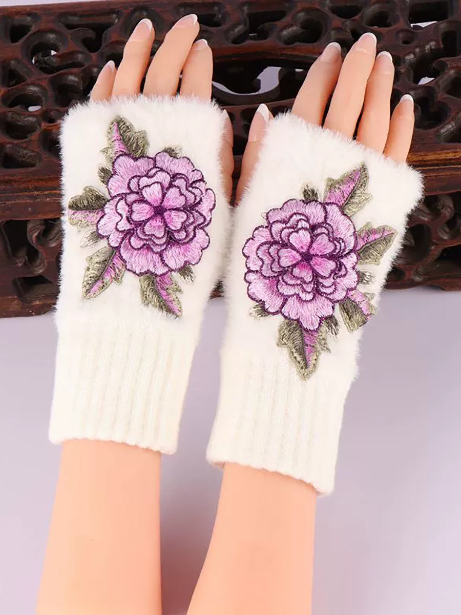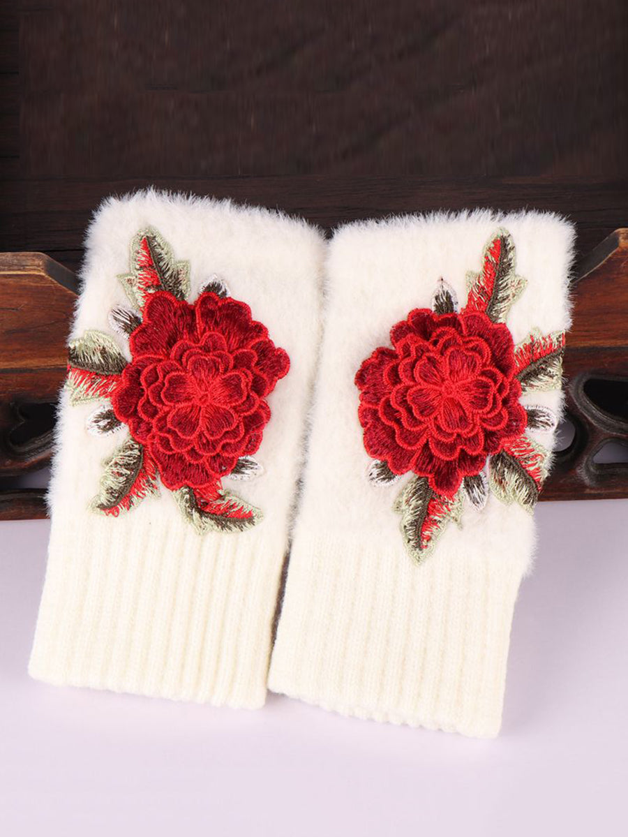 Winter Artsy Flower Embroidery Plush Gloves