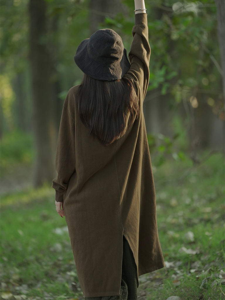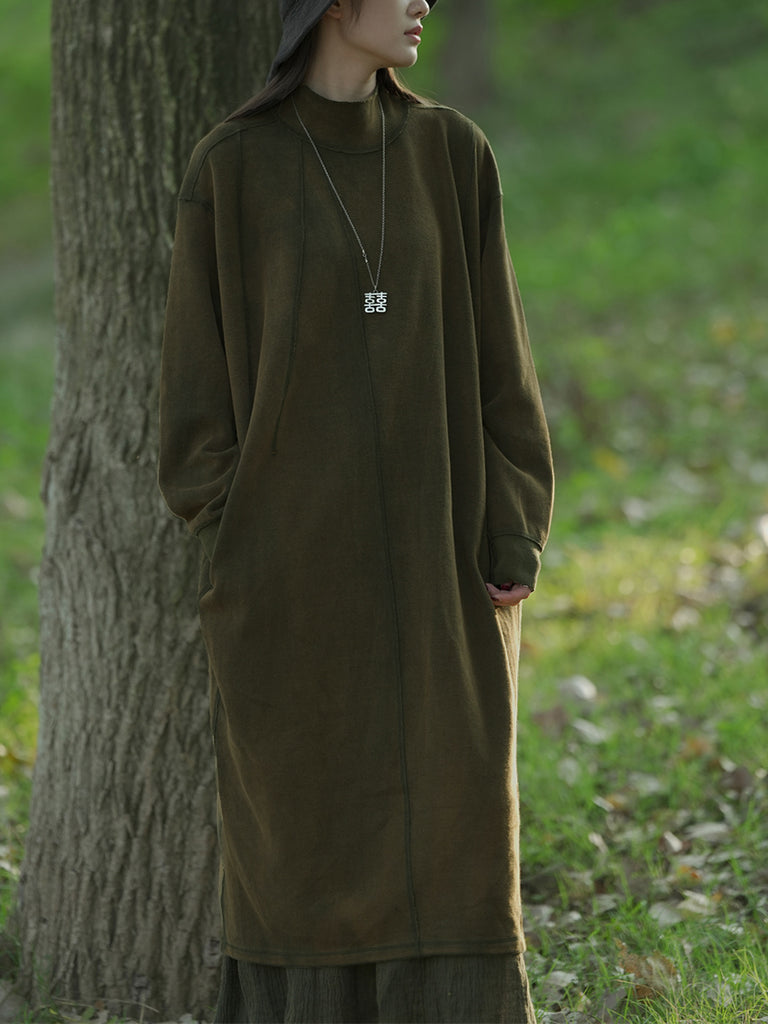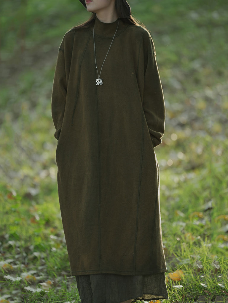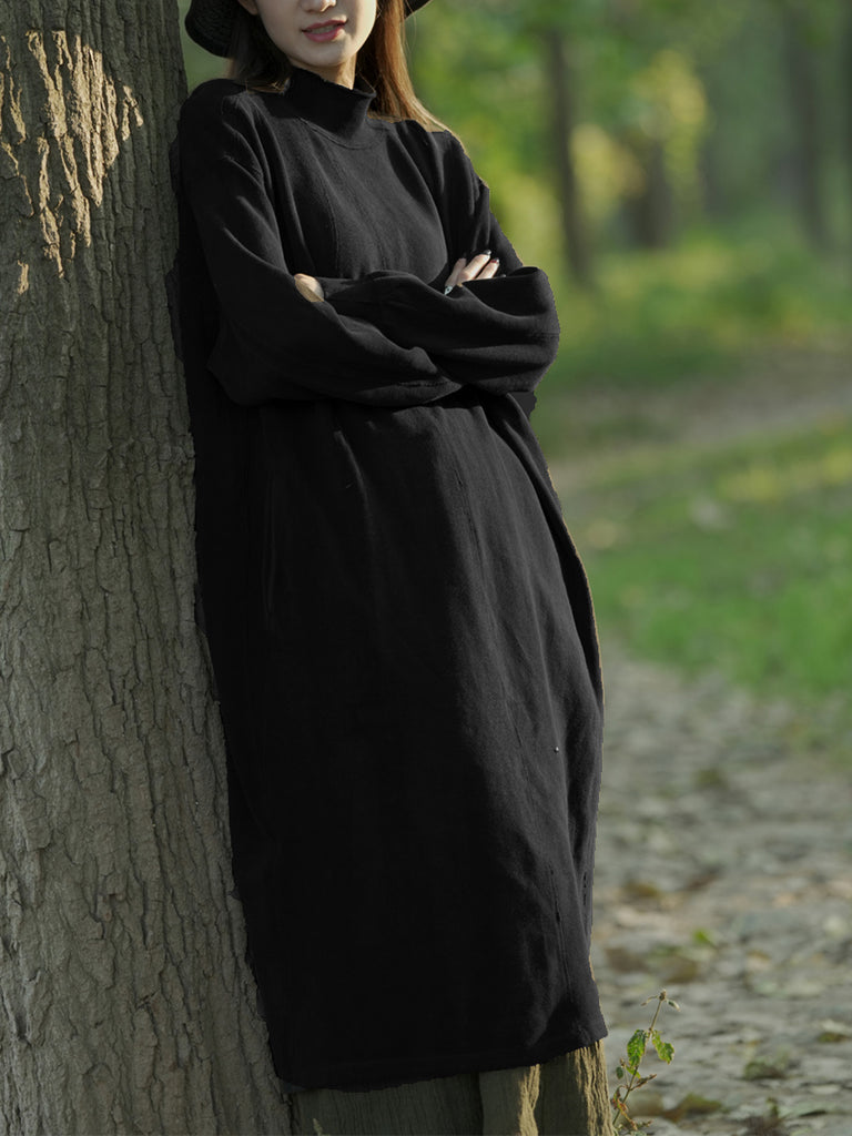 Women Autumn Casual Pure Color Stand Collar Cotton Dress