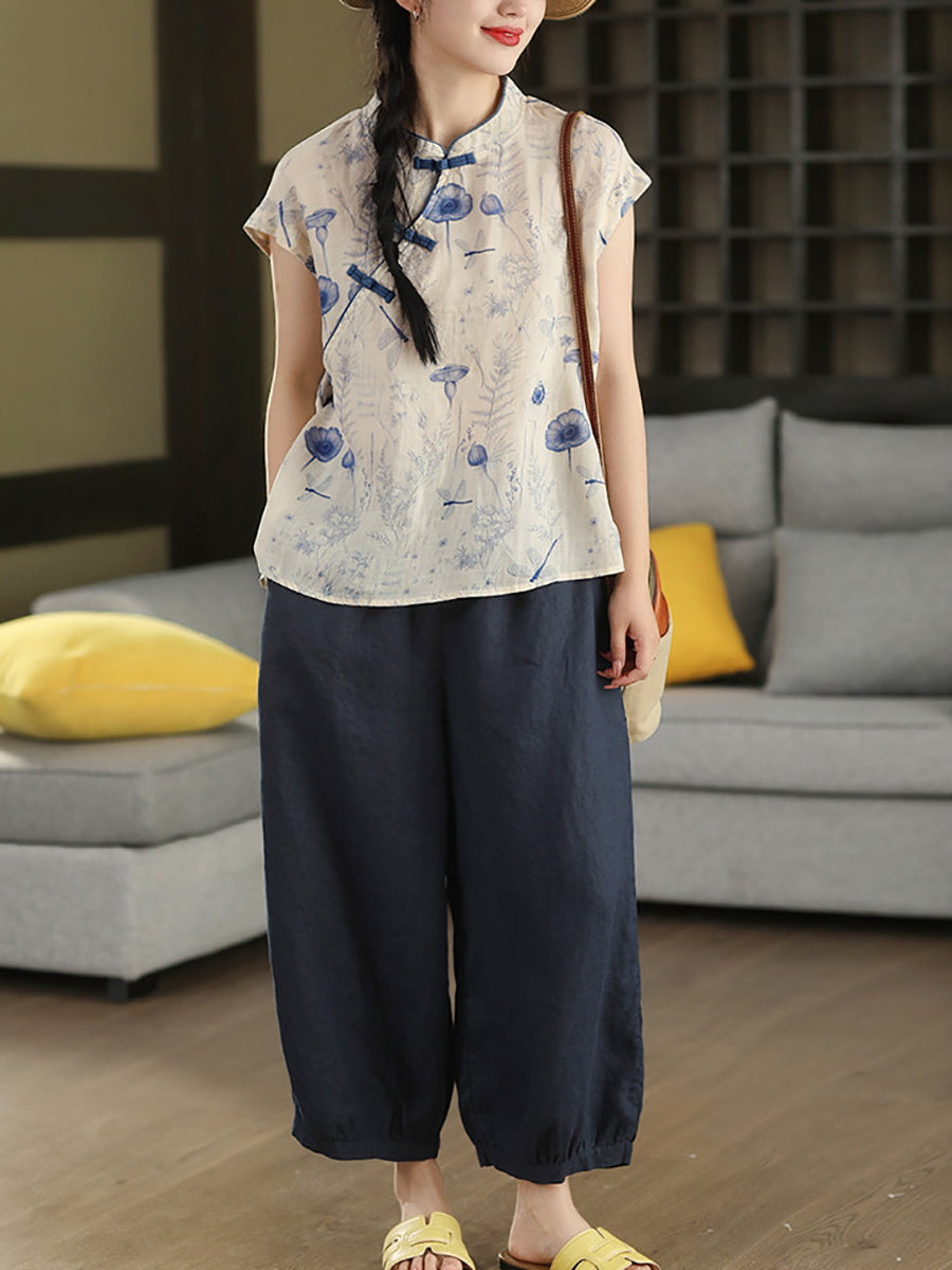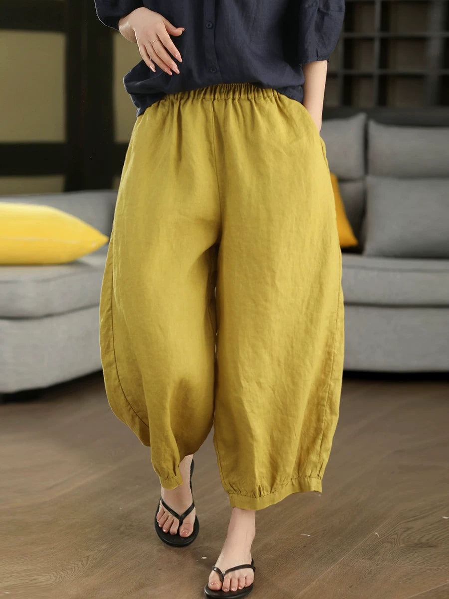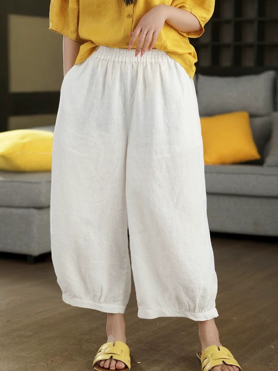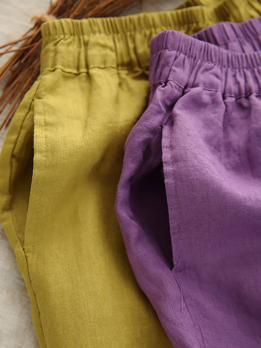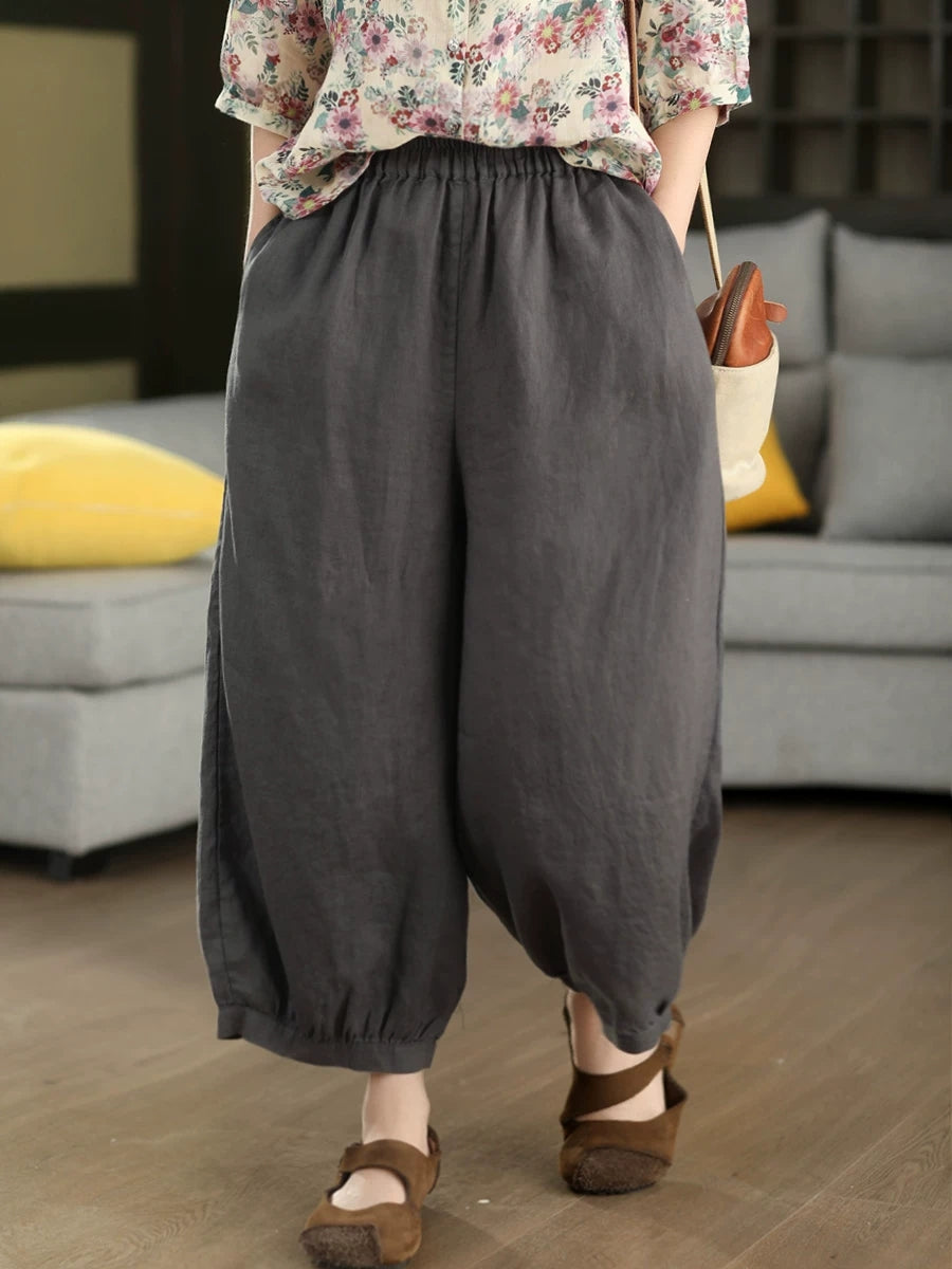 Women Summer Retro Pure Color 100%Linen Bloomers