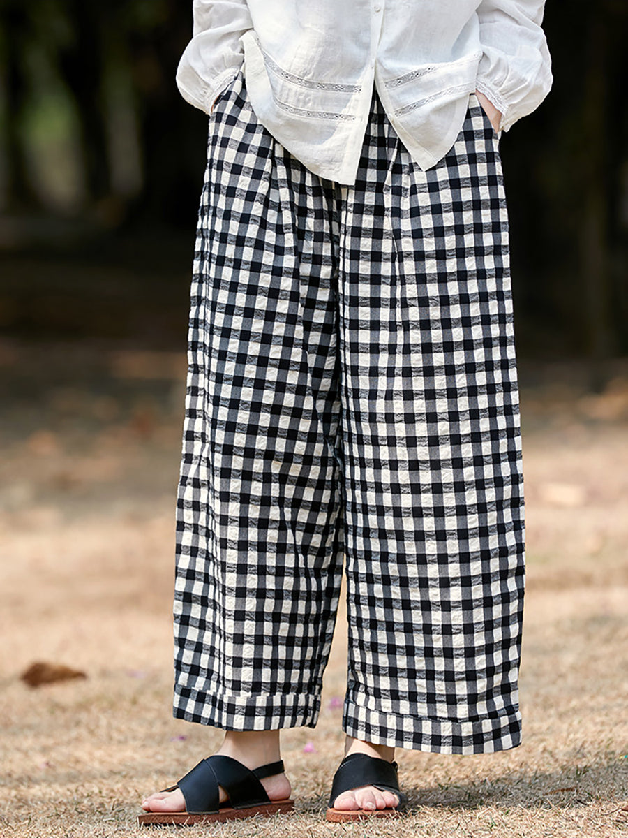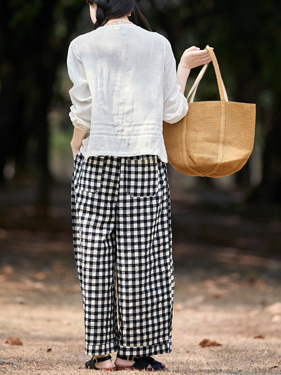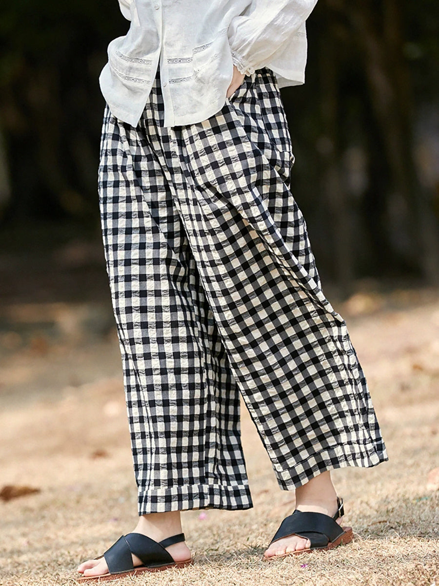 Women Spring Plaid 100%Cotton Straight Pants