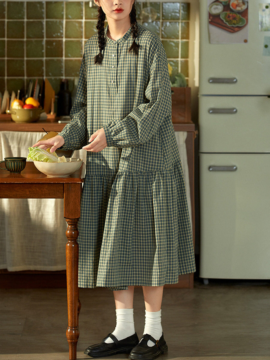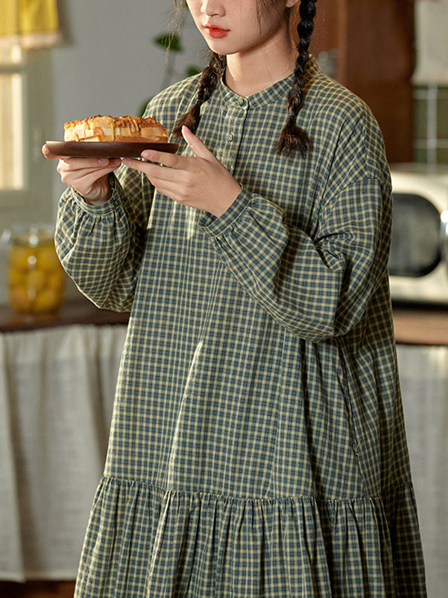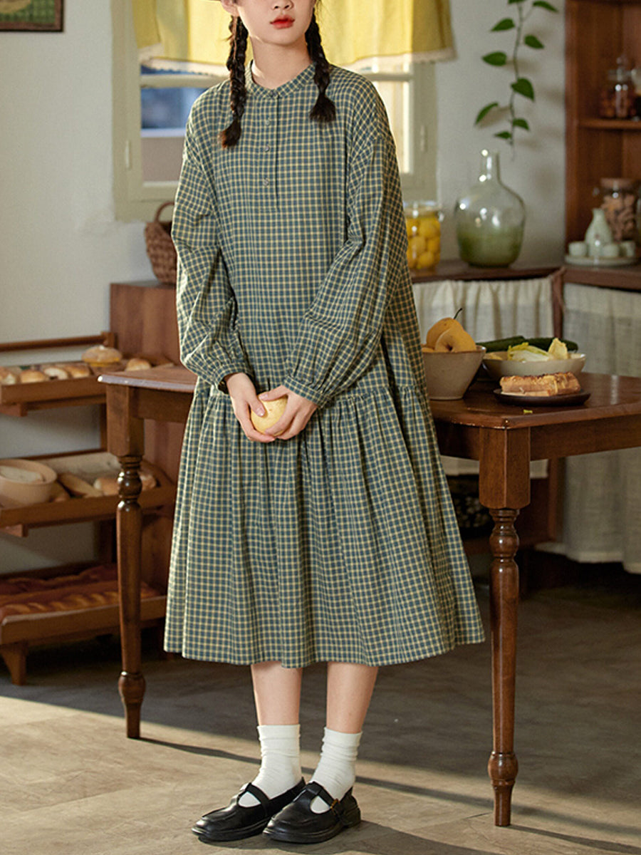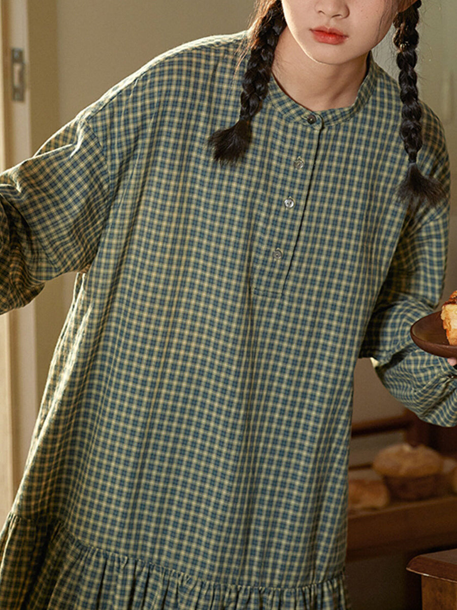 Women Spring Artsy Plaid 100%Cotton O-Neck Dress