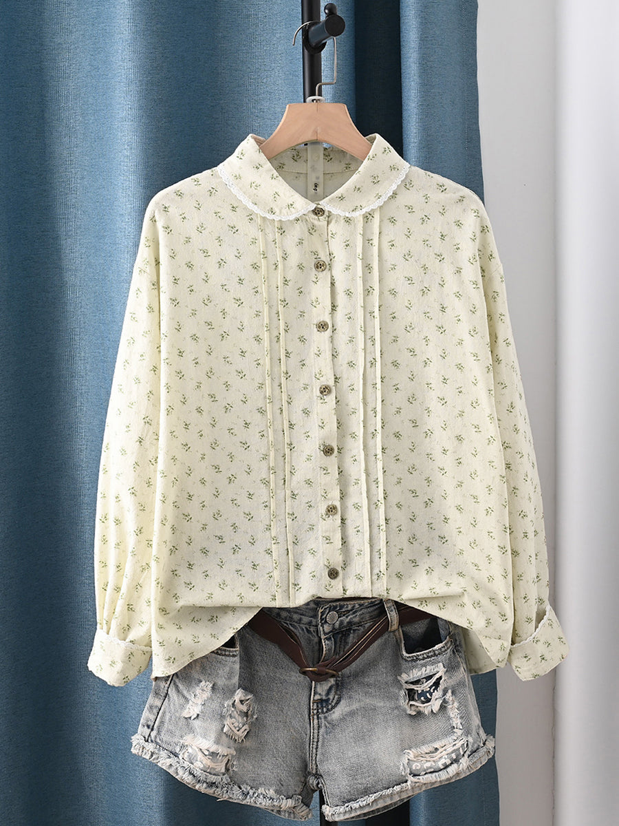 Women Spring Artsy Floral 100%Cotton Turn-down Collar Shirt