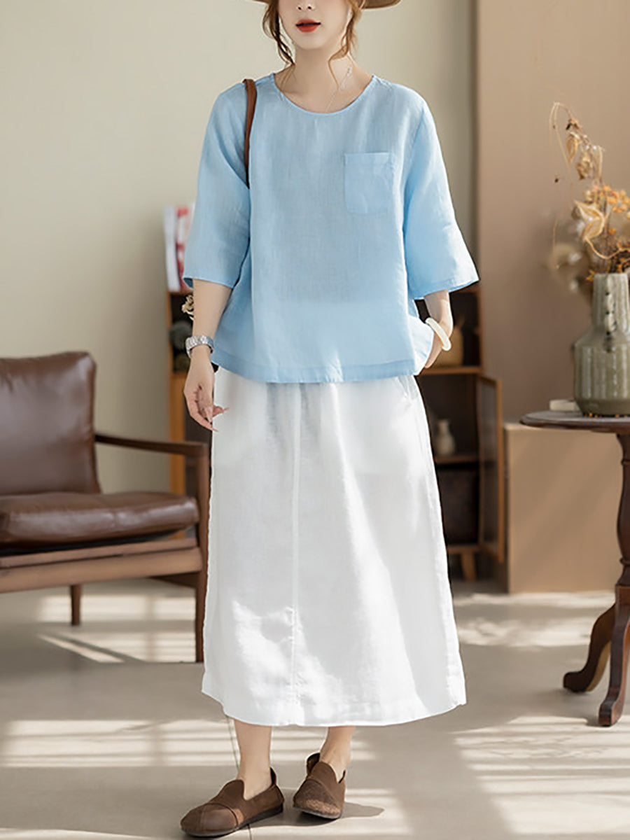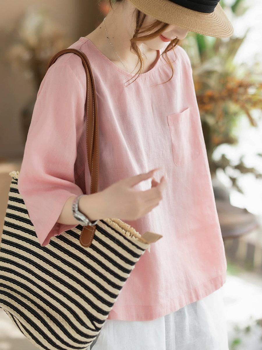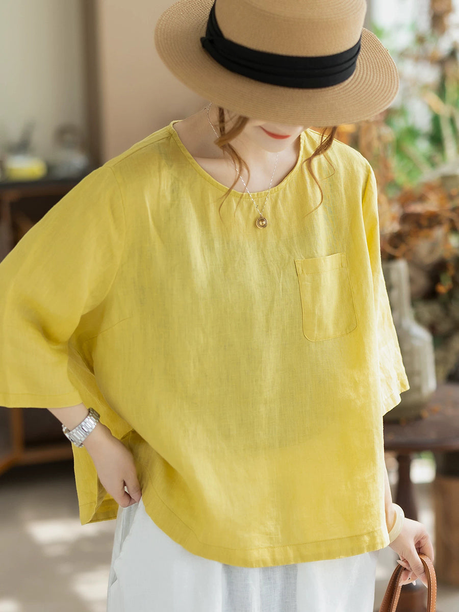 Women Summer Artsy O-Neck 100%Linen Blouse