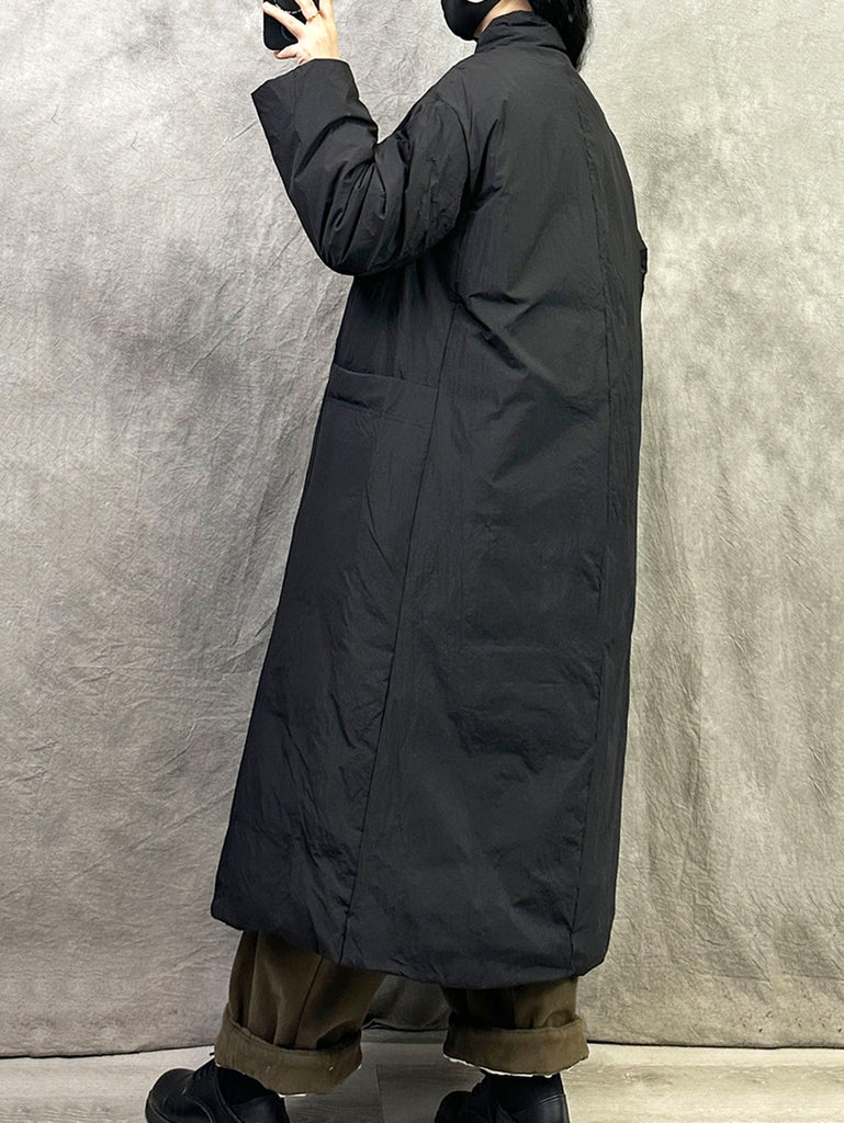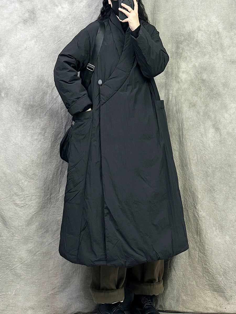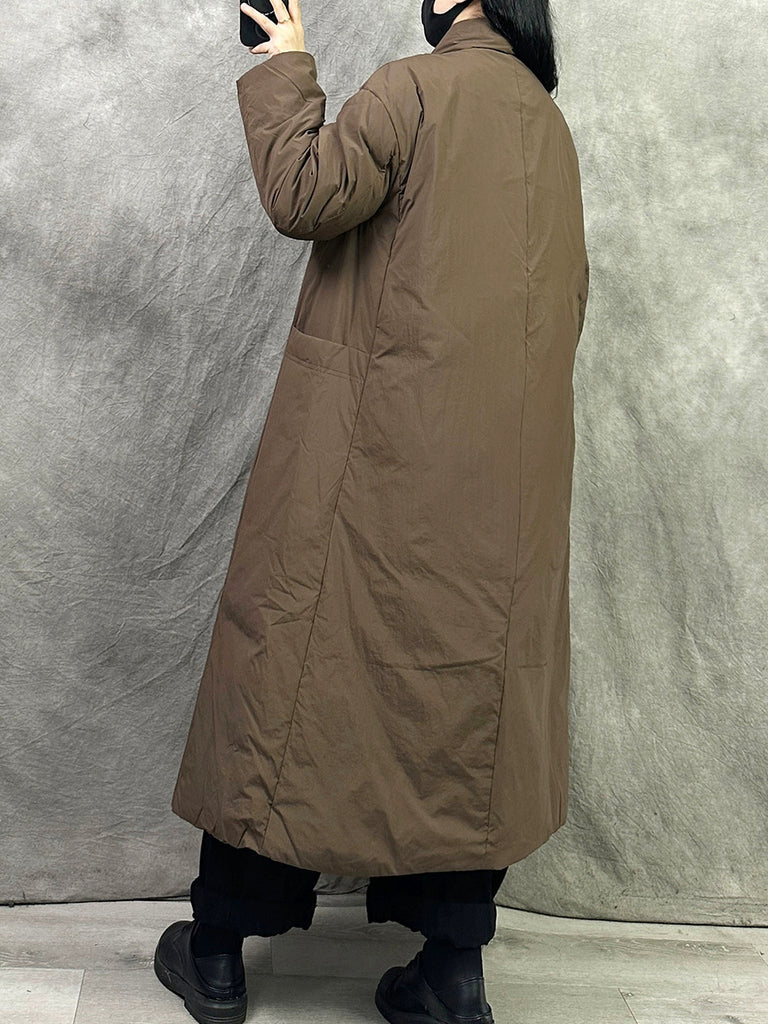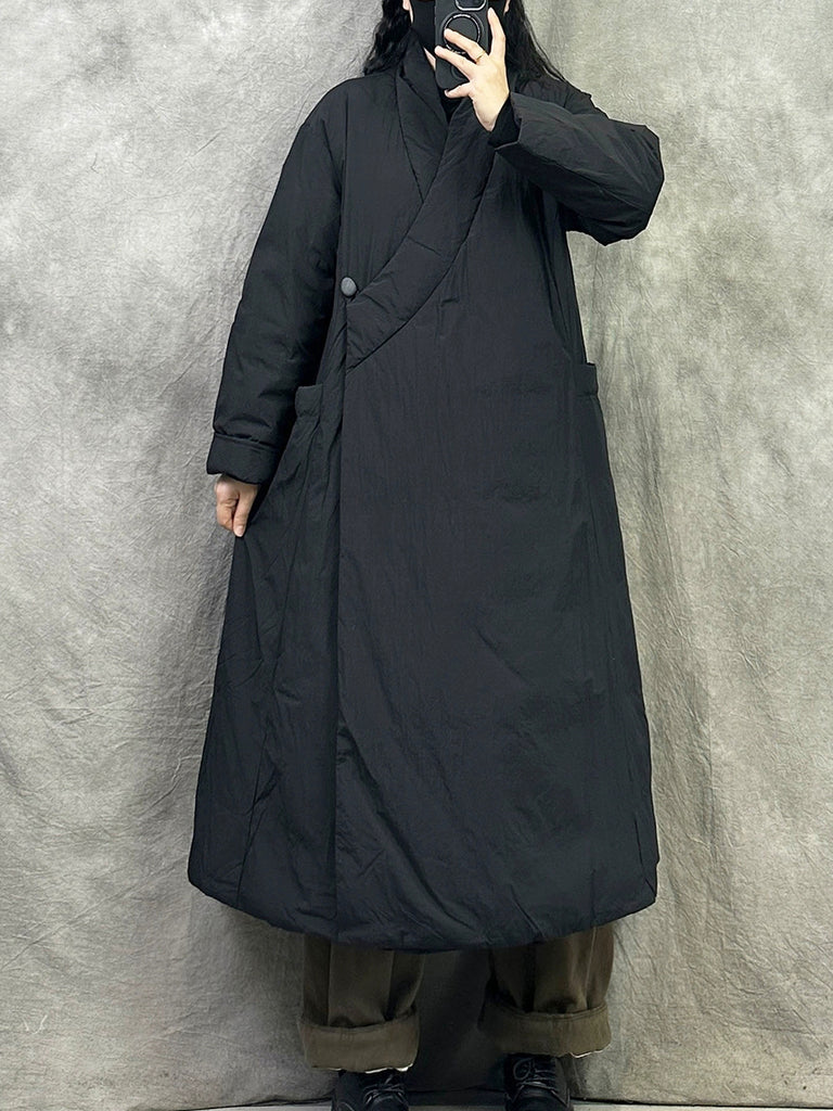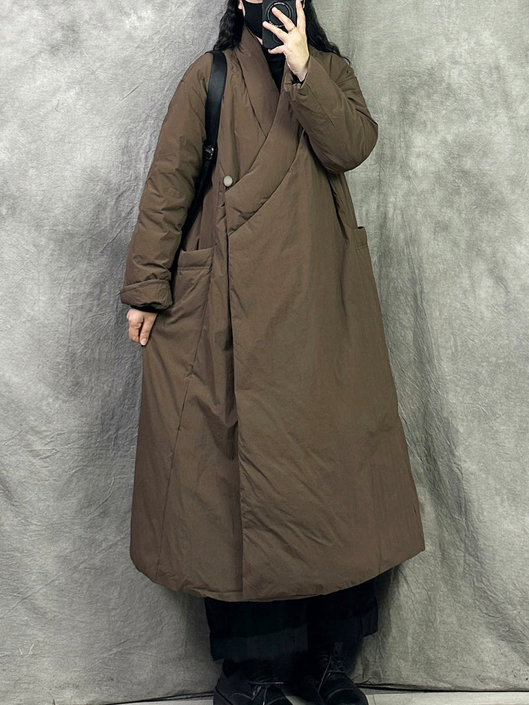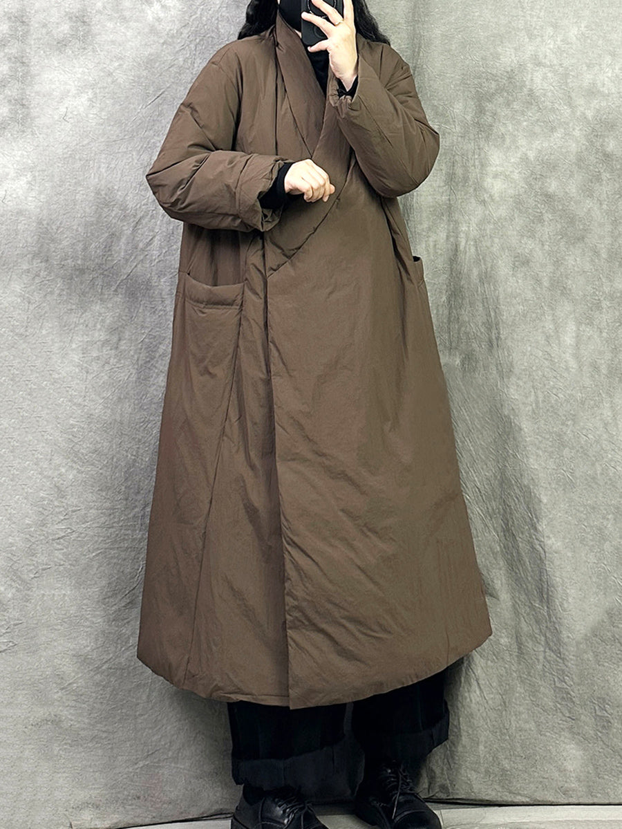 Women Winter Retro Pure Color V-Neck Down Coat