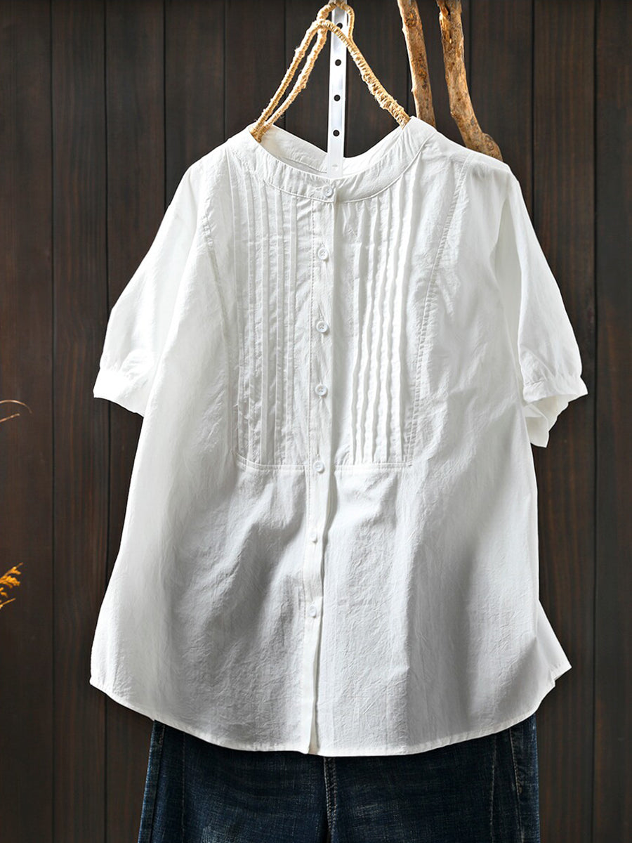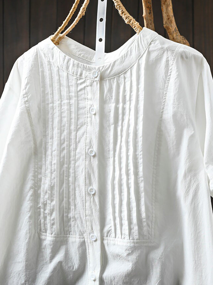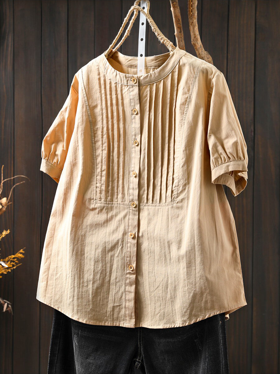 Women Summer Artsy Shirred O-Neck 100%Cotton Shirt