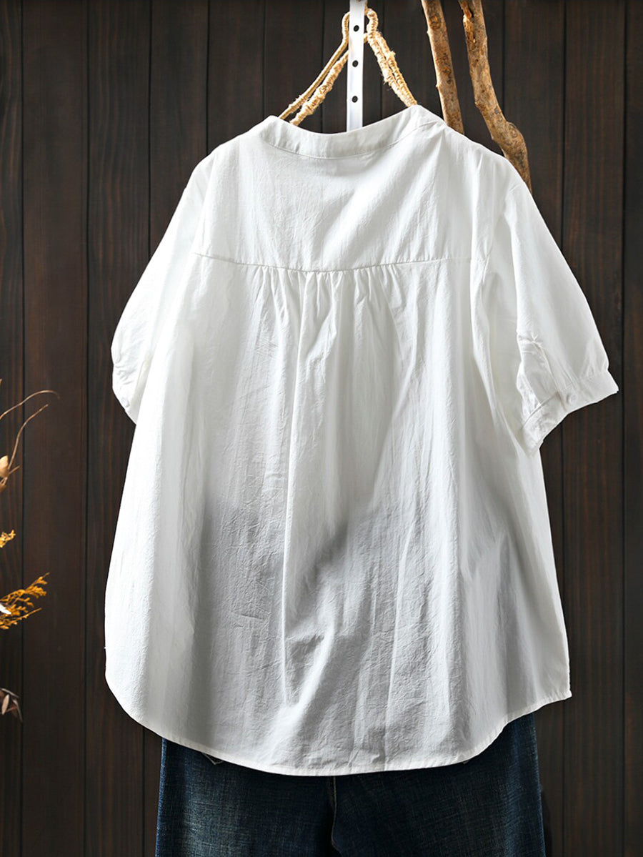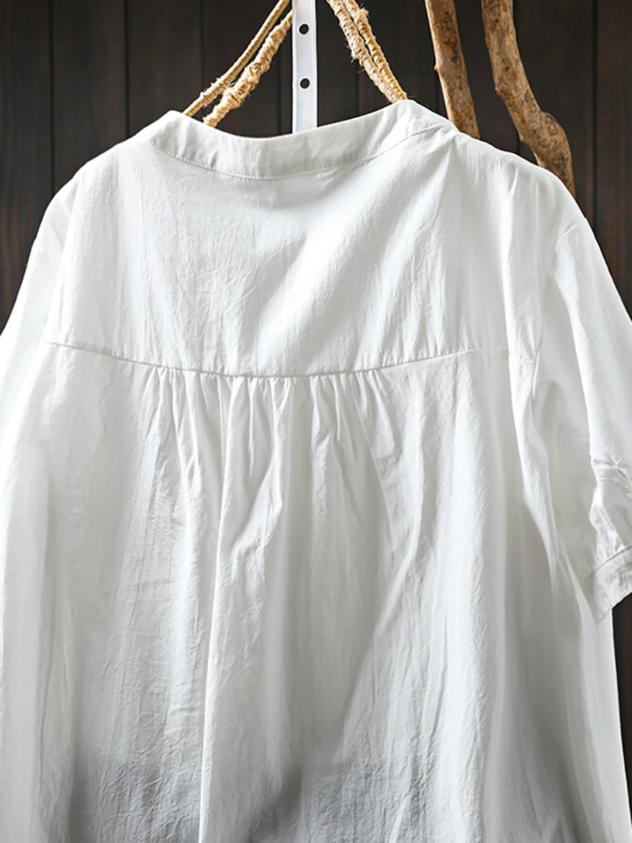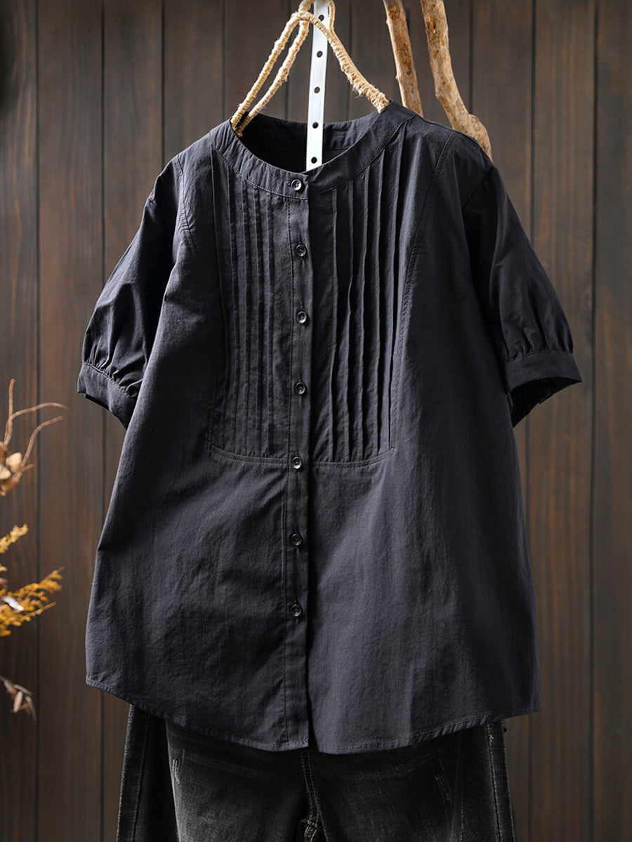 Women Summer Artsy Shirred O-Neck 100%Cotton Shirt