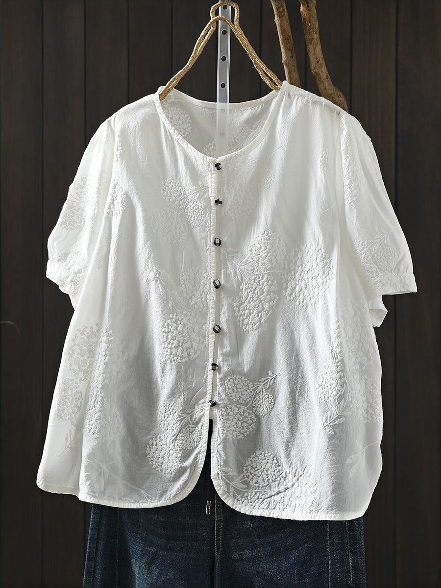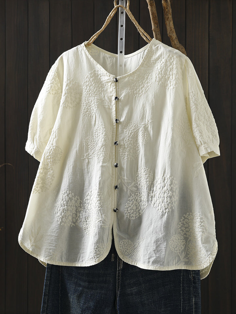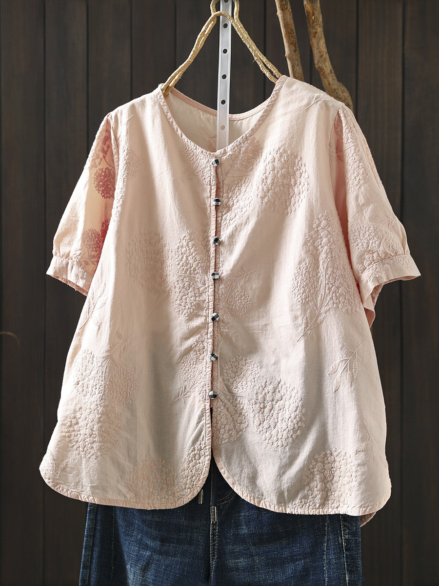 Women Summer Artsy Embroidery O-Neck 100%Cotton Blouse