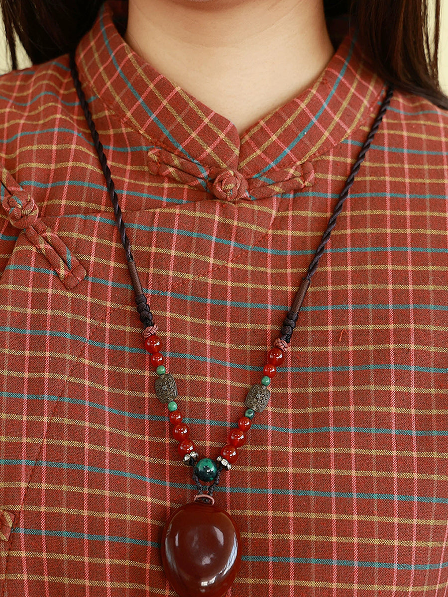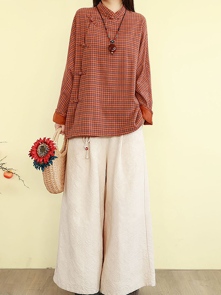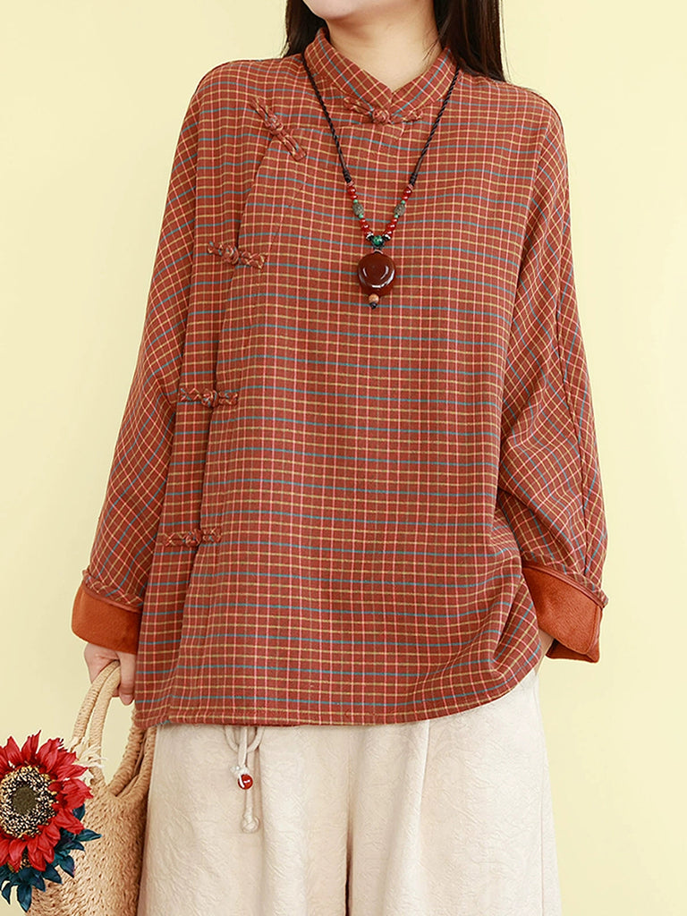 This winter essential combines traditional ethnic design with contemporary comfort. Crafted from a linen-cotton blend, the blouse features a distinctive stand collar and full-length raglan sleeves that provide both structure and ease of movement. The classic plaid pattern adds timeless appeal, while the thoughtfully designed silhouette works seamlessly across autumn and winter seasons. Perfect for layering or wearing as a standalone piece, this blouse bridges cultural aesthetics with practical everyday wear.