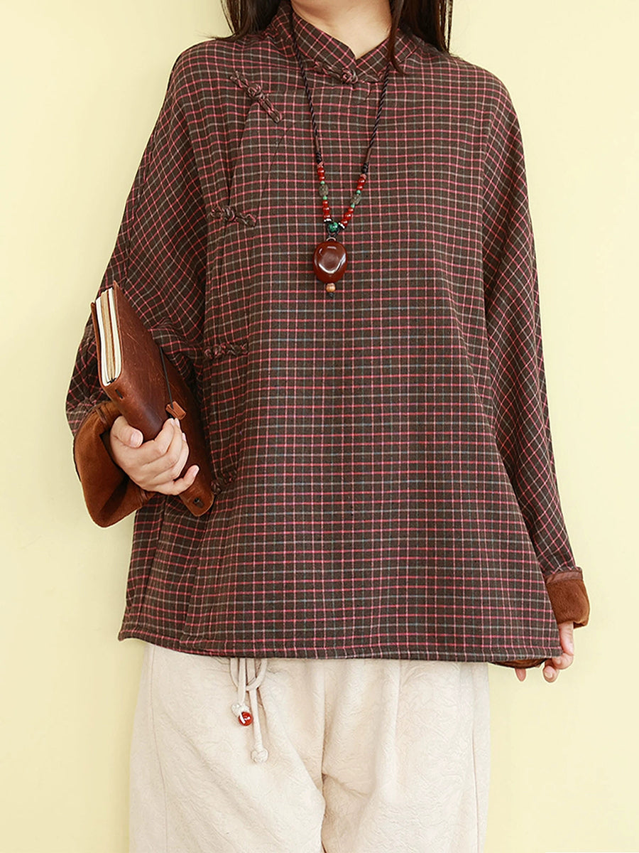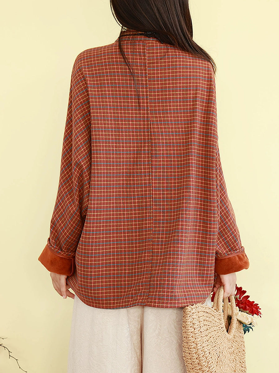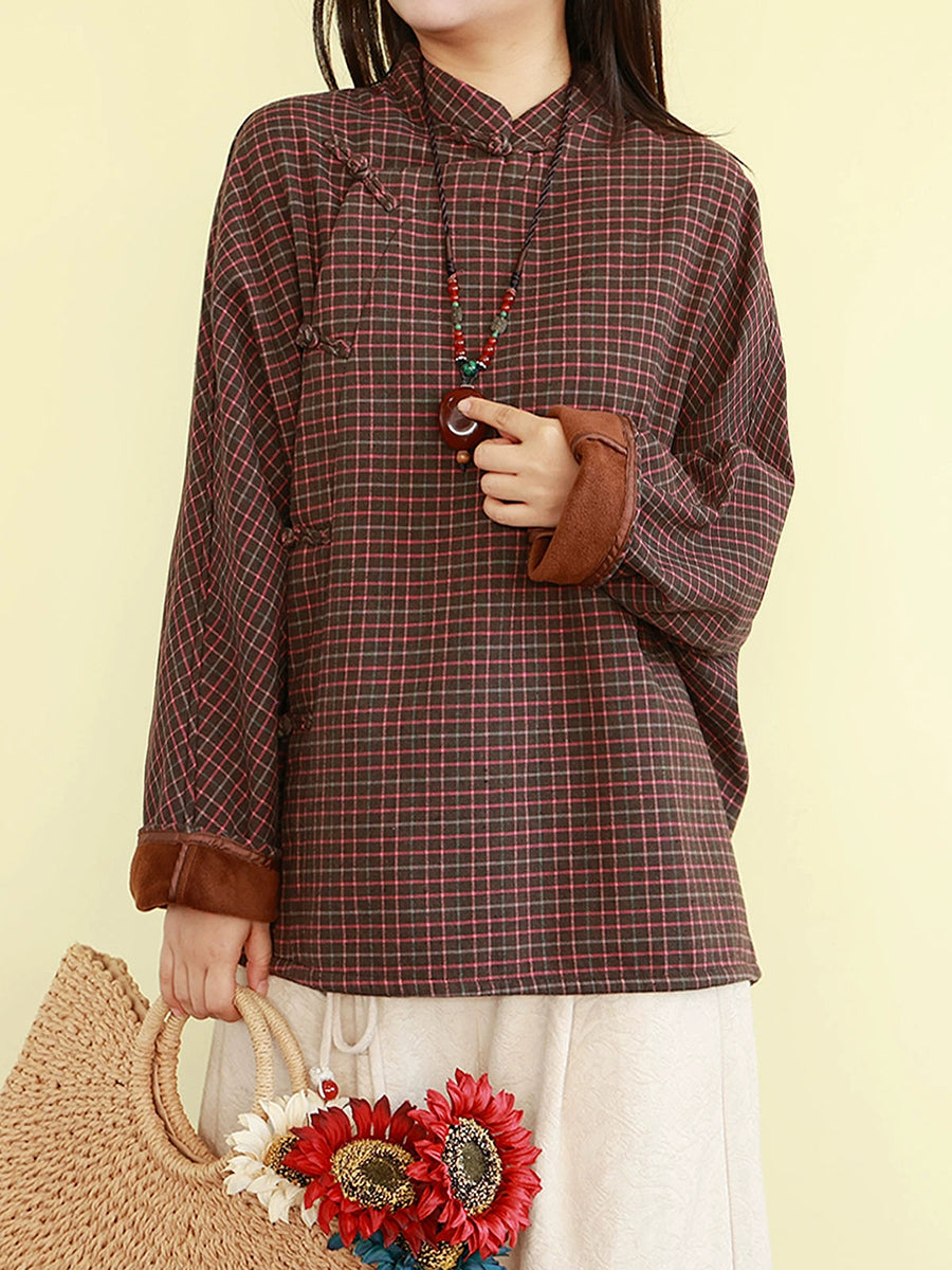 Women Winter Ethnic Plaid Stand Collar Fleece-lined Blouse