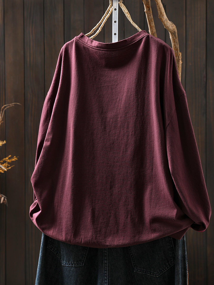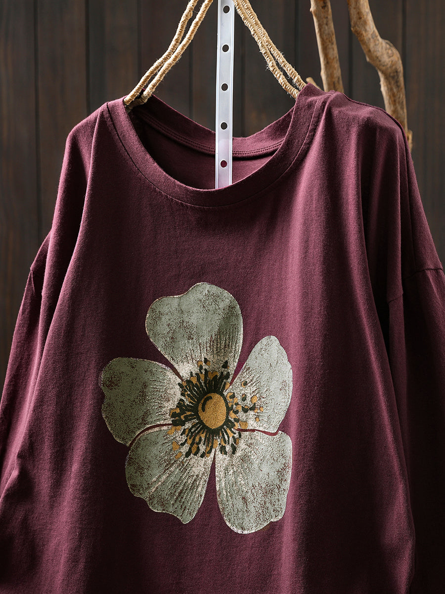 Plus Size Women Autumn Artsy Flower O-Neck Cotton Blouse