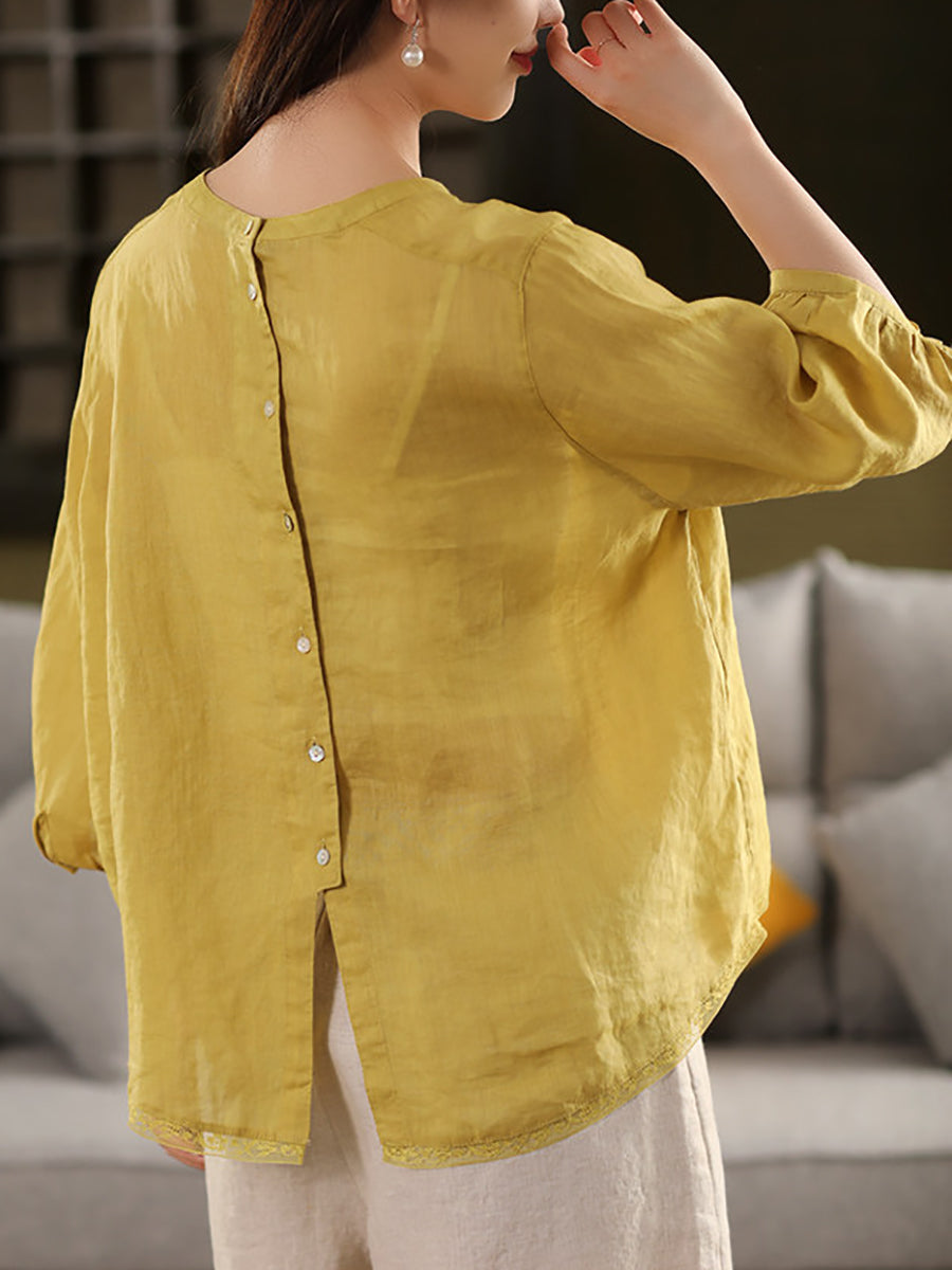 Women Summer Pure Color O-Neck 100%Ramie Blouse