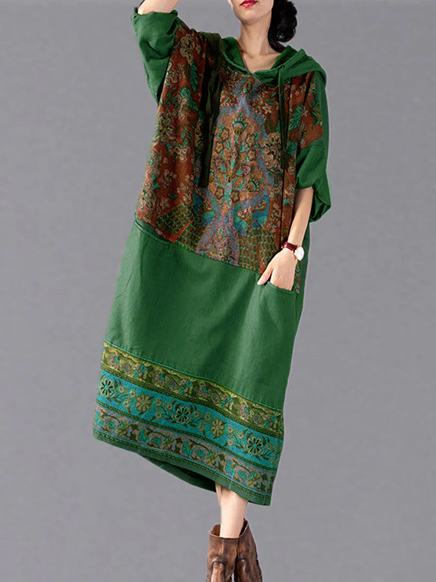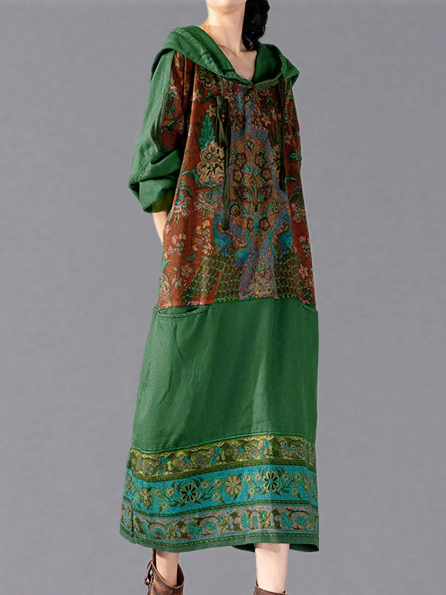 Plus Size Women Ethnic Flower Spliced Long Pocket Hooded Dress