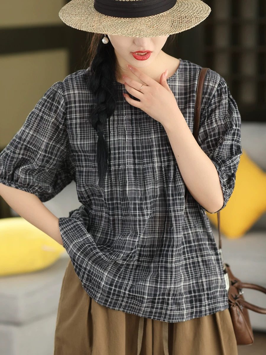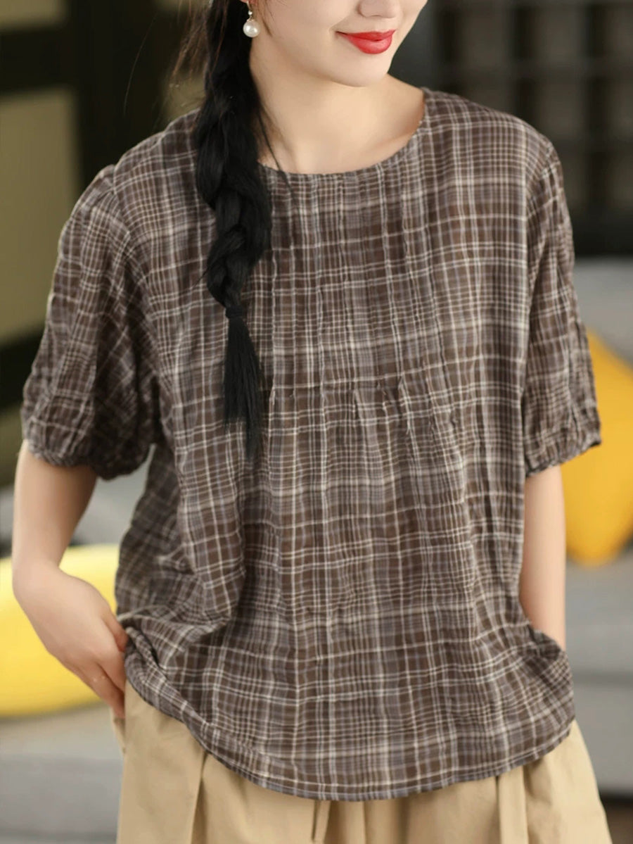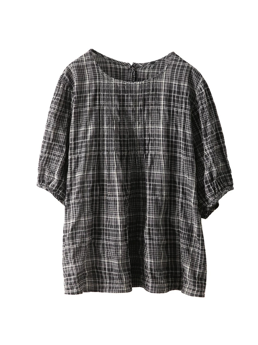 Women Summer Artsy Plaid 100%Cotton O-Neck Blouse