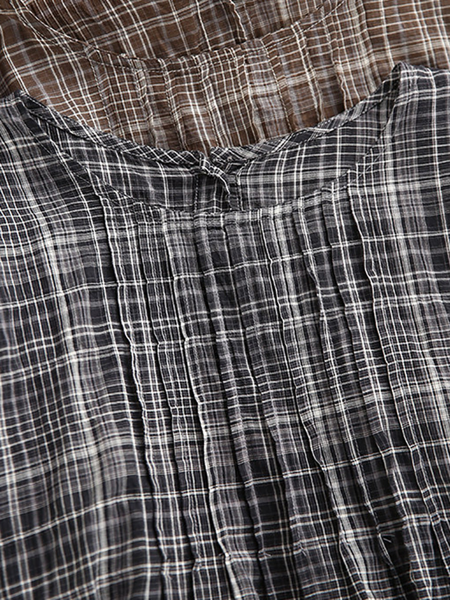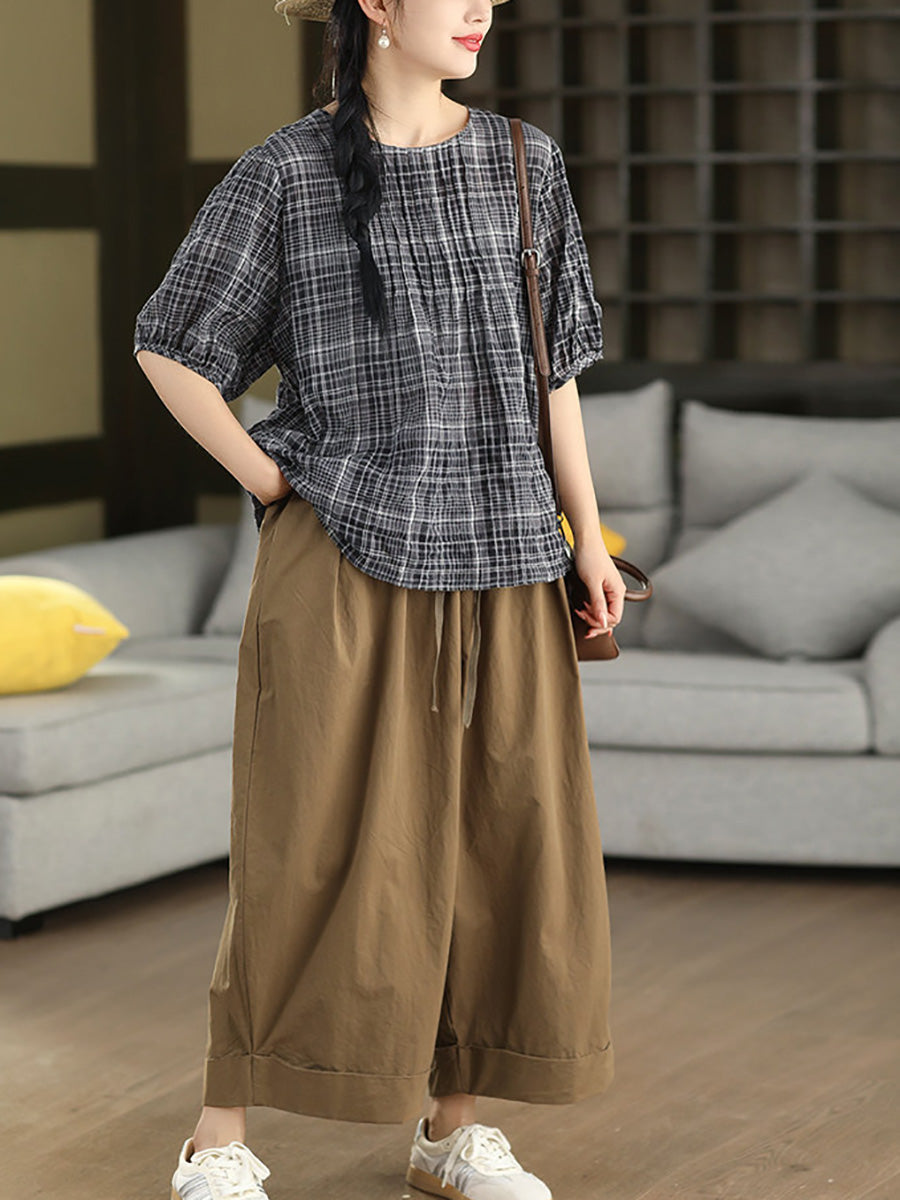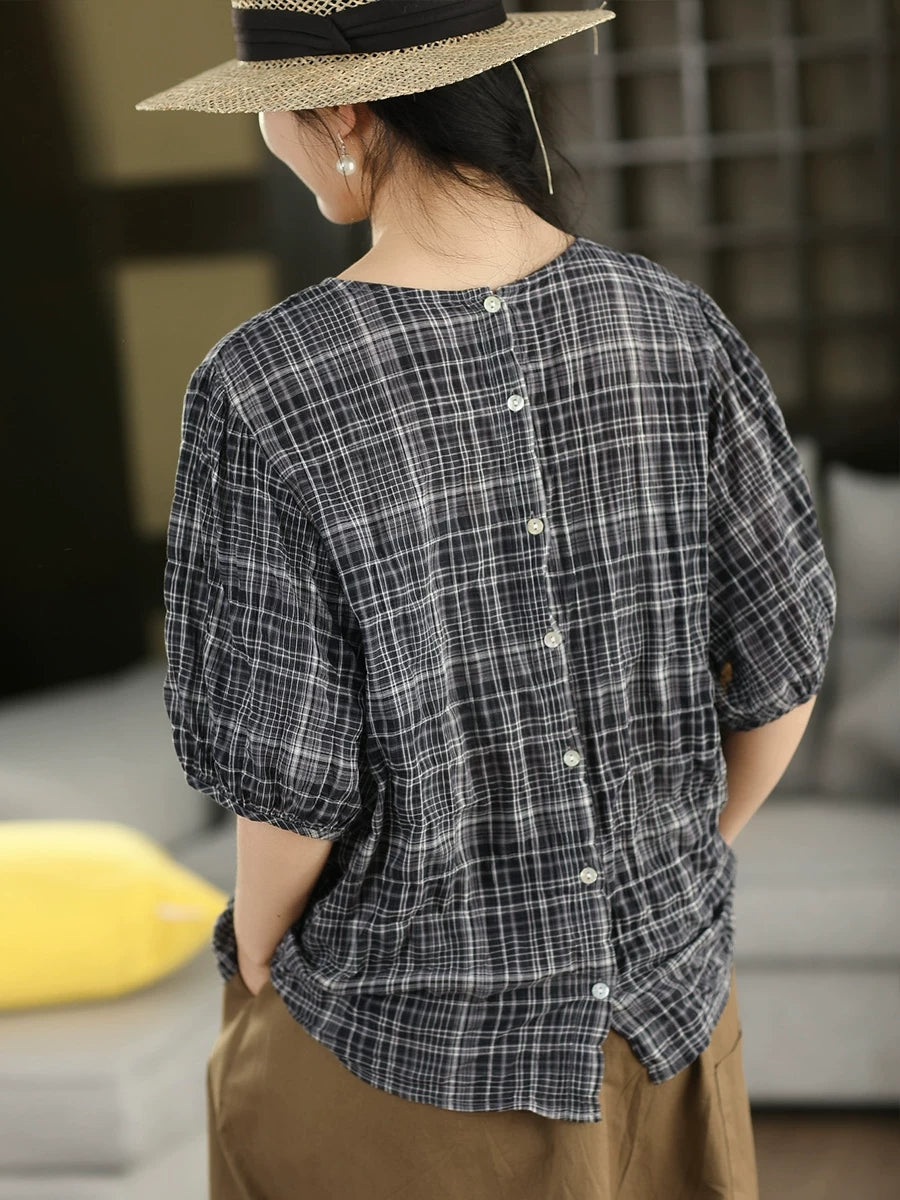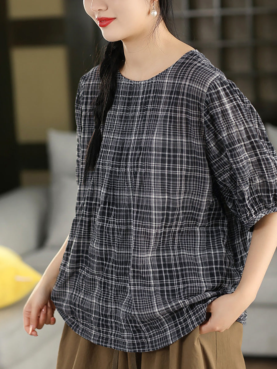 Women Summer Artsy Plaid 100%Cotton O-Neck Blouse