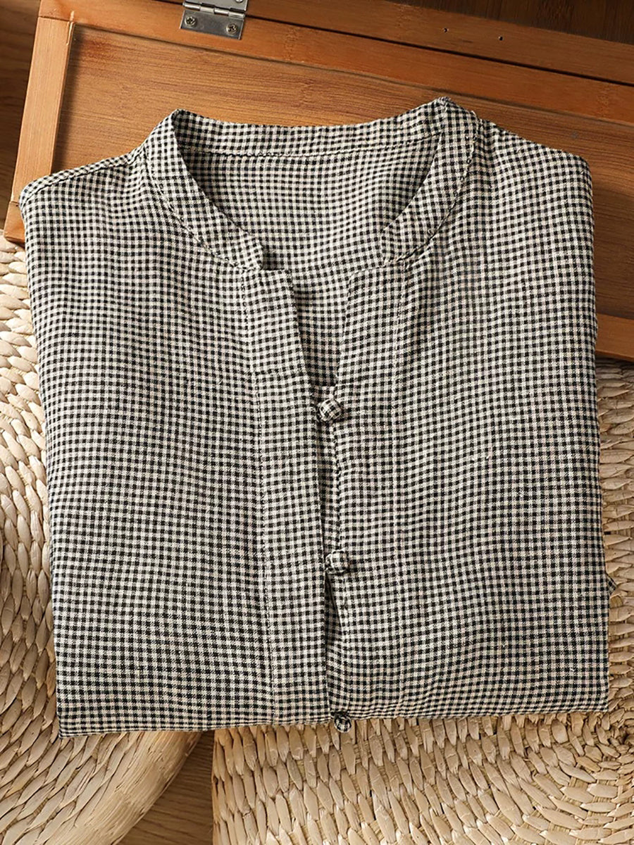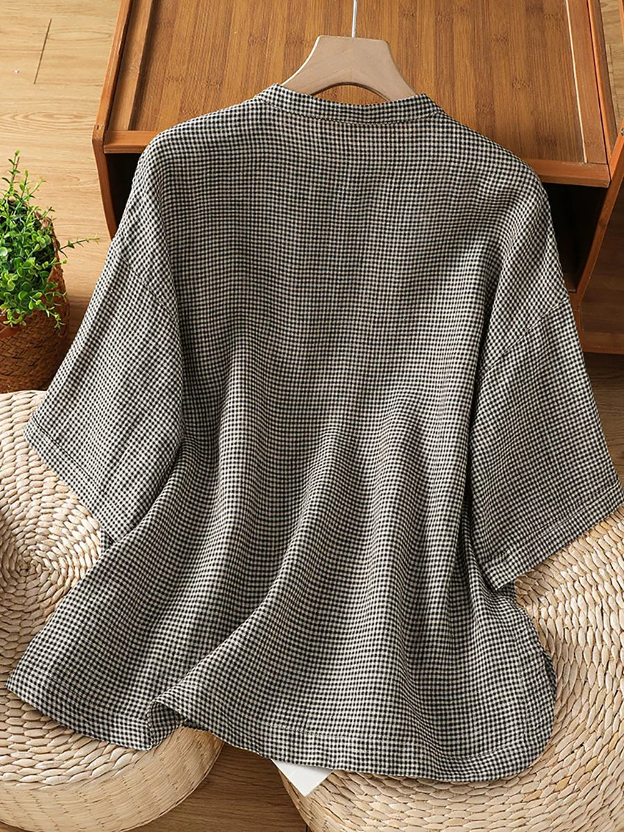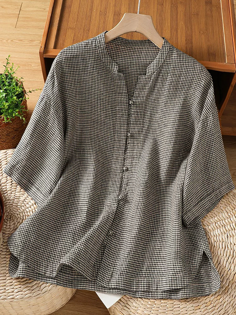 Plus Size Women Summer Retro Lattice Stand Collar Blouse