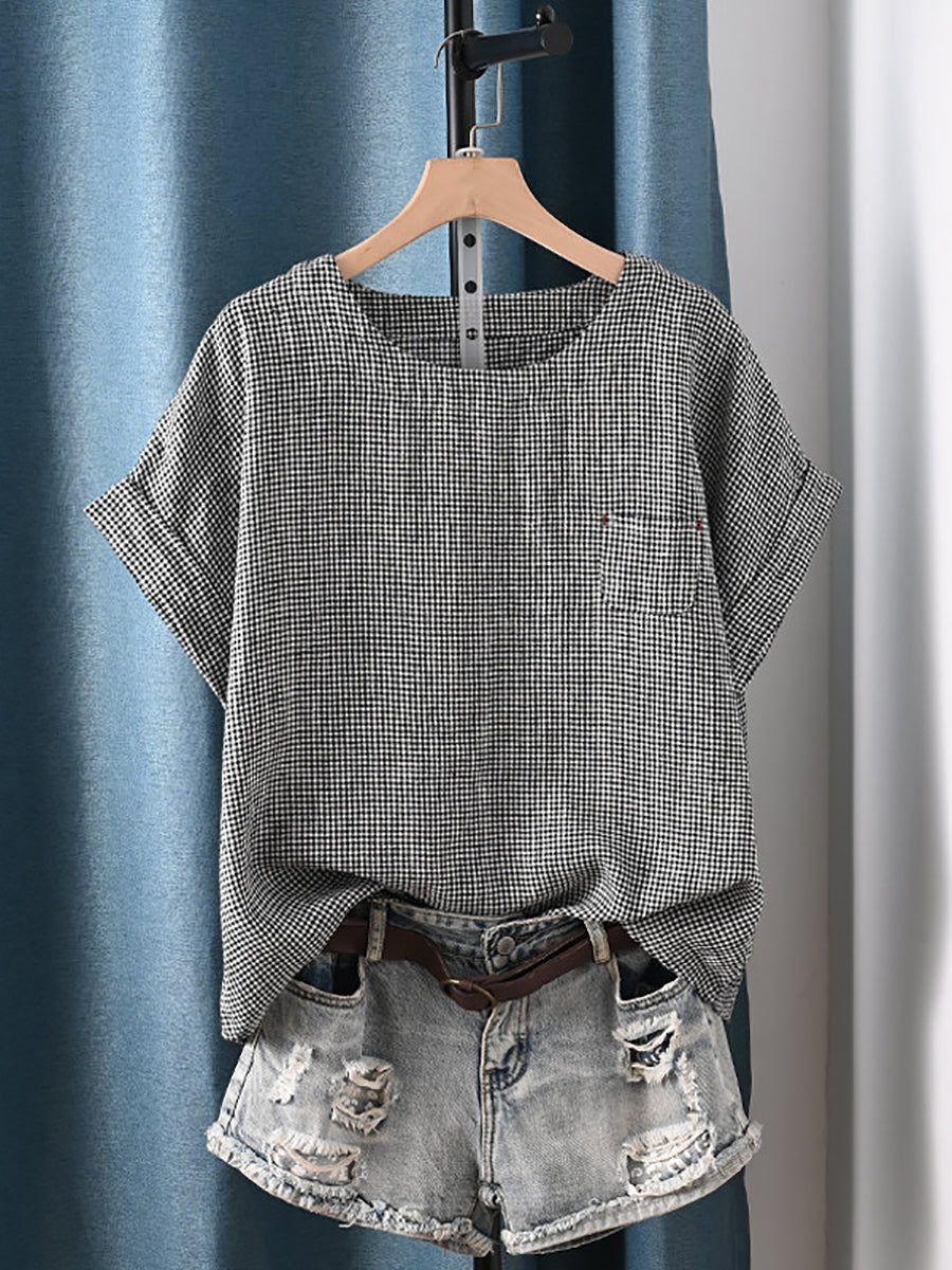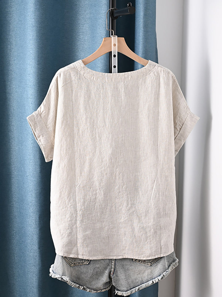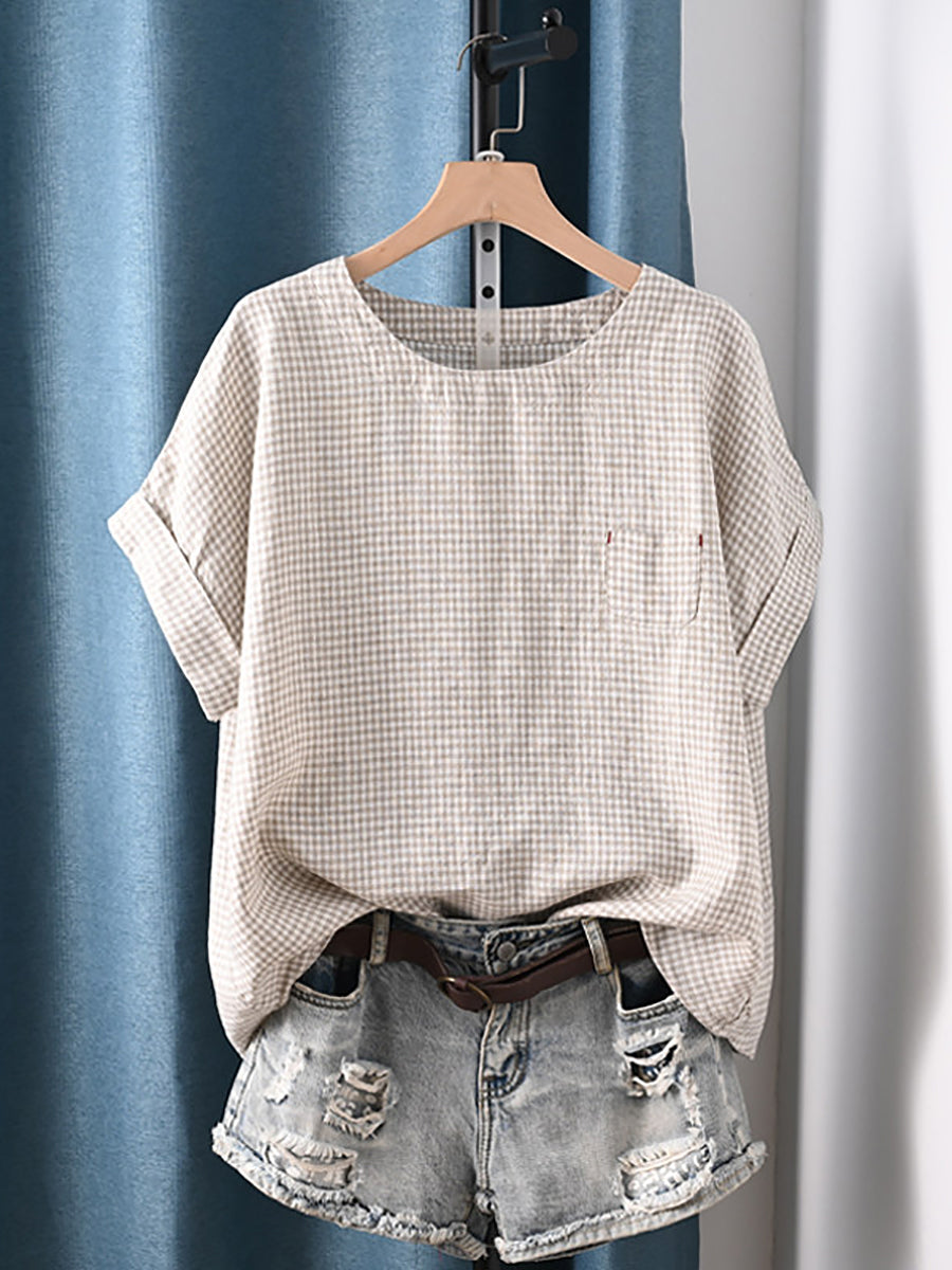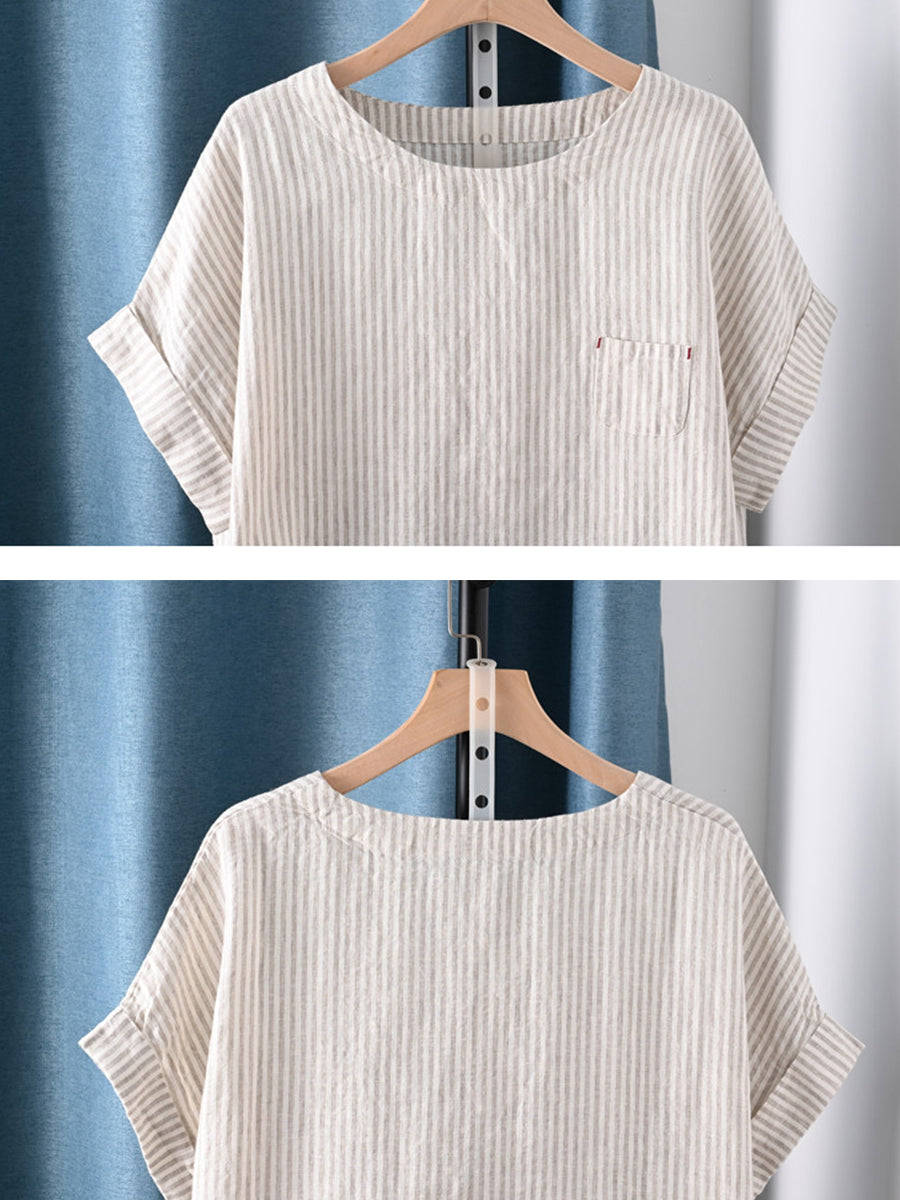 Plus Size Women Summer Artsy Stripe O-Neck 100%Cotton Blouse
